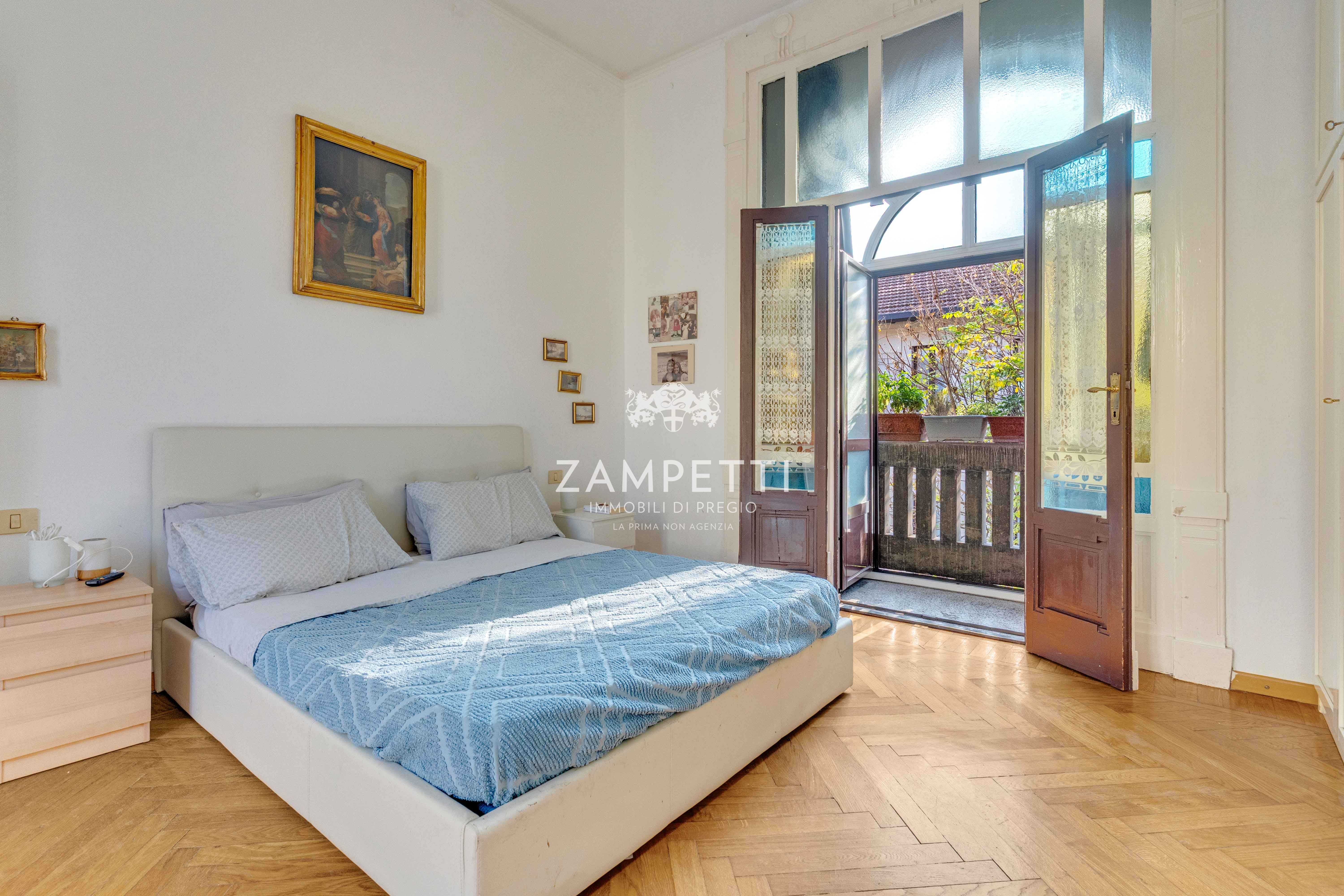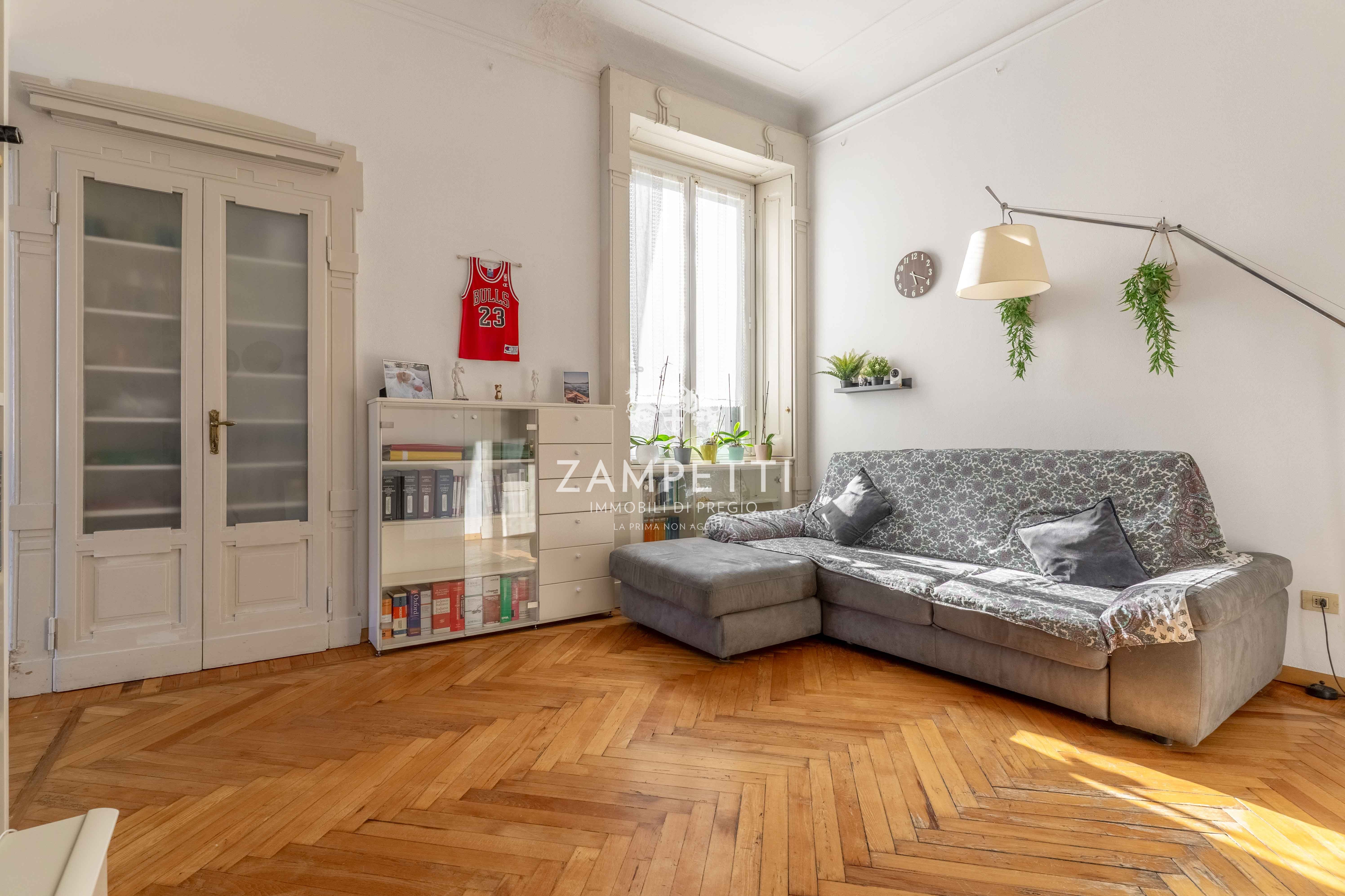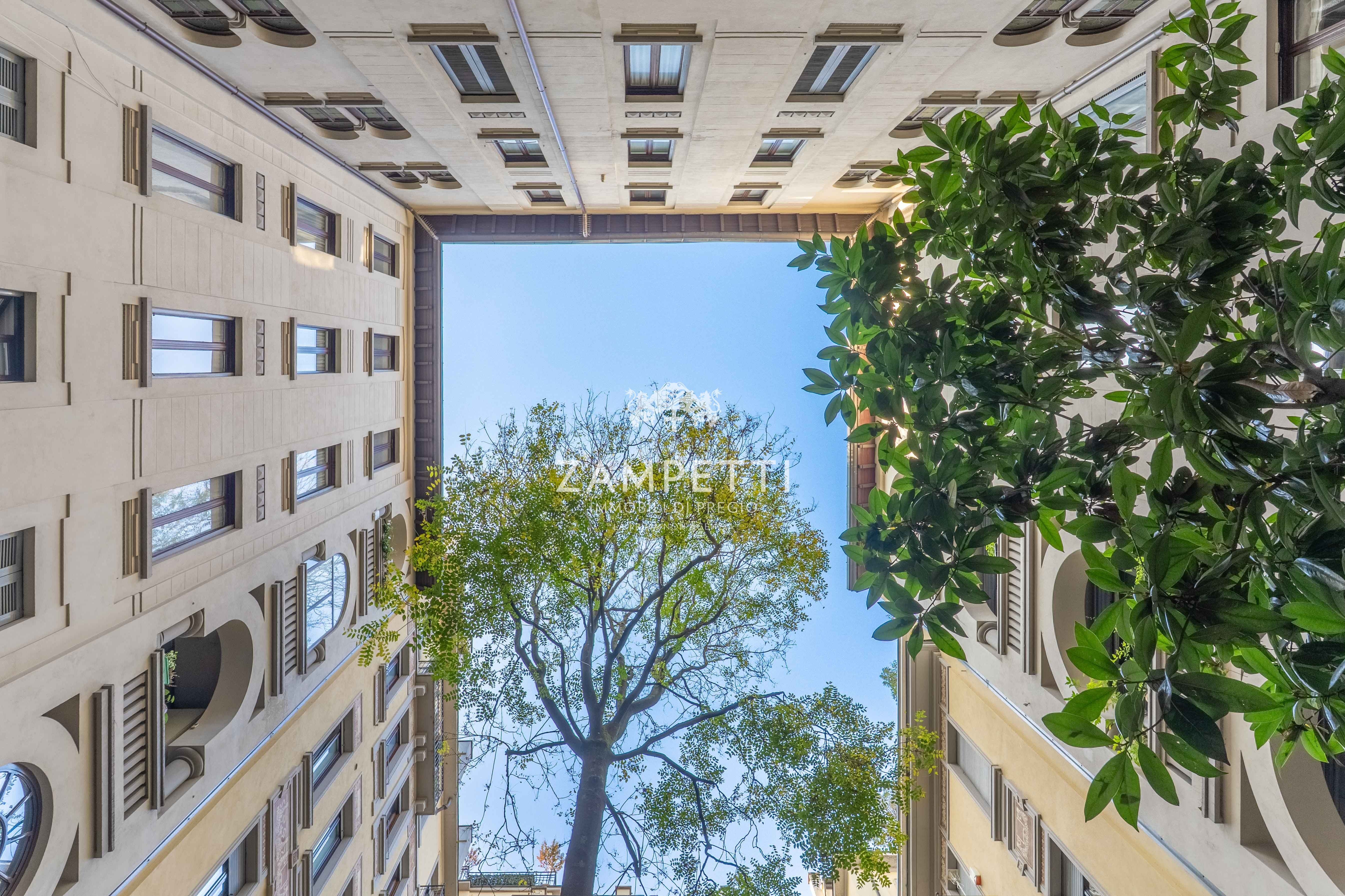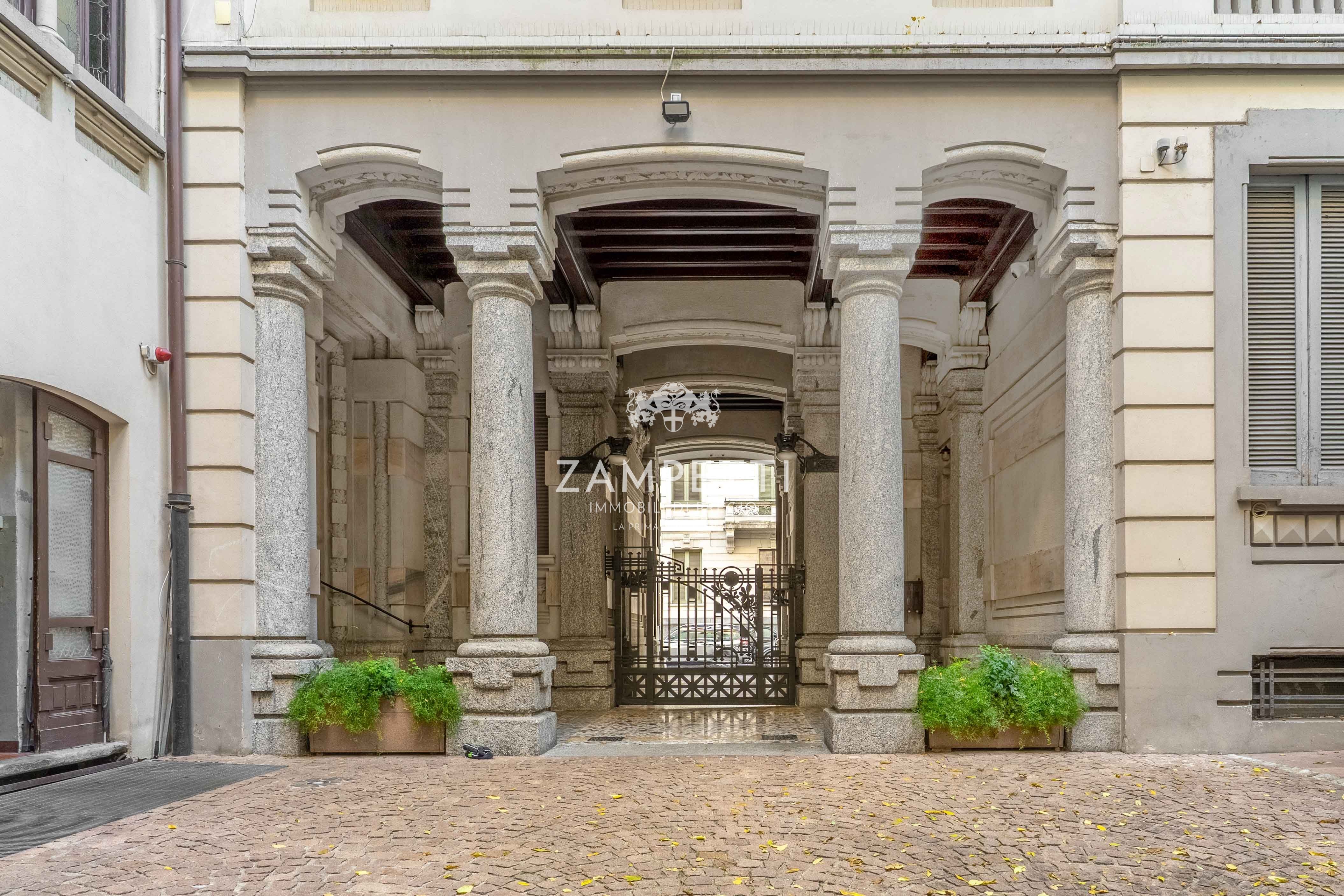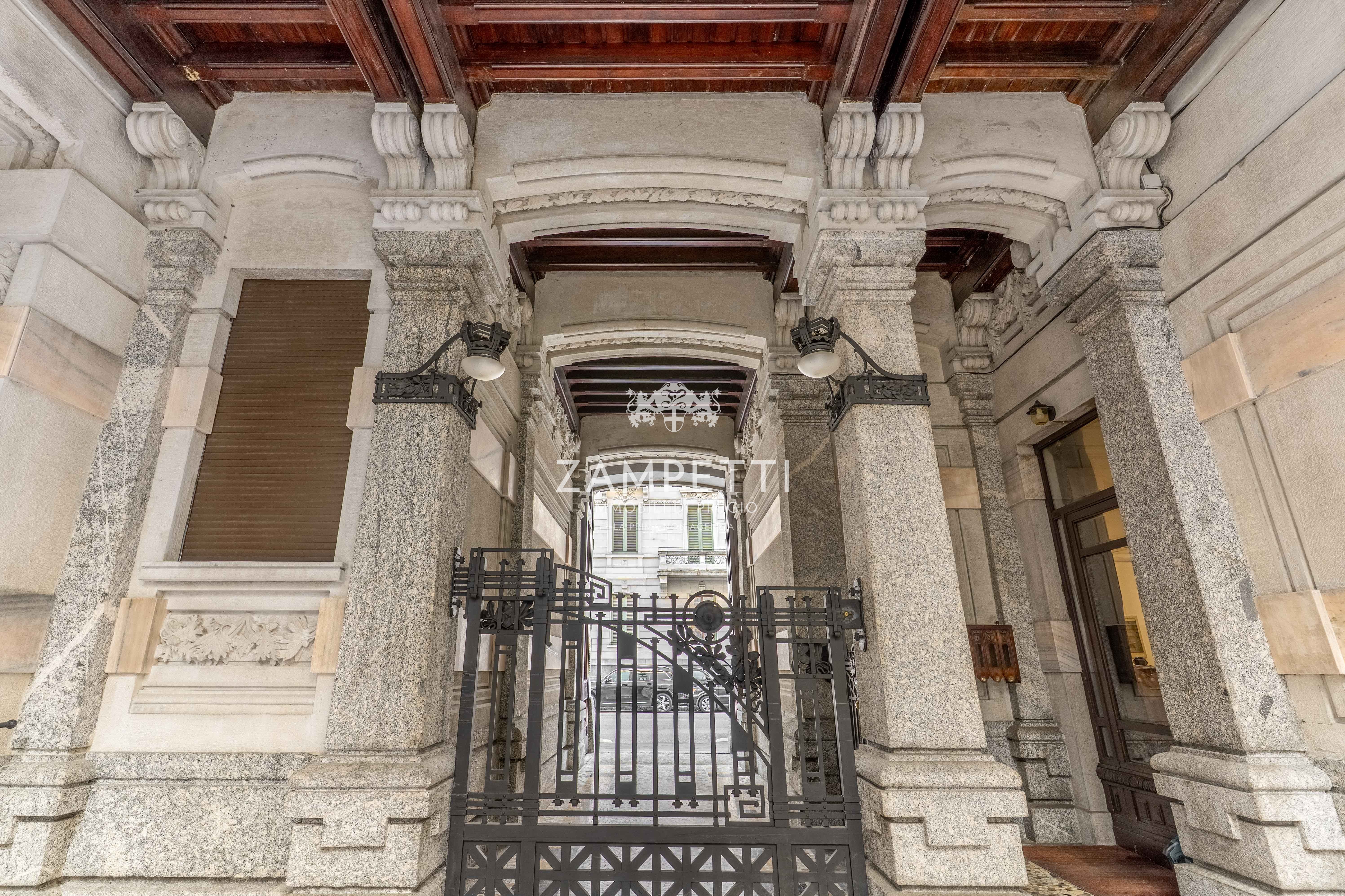 In a splendid palace from the early 1900s, Zampetti Immobili di Pregio exclusively offers a dwelling of rare quiet and charm, located inside the courtyard and set on the fourth floor.The multiple and bright overlooks give a pleasant feeling of privacy and silence. The high ceilings with elegant stucco and parquet floors preserve the authentic character of the period, while the original doors with convex glass and the period fireplace in the kitchen testify to the craftsmanship and refined atmosphere of the residence. The spaces, in need of revision, reveal extraordinary potential for those who wish to create a residence with a contemporary flavor without sacrificing historical charm. Currently, the floor plan of the house consists of a cozy entrance hall, a separate eat-in kitchen with original fireplace, two spacious bedrooms and a large windowed bathroom. A spacious cellar and an attic on the fifth floor, located exactly above the entrance to the house, complete the property. A unique solution, in one of the most prestigious and sought-after streets of Milan, where elegance and tranquility coexist in perfect balance.