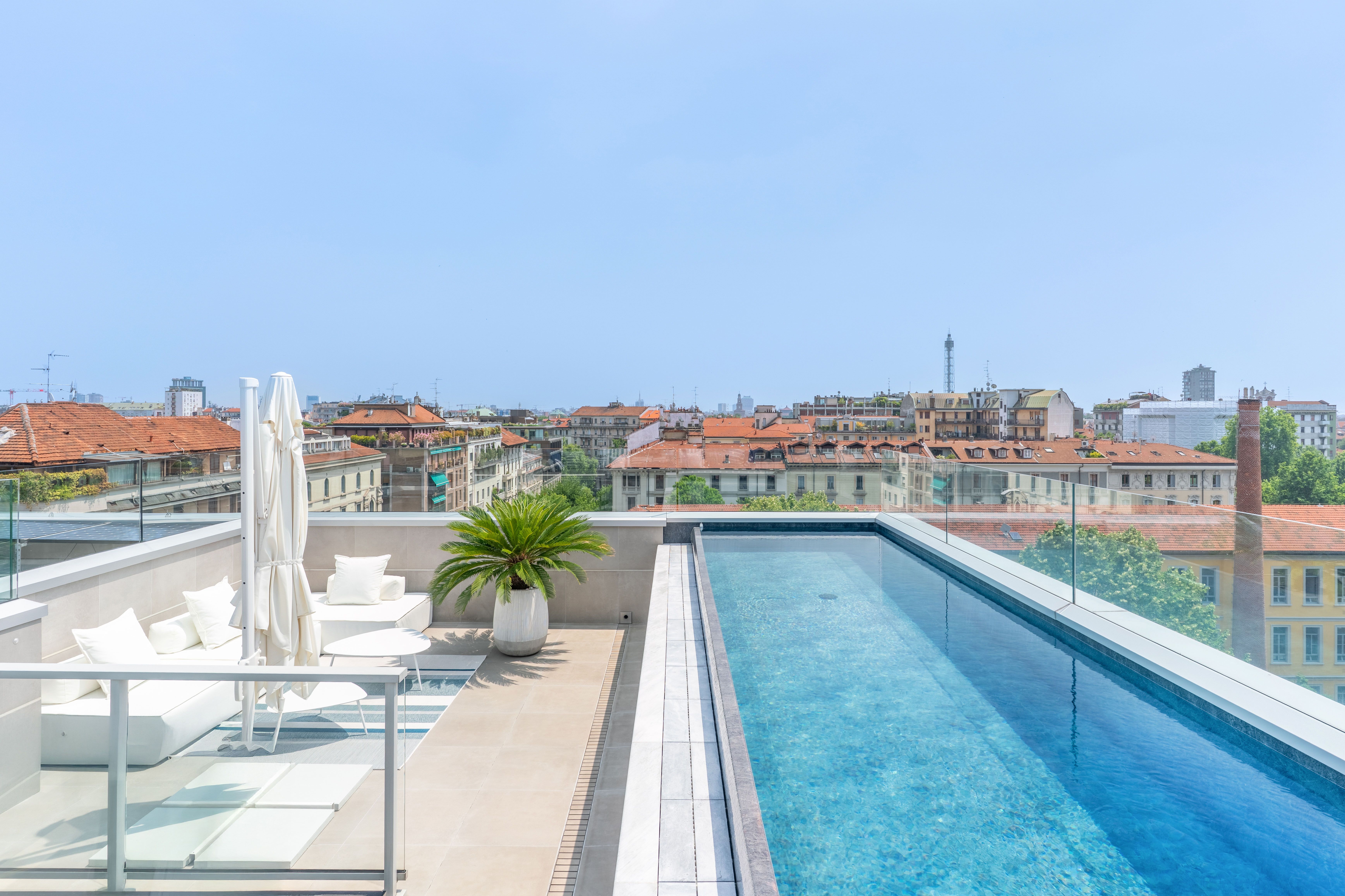 On the eighth floor, a 360° panoramic rooftop terrace offers breathtaking views of Milan's historic center. The saltwater infinity pool features counter-current swimming and hydromassage, clad in Carrara marble handcrafted by Modulartem, a leader in luxury finishes. The solarium and outdoor shower area are enhanced by bespoke artisanal furnishings.