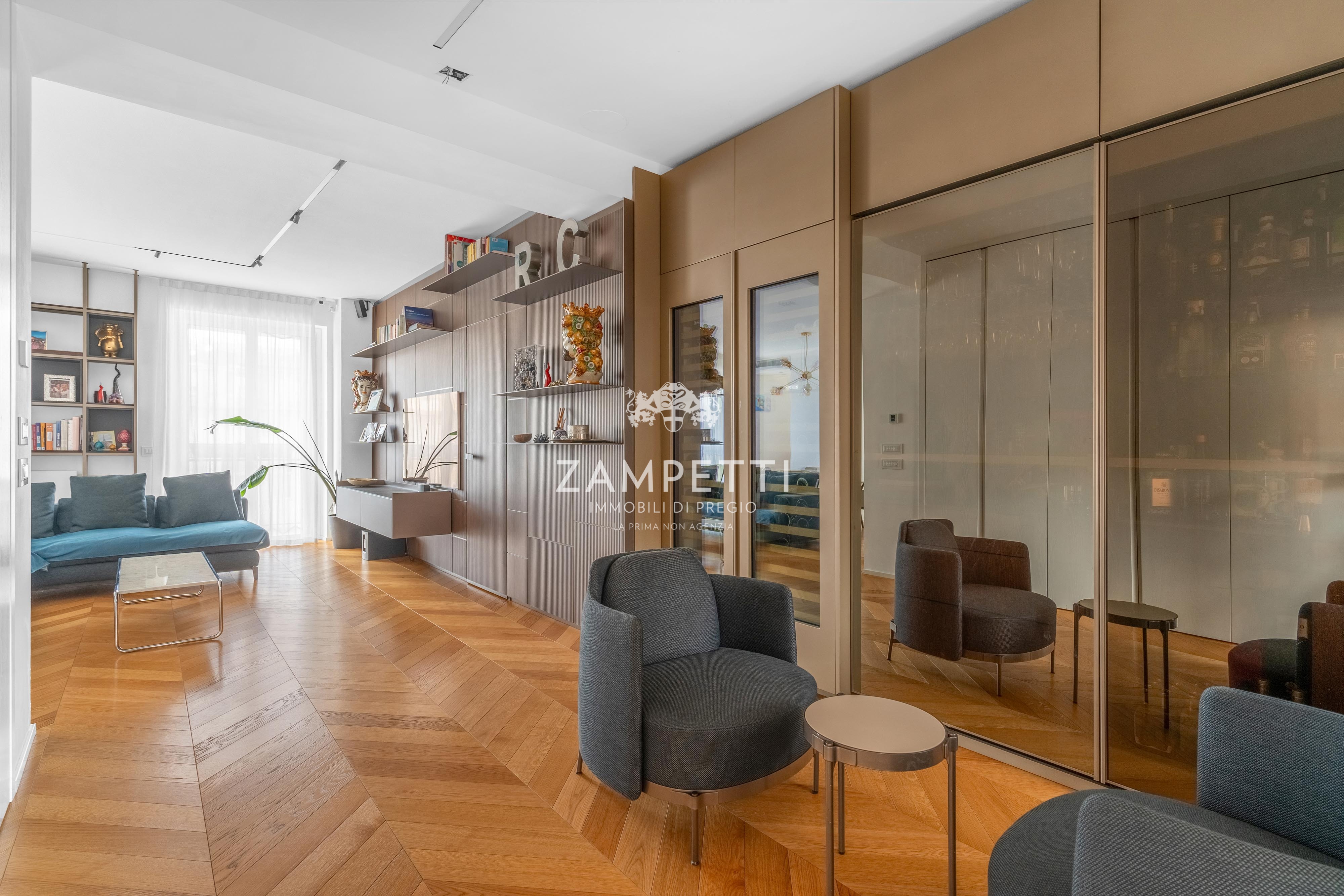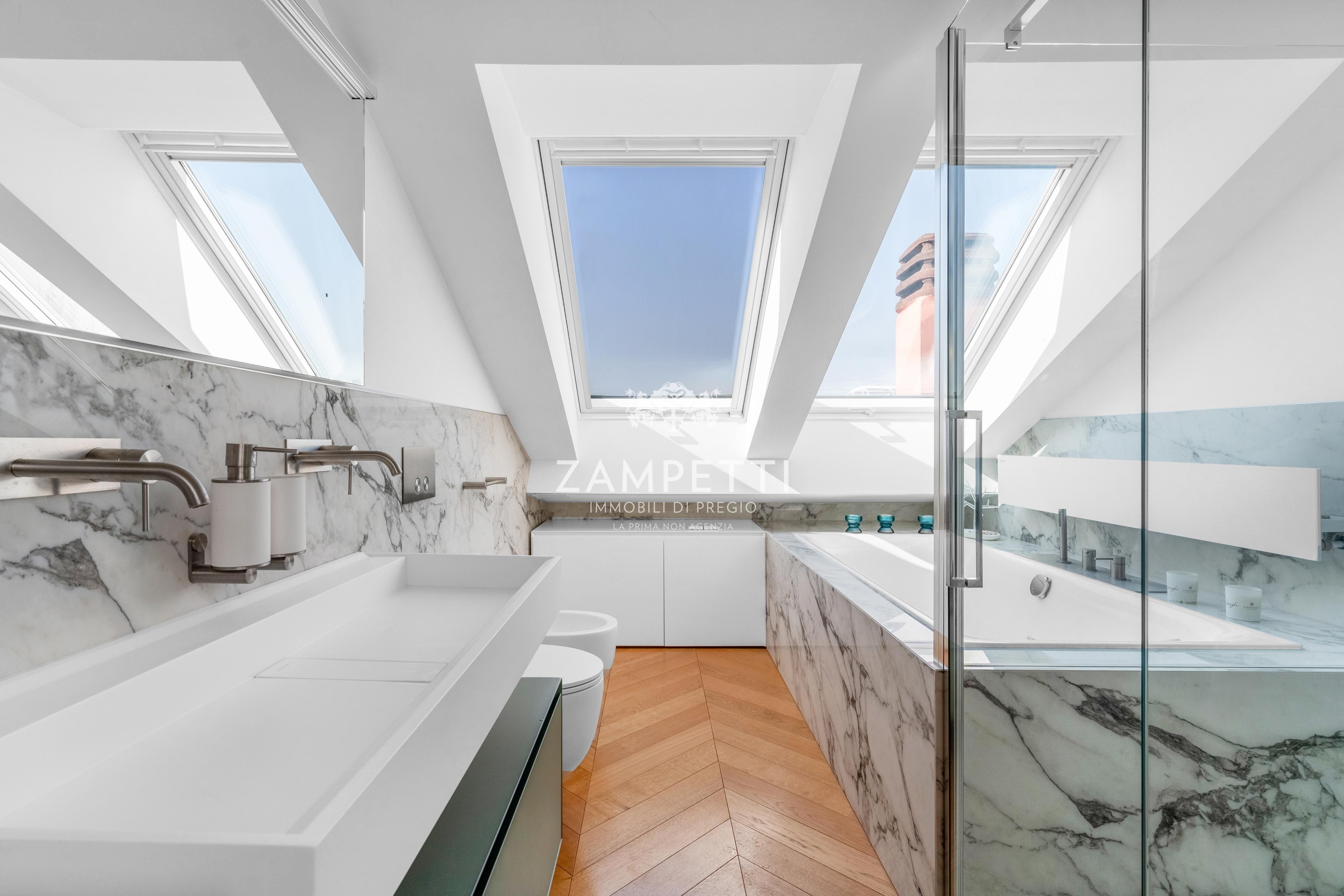 Una scala in legno accompagna al quinto piano in parte mansardato, dedicato alla zona notte, dove trovano spazio uno studio, un bagno, una camera singola e una master bedroom con bagno en suite completo di doccia e vasca, oltre ad una cabina armadio.