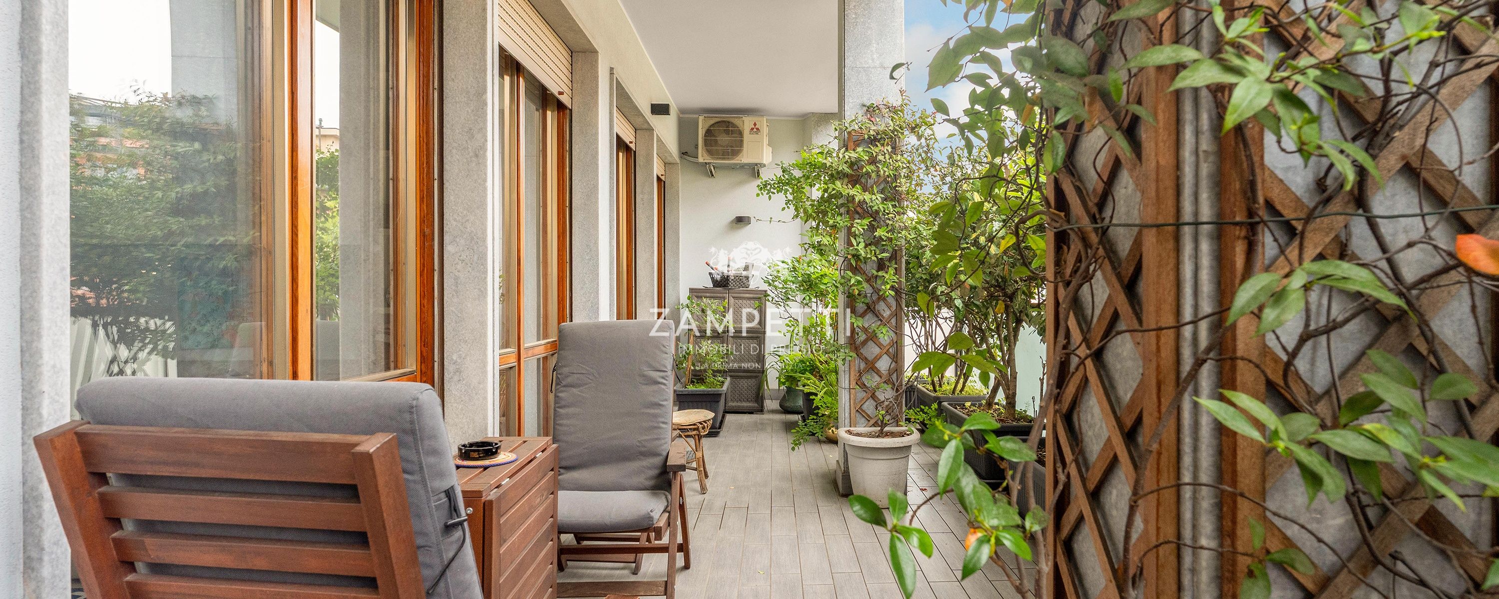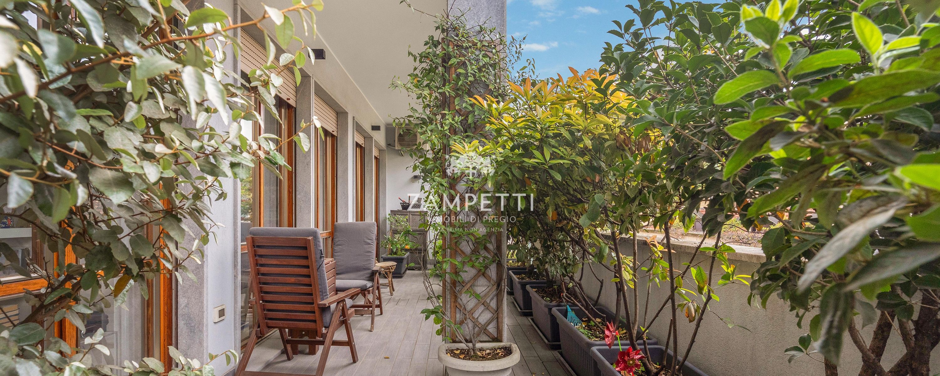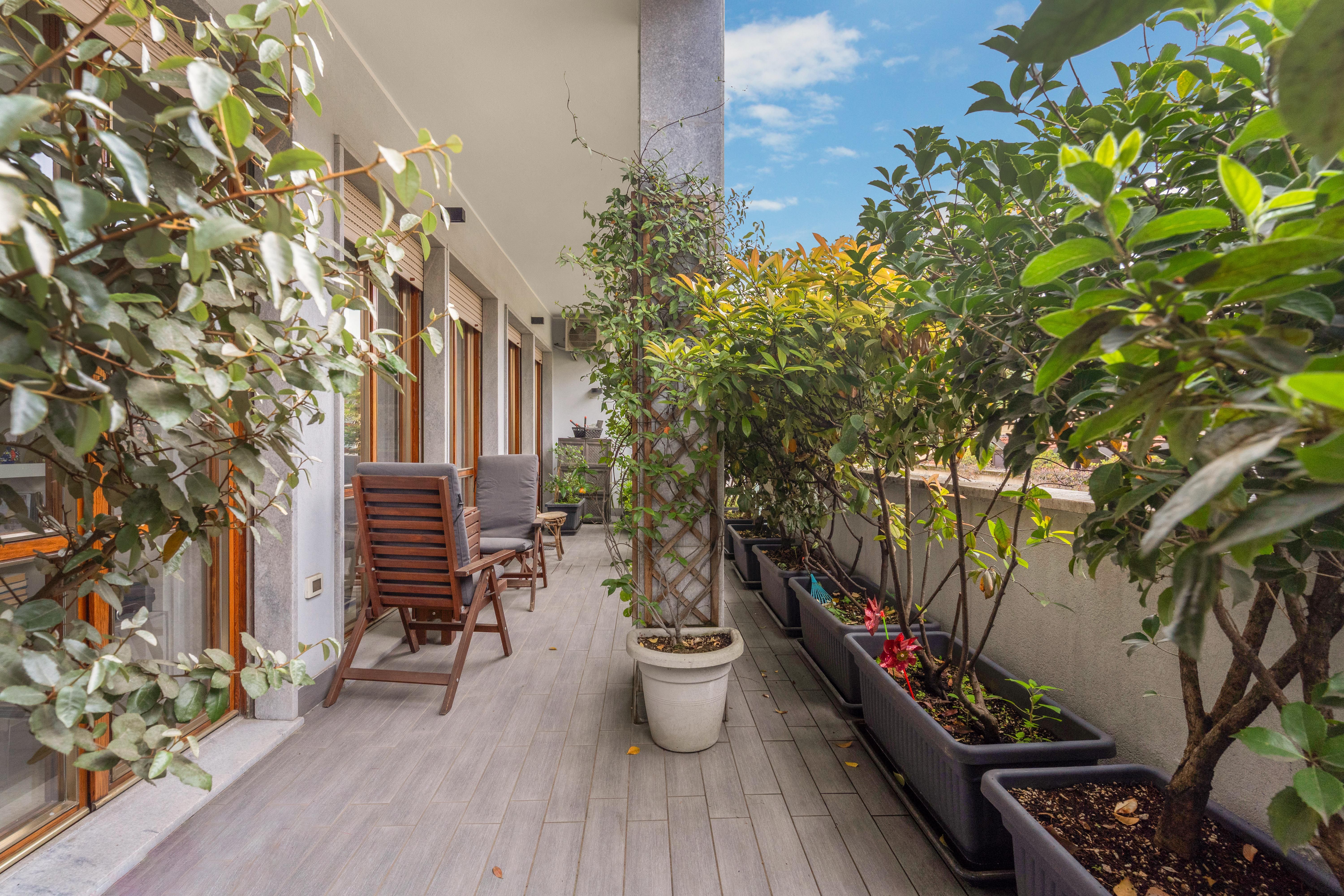 Affacciata su Via Parini, la zona giorno accoglie un ampio salone doppio che si apre su un terrazzo loggiato e piantumato, vero gioiello dell’appartamento, perfetto per momenti di relax o convivialità in un’atmosfera riservata e soleggiata. Completano questa parte della casa una cucina abitabile, uno studio, un bagno di servizio, guardaroba e lavanderia.