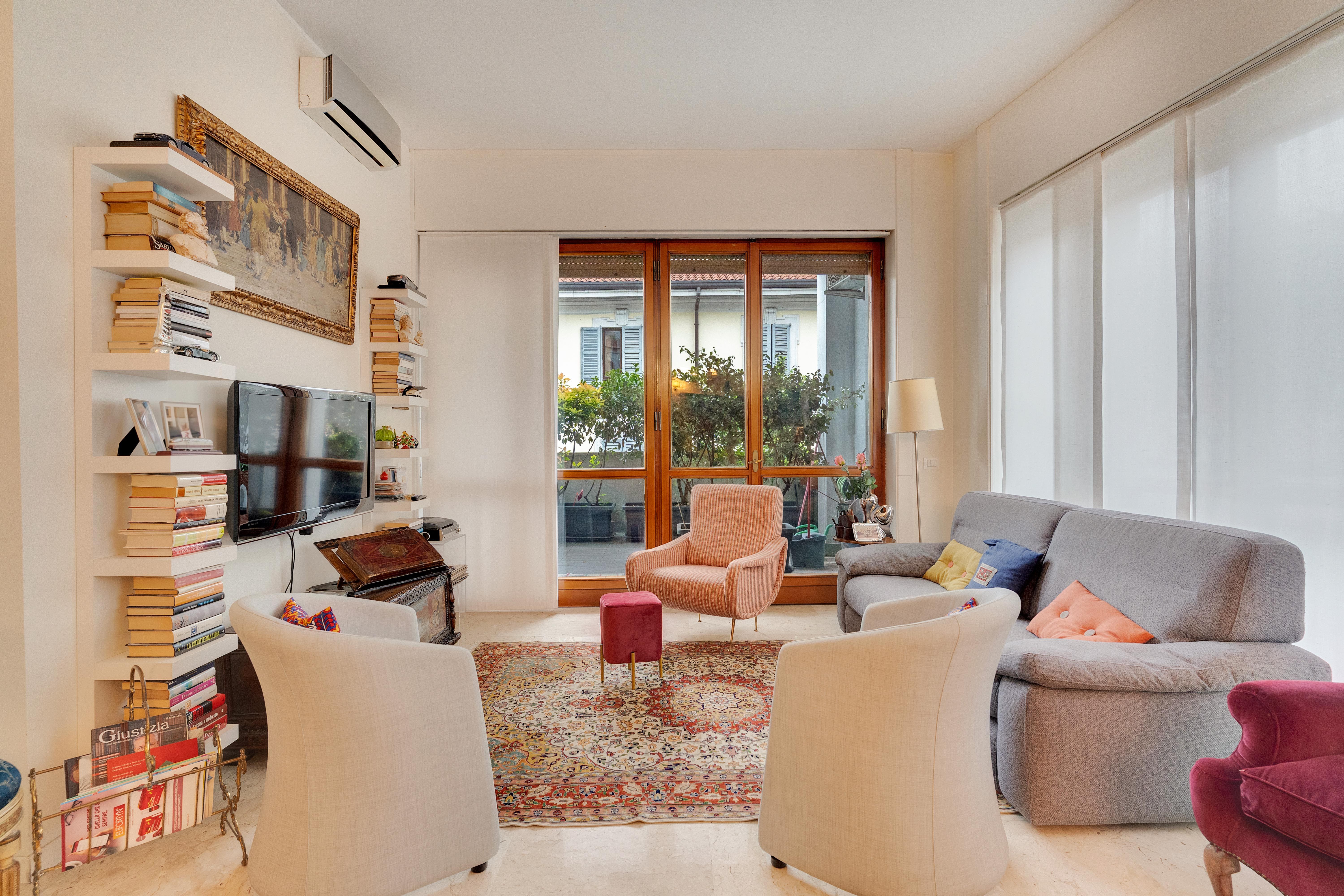 Nella parte più interna dell’abitazione, affacciata sul silenzioso cortile condominiale, si sviluppa una seconda zona living, perfetta come area relax o per accogliere ospiti, insieme ad altre due camere da letto e due bagni, offrendo così una distribuzione degli ambienti equilibrata e funzionale.