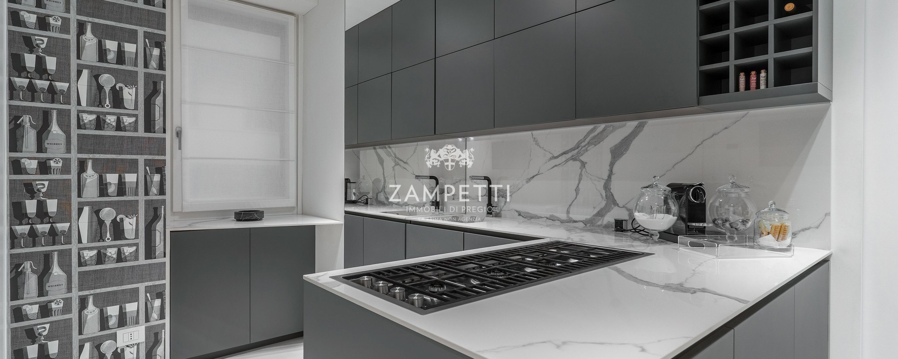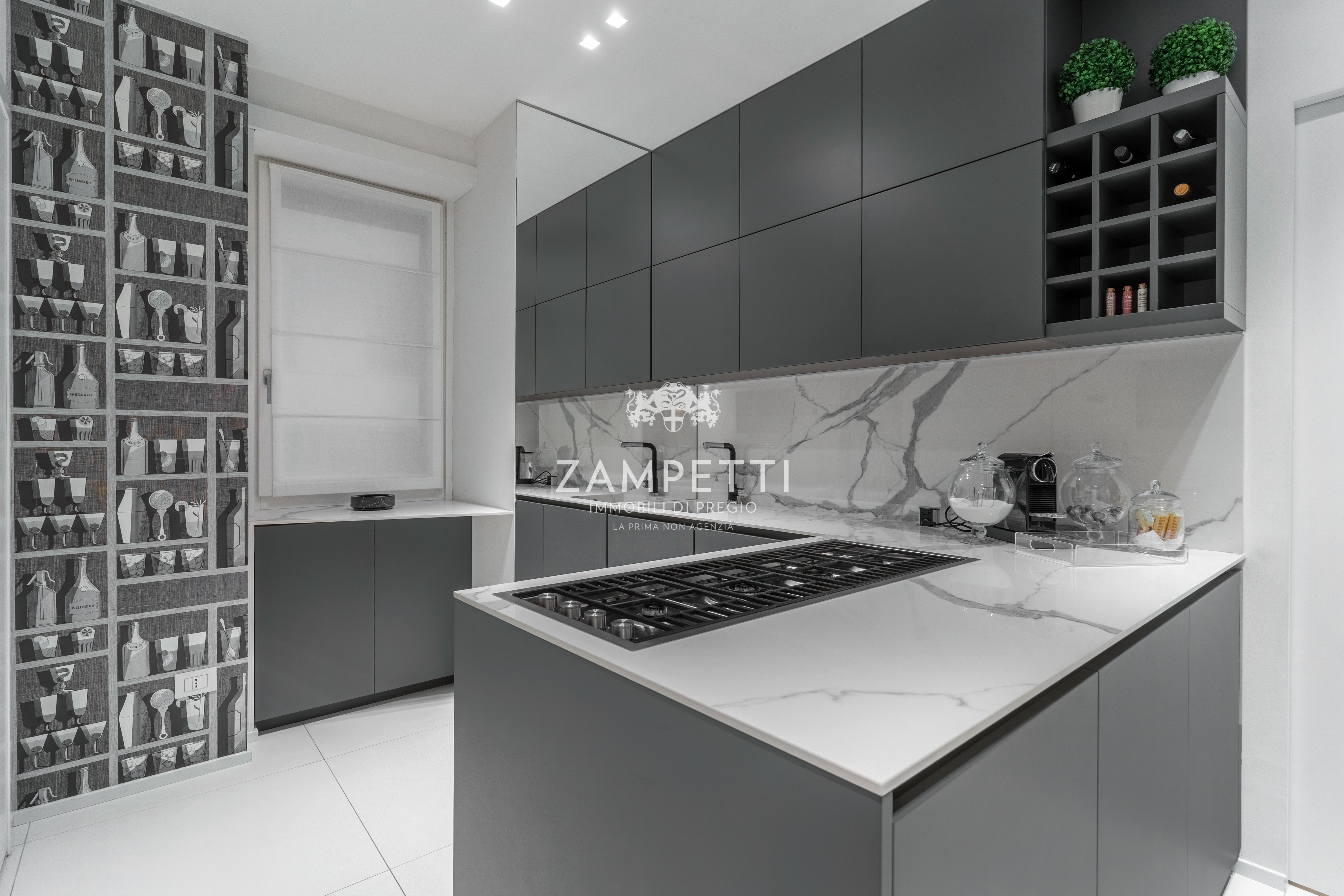 La cucina, in stile Fornasetti, ha elettrodomestici integrati, piani in marmo e un secondo ingresso dedicato ai fornitori e allo staff.