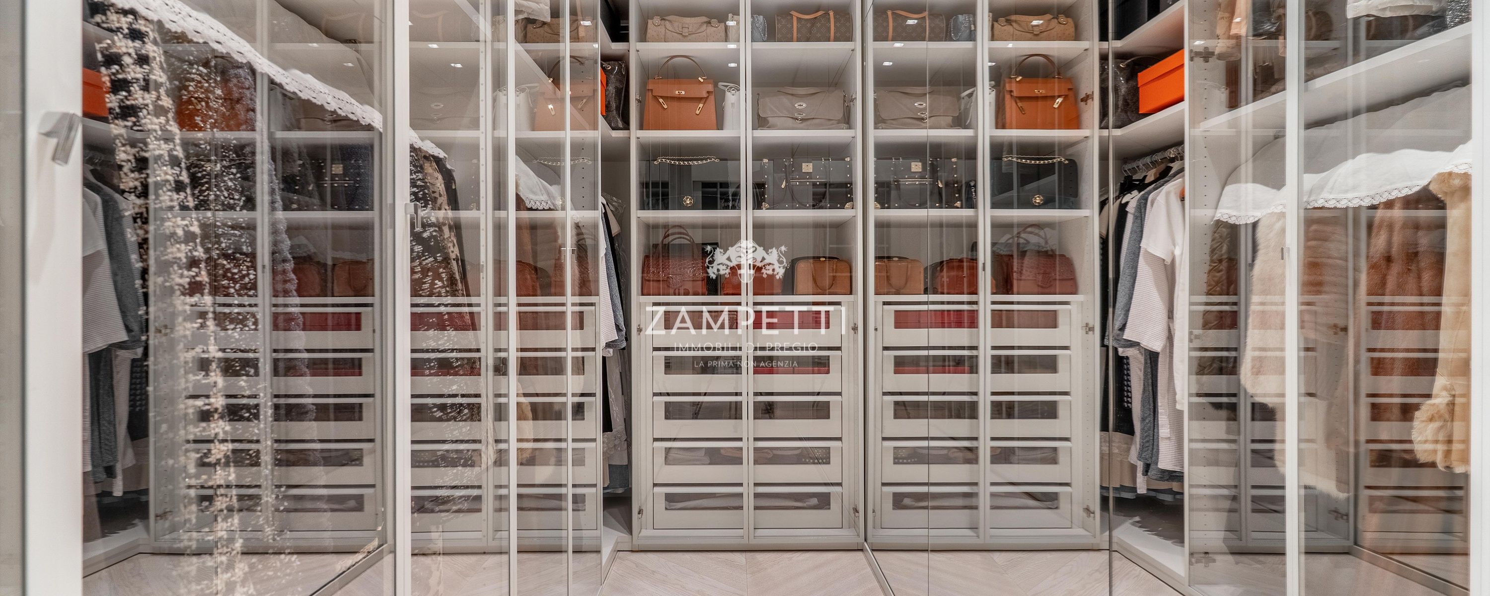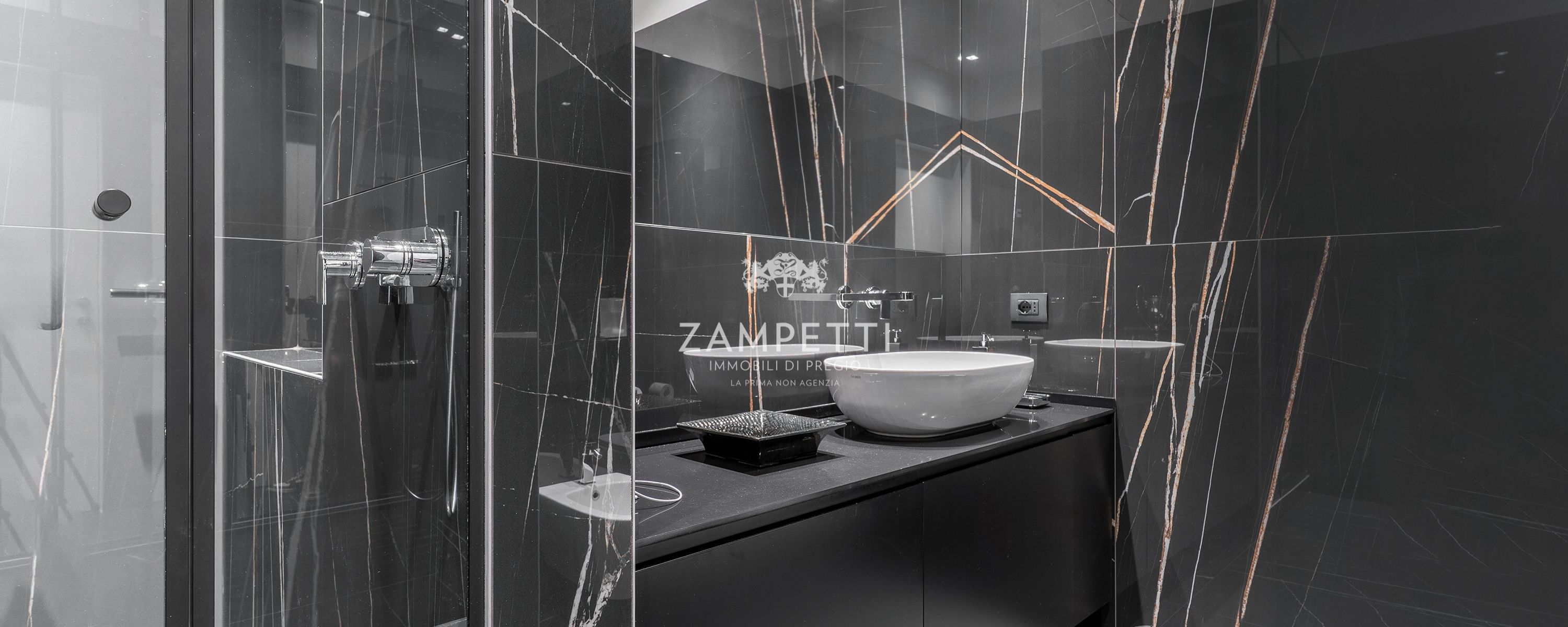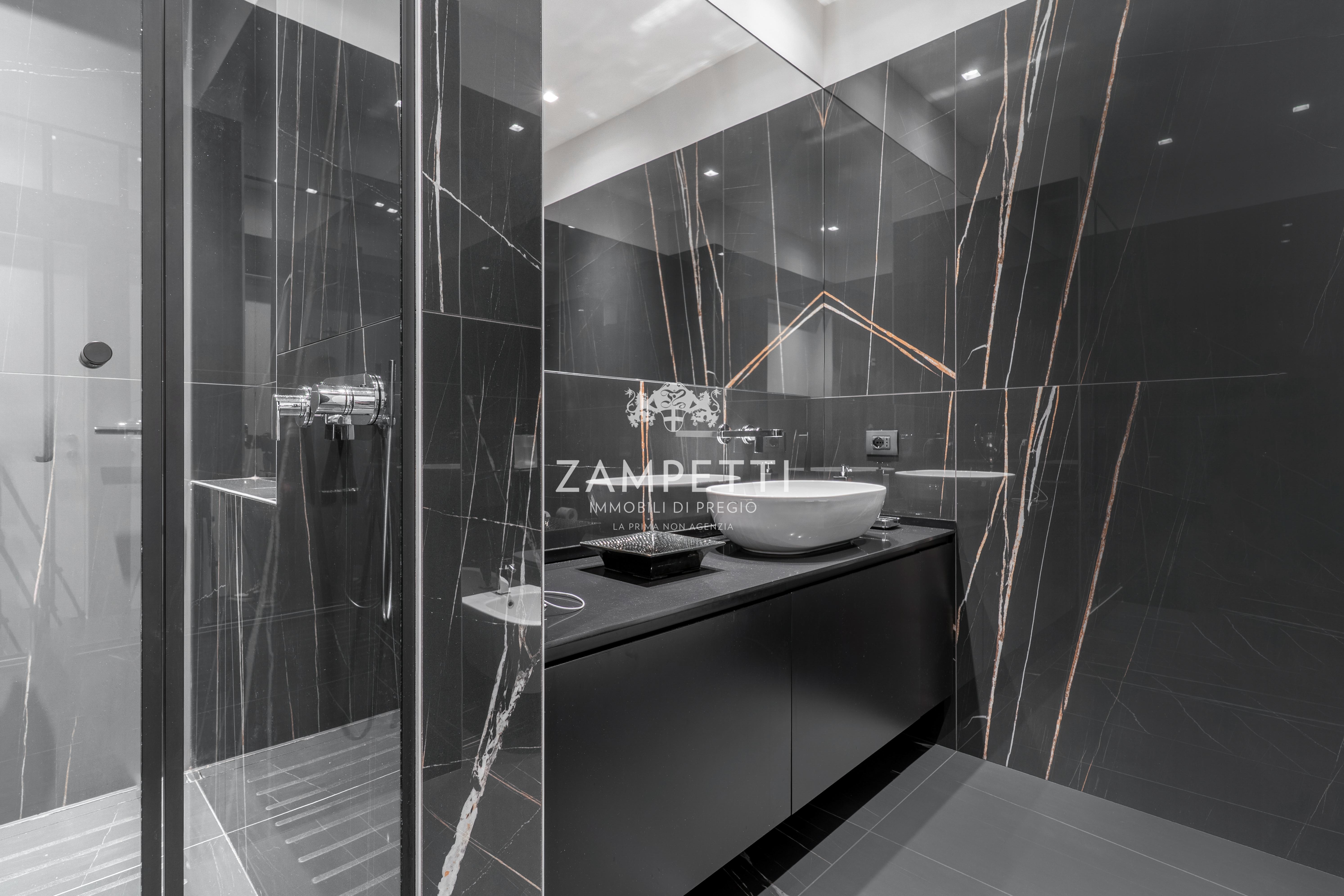Due bagni in marmo, uno bianco e uno nero con dettagli cromati; Da non dimenticare le due cabine armadio splendide: spazi illuminati e organizzati su misura, dove vestiti e accessori trovano il loro posto quasi a diventare oggetto di arredamento.