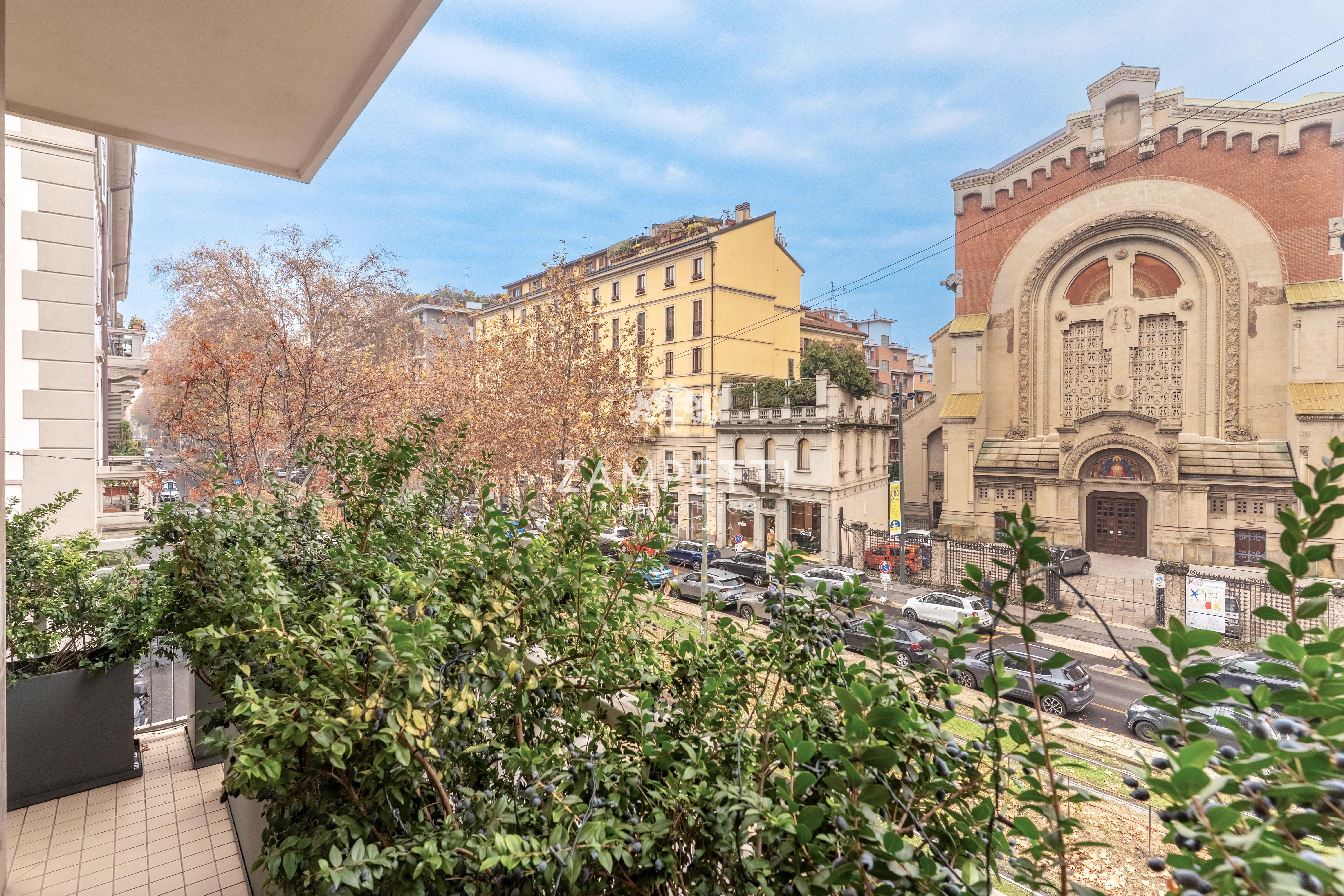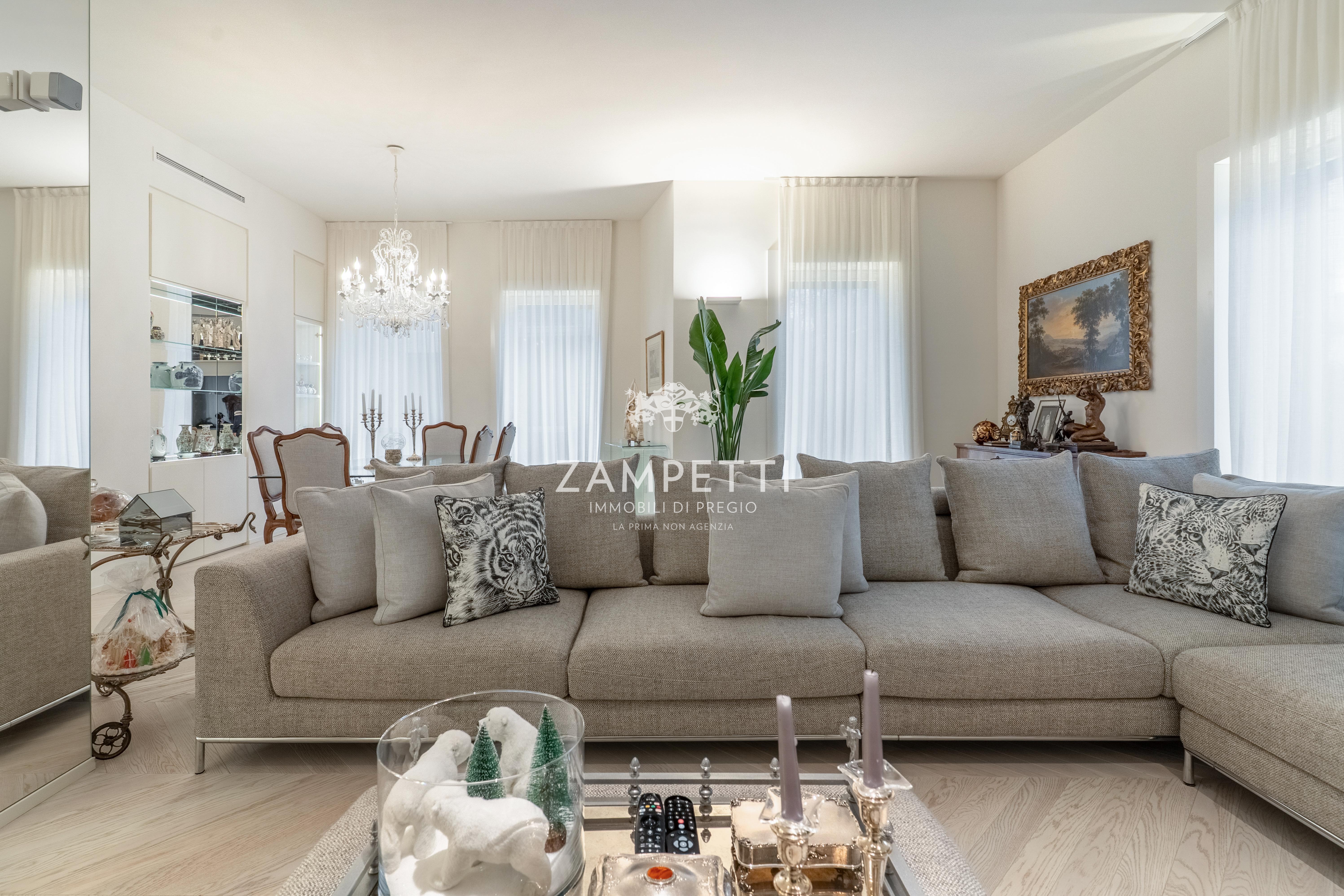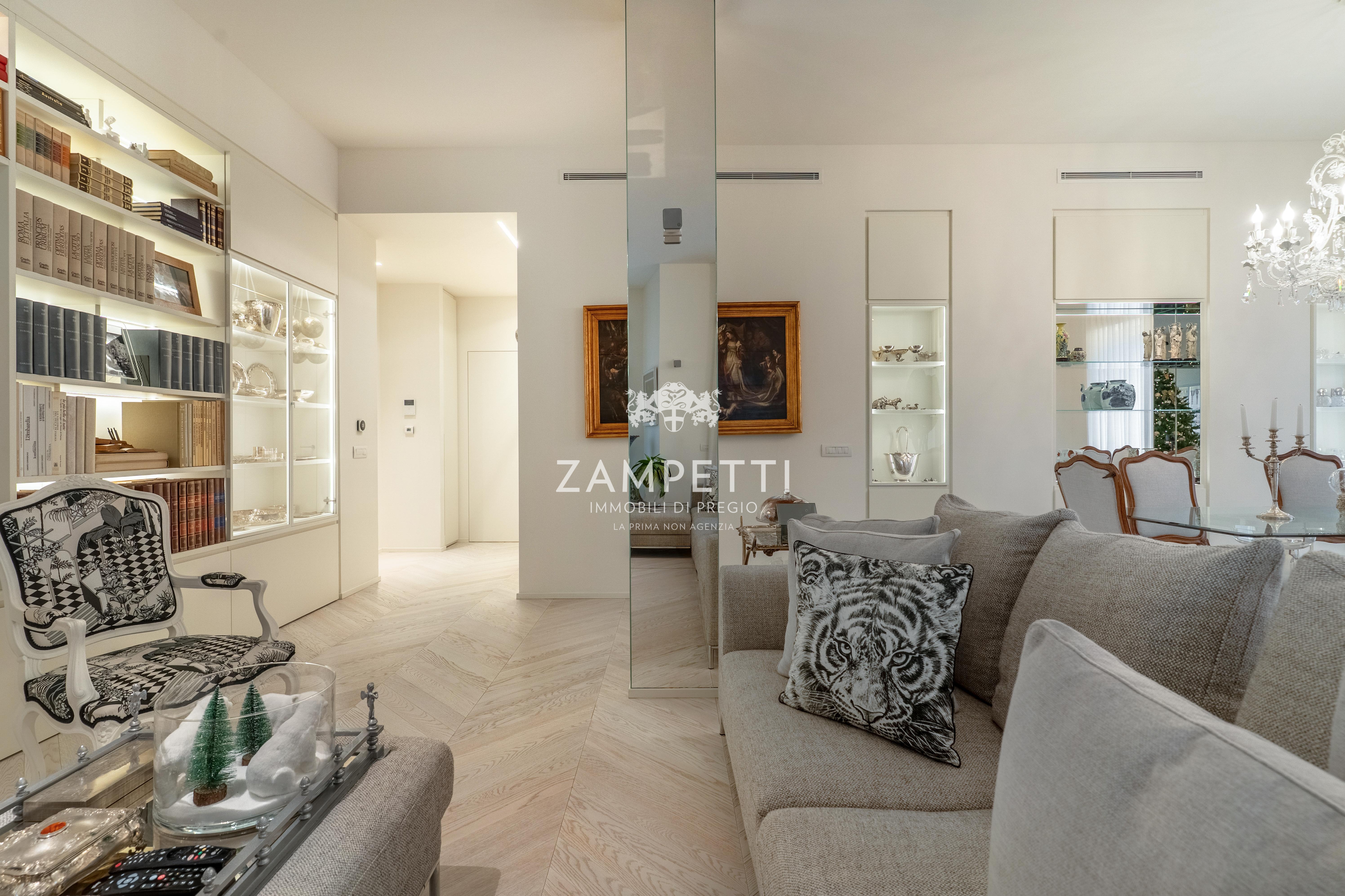 La proprietà, a pochi passi da Piazza Duse, si apre su un meraviglioso salotto triplo, con ampie finestre che incorniciano la vista su una splendida chiesa del 1800 , che diventa come un quadro, visibile dal salotto lineare di tessuto e cristallo.