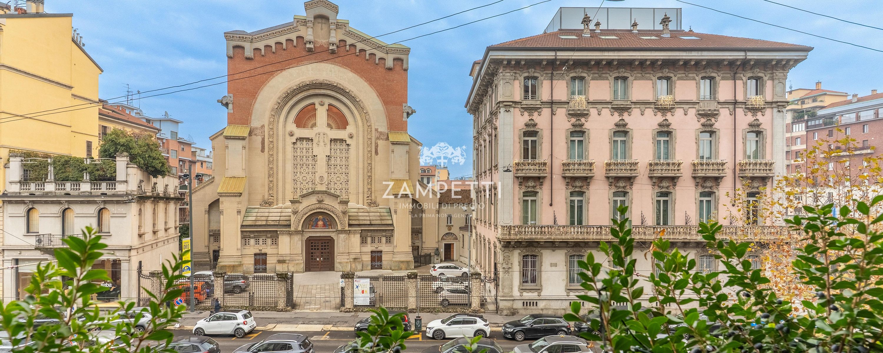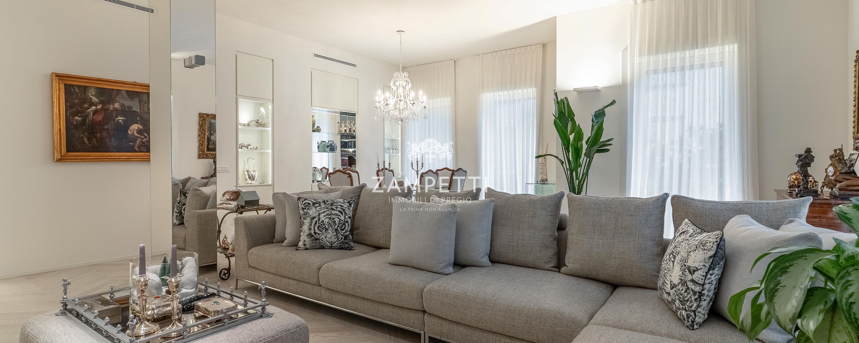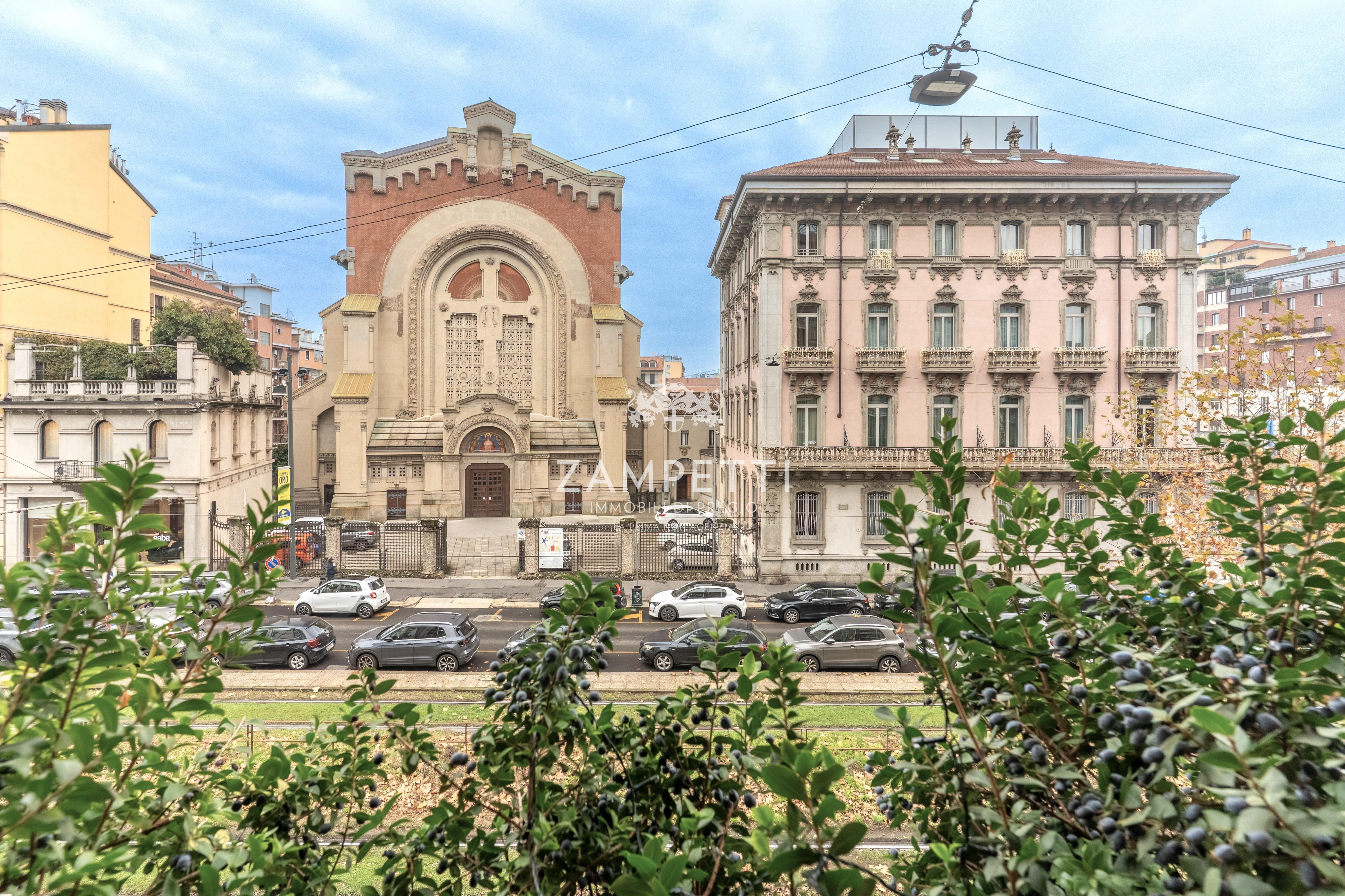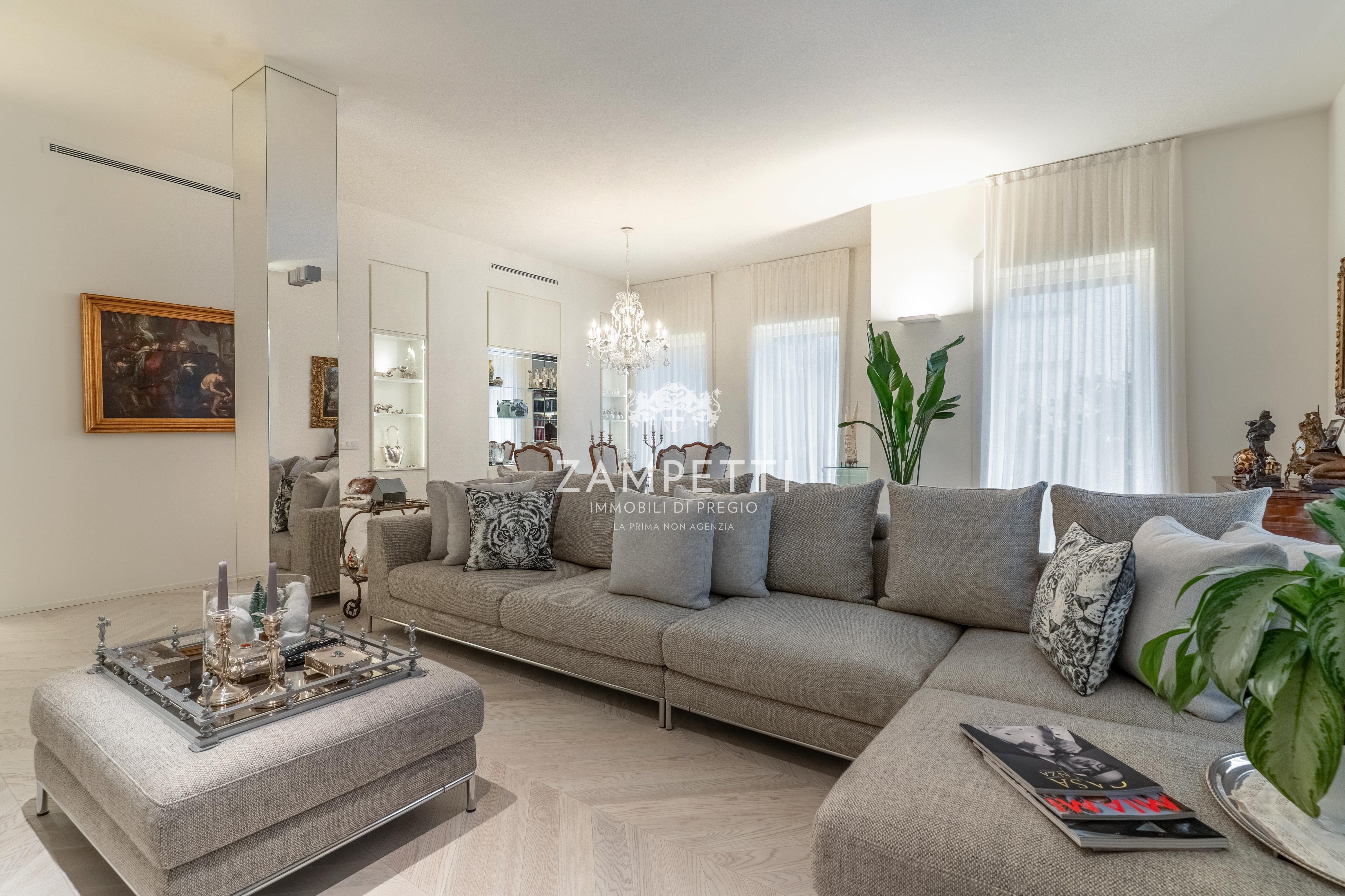 La proprietà, a pochi passi da Piazza Duse, si apre su un meraviglioso salotto triplo, con ampie finestre che incorniciano la vista su una splendida chiesa del 1800 , che diventa come un quadro, visibile dal salotto lineare di tessuto e cristallo.