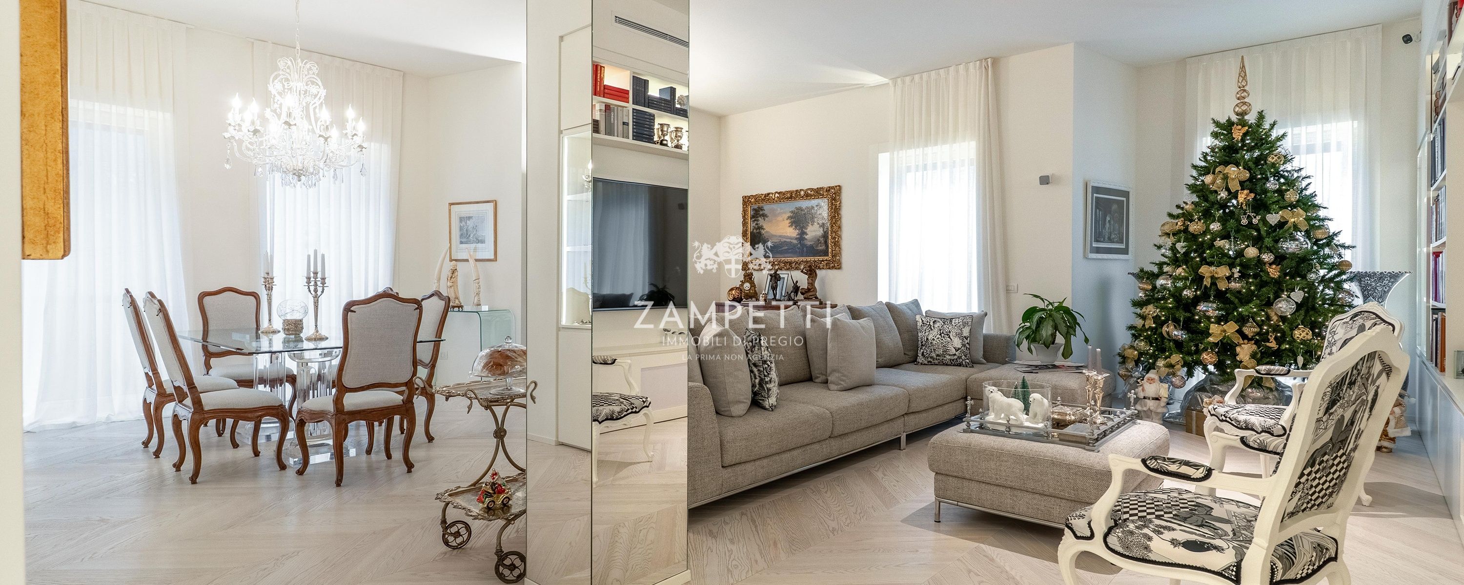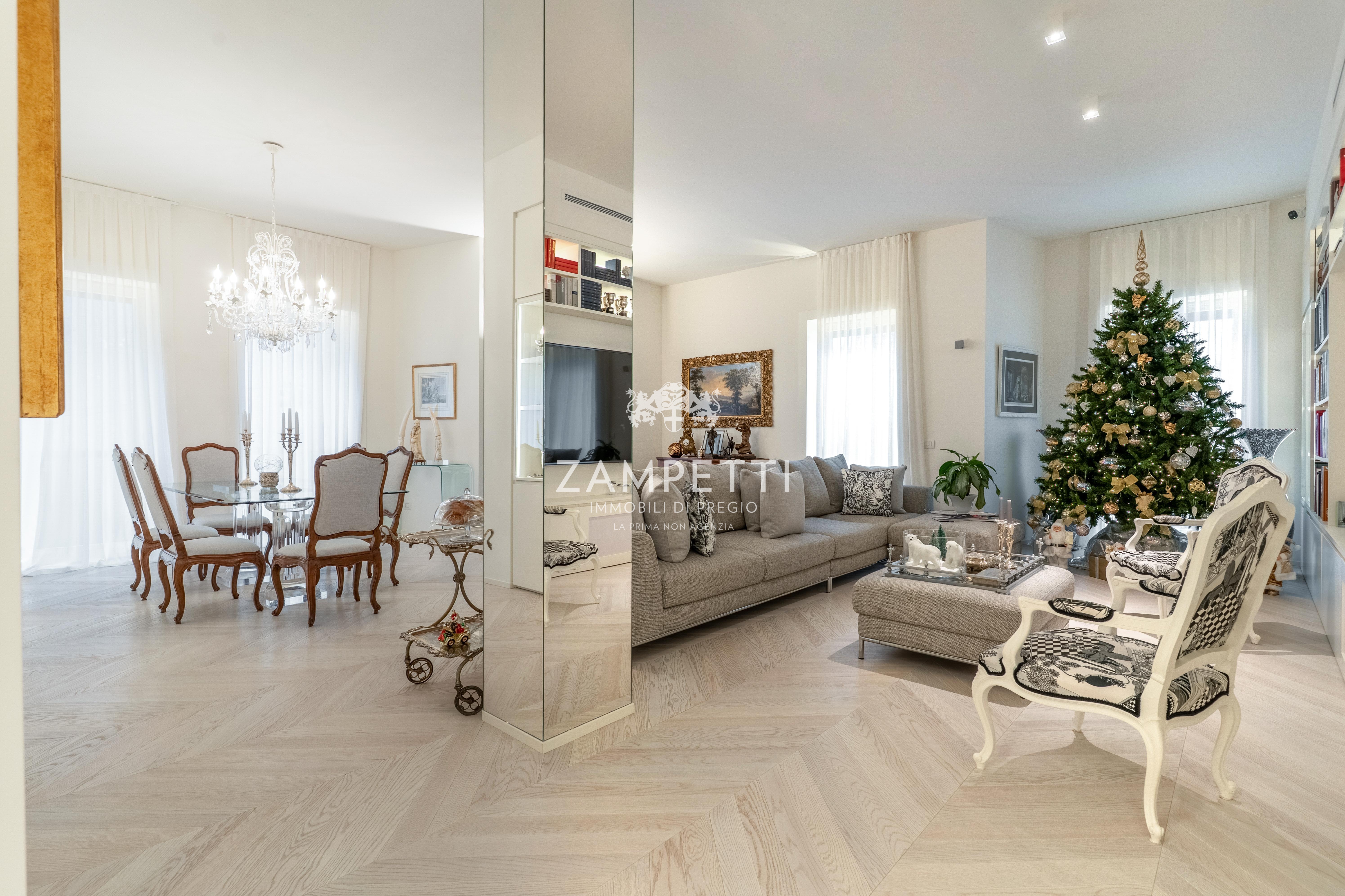 Immagina di aprire la porta di un appartamento che sembra uscito da una rivista di design parigino: parquet bianco lucido, pareti in tonalità di grigio e bianco, linee pulite che avvolgono i 180 mq di questa residenza, posta al secondo piano di uno stabile signorile con doppio ascensore e servizio di portineria.