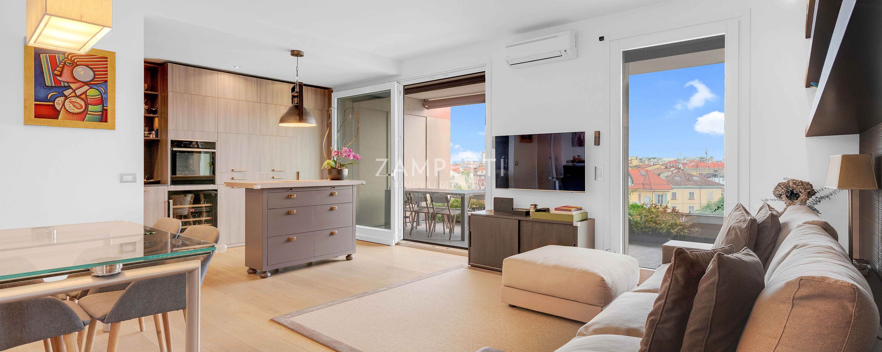 L'ingresso si apre su una luminosa zona living, caratterizzata da una cucina a vista elegante e moderna; da qui si accede ad un ampio terrazzo, ideale per godersi momenti di relax e intrattenimento con una vista panoramica mozzafiato sulla città.