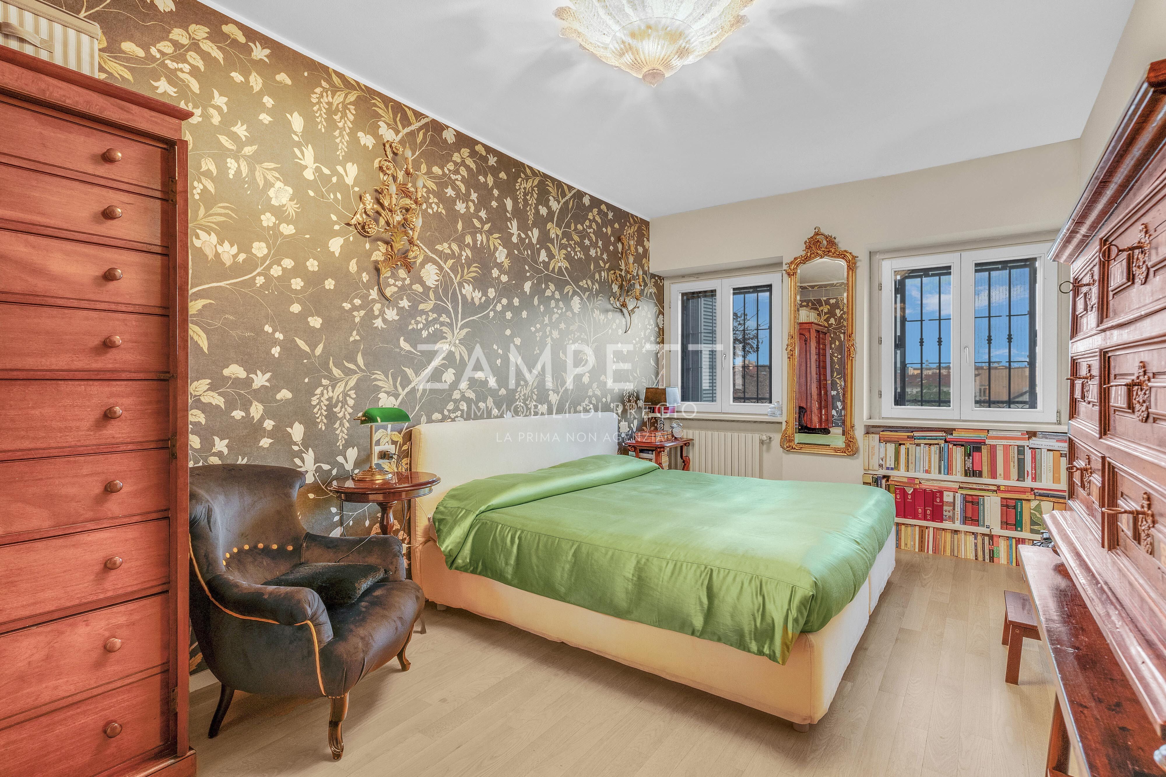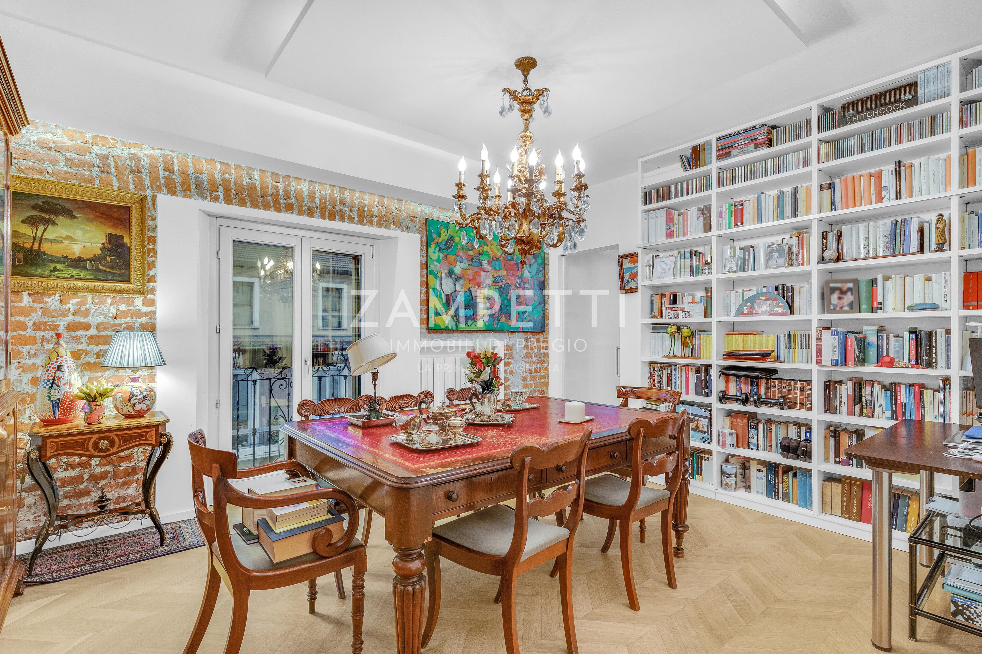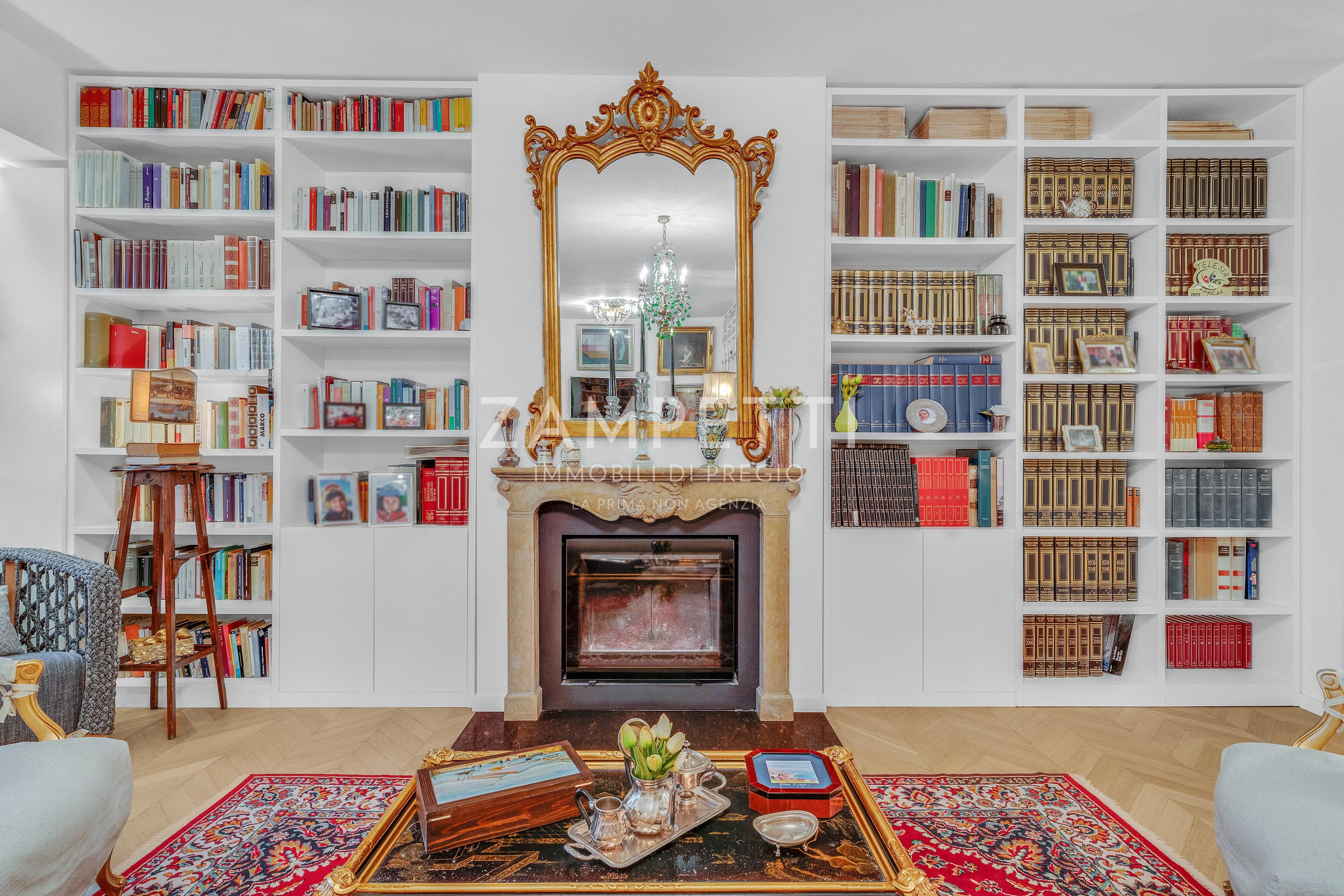 la Zampetti Immobili di Pregio propone in vendita in esclusiva una signorile residenza di circa 213 mq situata al quarto piano su cinque di uno stabile d’epoca di fine ‘800 dotato di ascensore e di servizio di portineria tutto il giorno. L’immobile è stato oggetto di una sapiente riqualificazione che ha permesso di mantenere quasi inalterato il sapore della corte e il fascino d'antan della casa d’epoca. La residenza, ristrutturata da pochissimo, si compone di una zona giorno dove troviamo un soggiorno triplo con camino a norma funzionante e parquet con inserti di marmo nero siciliano, una sala da pranzo/biblioteca, una cucina abitabile concepita artigianalmente da un falegname in cui spiccano le maioliche realizzate e dipinte a mano e una scala scorrevole su un binario che fa il giro di tutta la stanza, e un bagno di cortesia. In tutta la zona giorno sono stati recuperati, durante la ristrutturazione, i mattoni originali e nei controsoffitti sono stati inseriti degli Strip LED per sottolineare gli spazi o per contribuire a definire gli ambienti. Nella zona notte troviamo, invece, tra camere da letto, di cui una master con bagno en suite più armadio e cabina armadio, altri due bagni e due nicchie guardaroba/scarpiere che possono essere riconvertiti, data la presenza degli attacchi, in lavanderia.