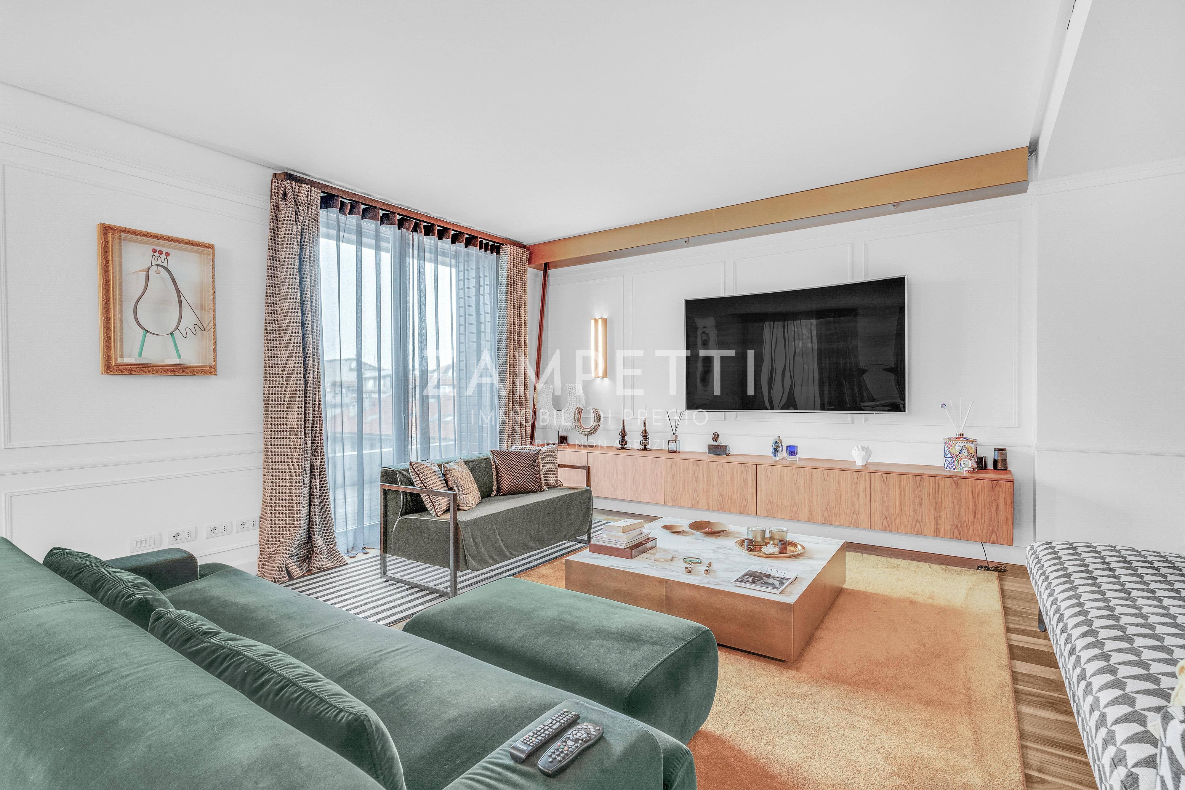 Questa residenza, caratterizzata da una doppia esposizione e una luminosità eccezionale grazie alla presenza di un balcone e una terrazza, offre uno spazioso soggiorno doppio con zona pranzo, una cucina abitabile, una camera da letto principale con cabina armadio e bagno en suite, altre due camere da letto matrimoniali, di cui una attualmente adibita a cabina armadio, e altri due bagni.
