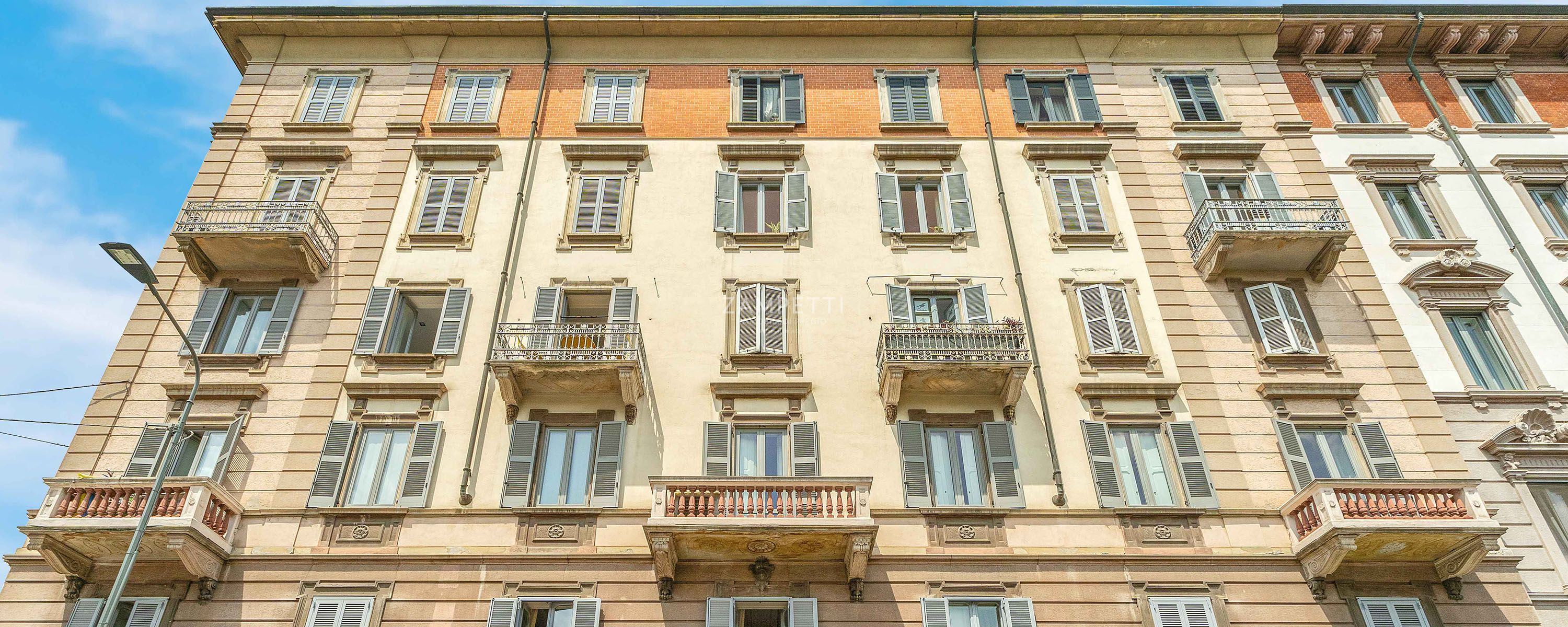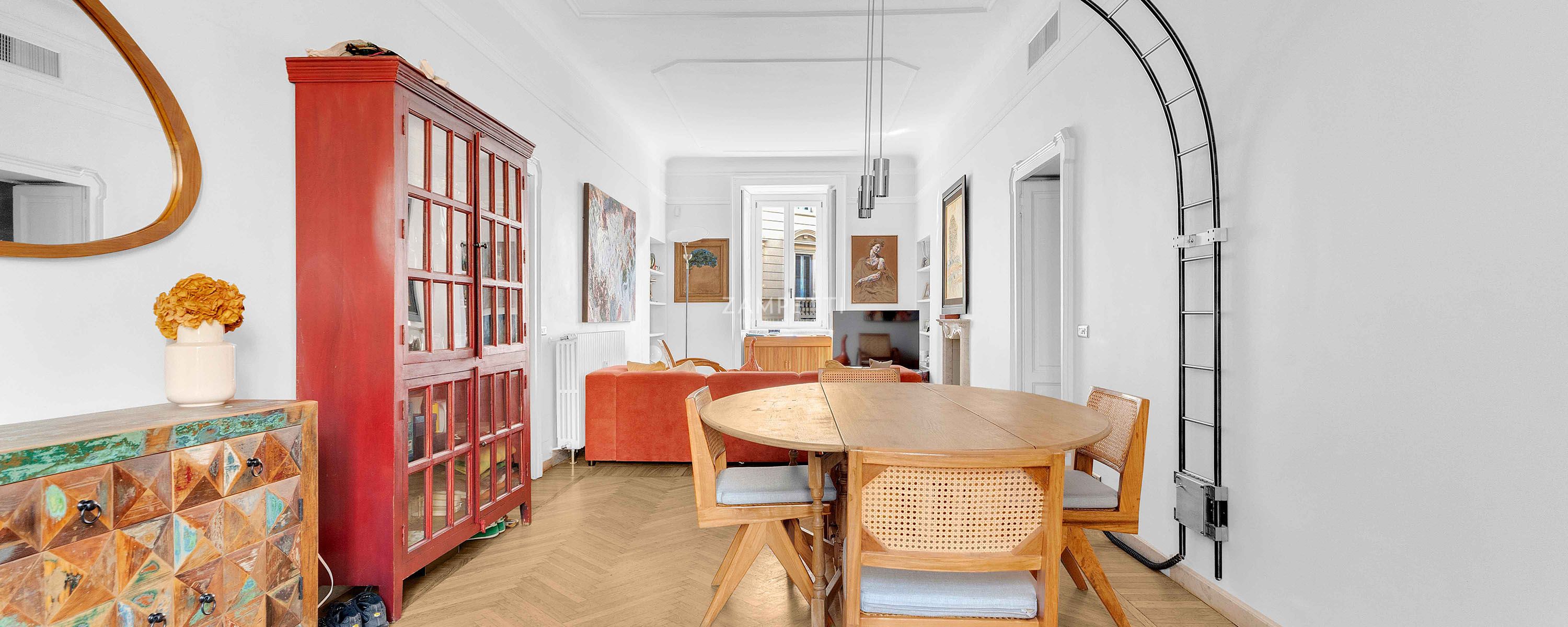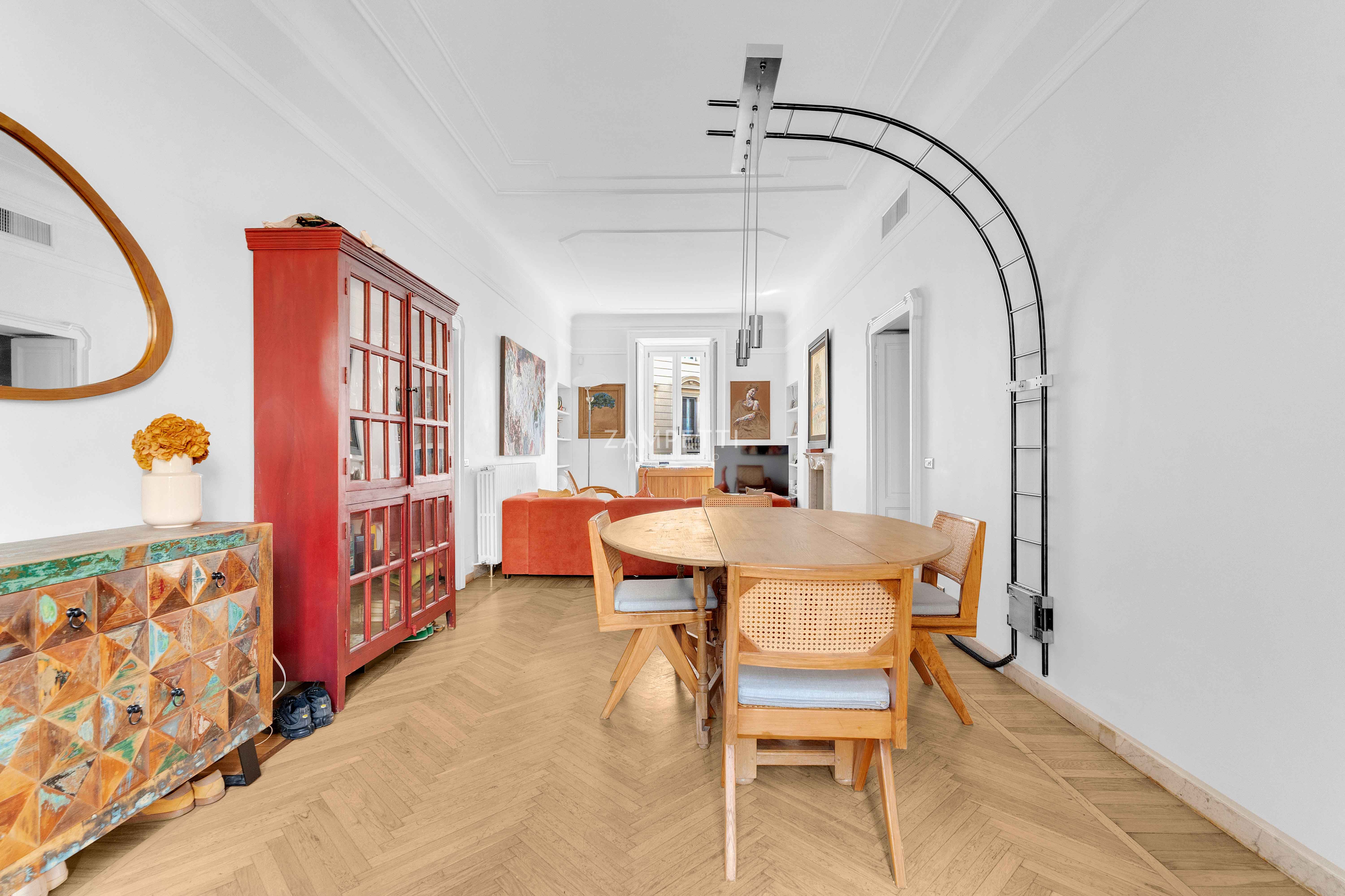 Modanature in stucco sui soffitti ed attenzione ai particolari che rispettano questa casa d'epoca come Il prezioso parquet e il camino, che attirano l’attenzione al primo sguardo entrando nella casa. La cucina è a vista sul salotto, con balcone con affaccio sul cortile interno. La zona notte ha una spaziosa camera padronale, un grande bagno, una seconda camera singola ed un ripostiglio lavanderia. Dall'altro lato del soggiorno una grande camera studio con balcone e un secondo bagno.
