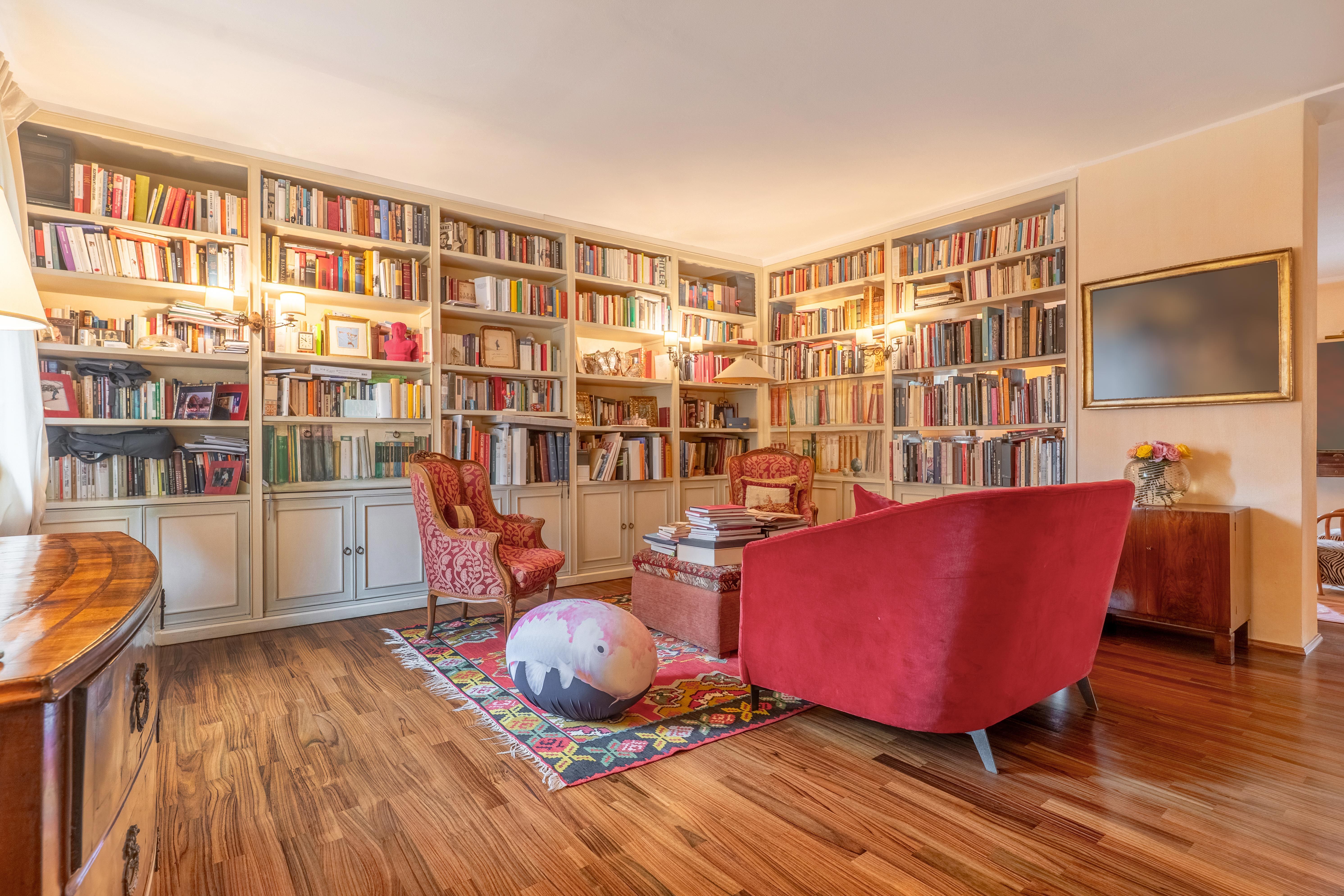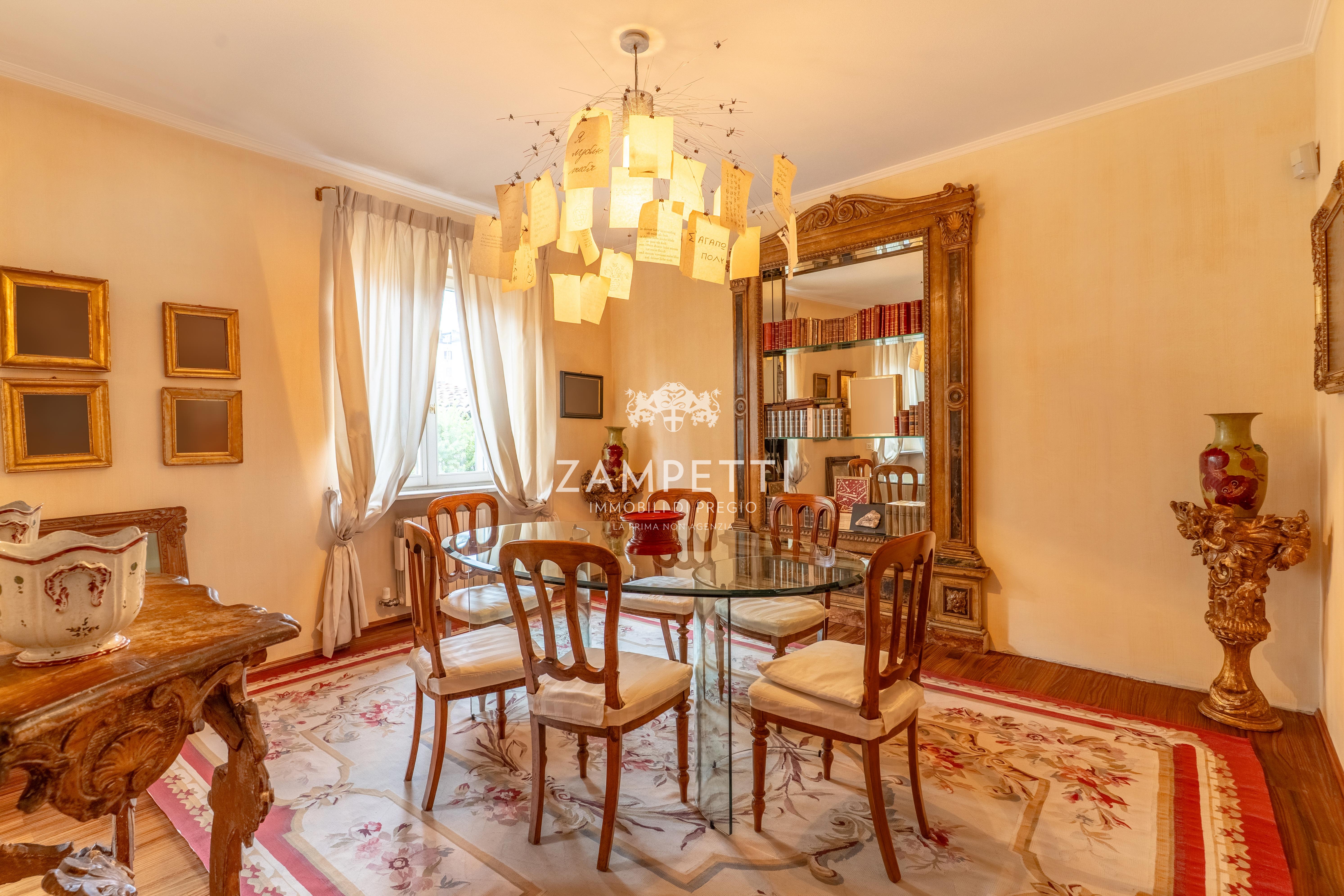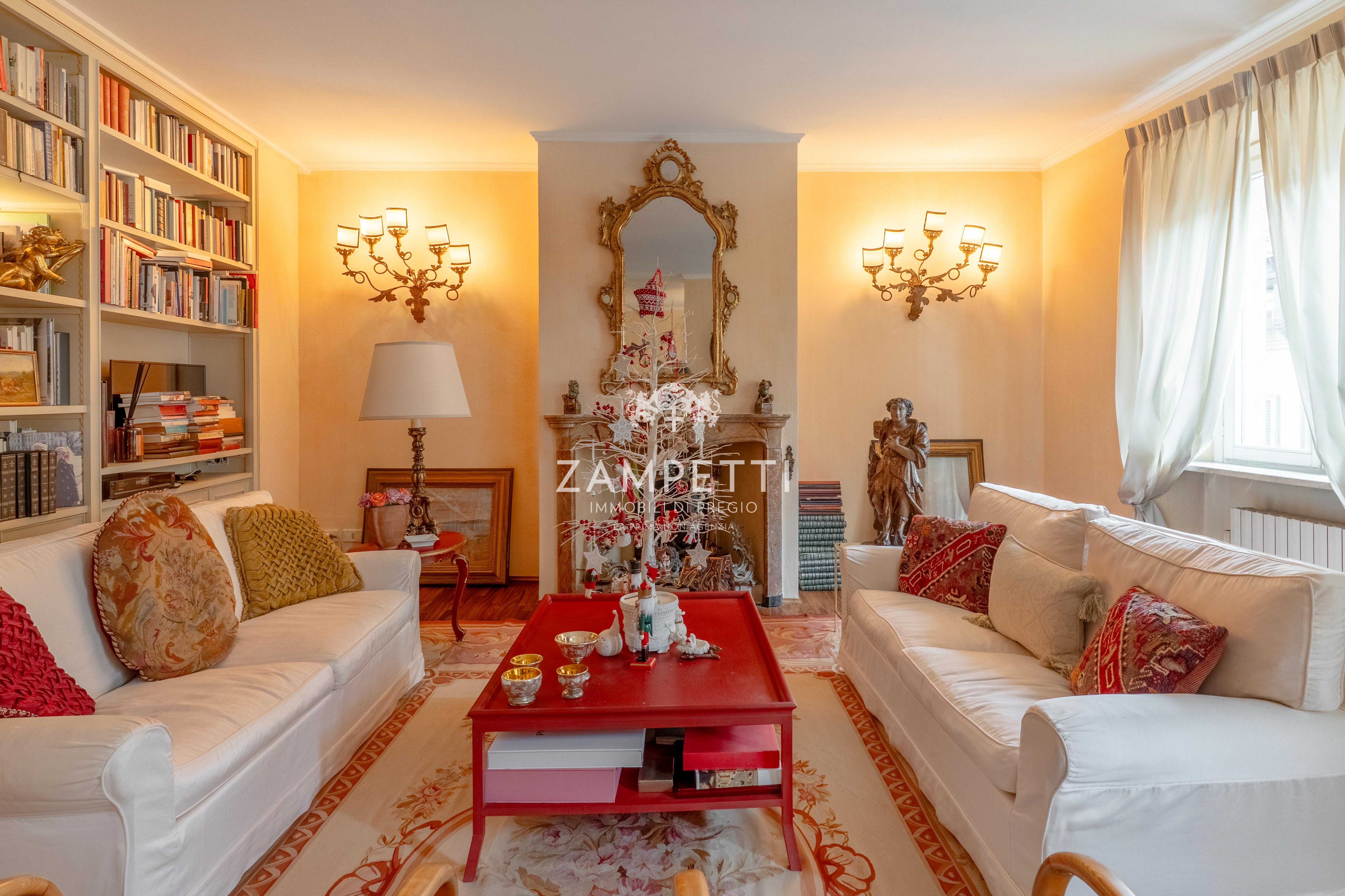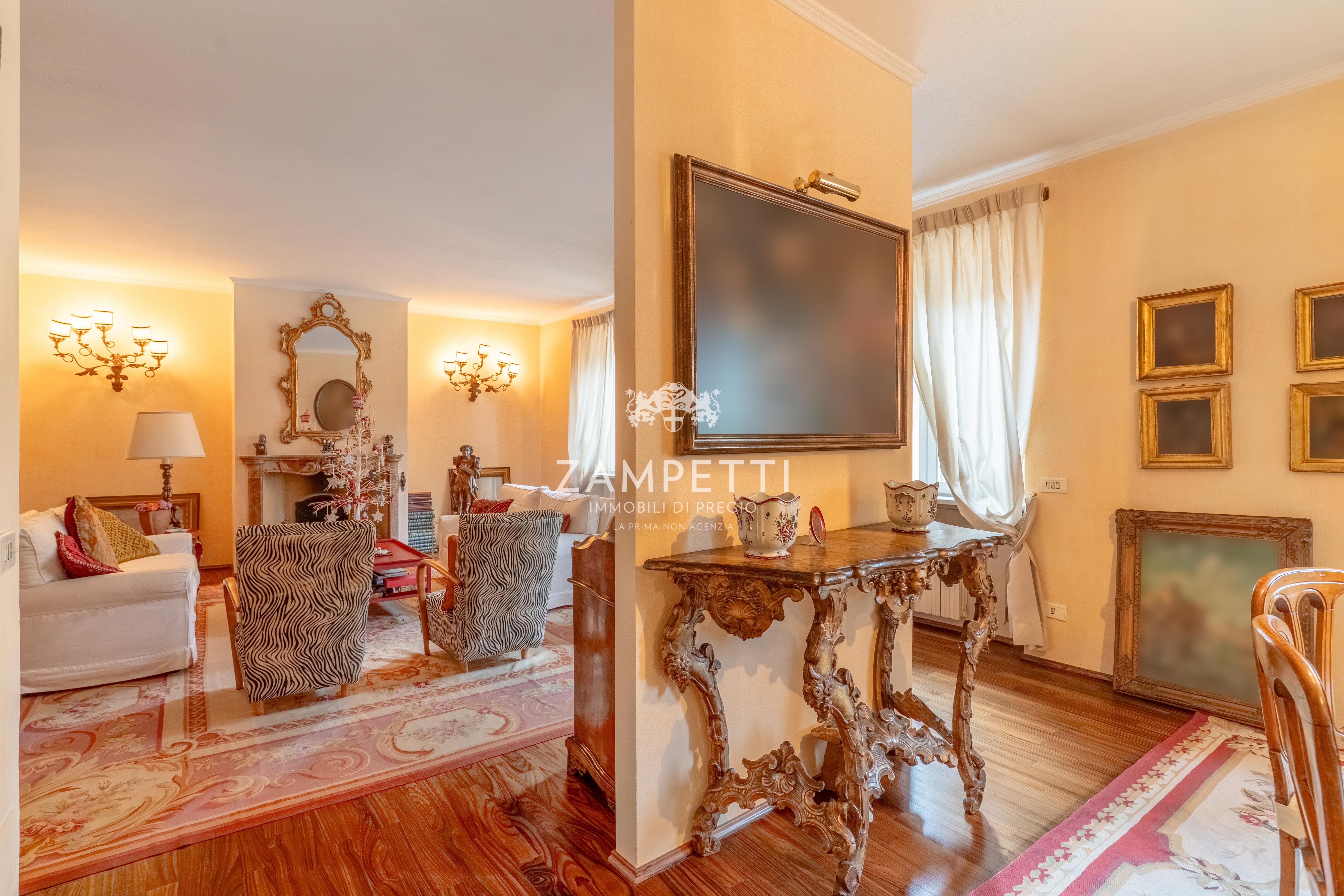 Troviamo l'ingresso al quarto piano che si apre su un ampio e luminoso doppio soggiorno, impreziosito da dettagli d’epoca, come i due camini di cui uno settecentesco; Una piacevole sensazione di accoglienza avvolge ogni ambiente, esaltata dal meraviglioso pavimento in palissandro che impreziosisce l’intera abitazione.