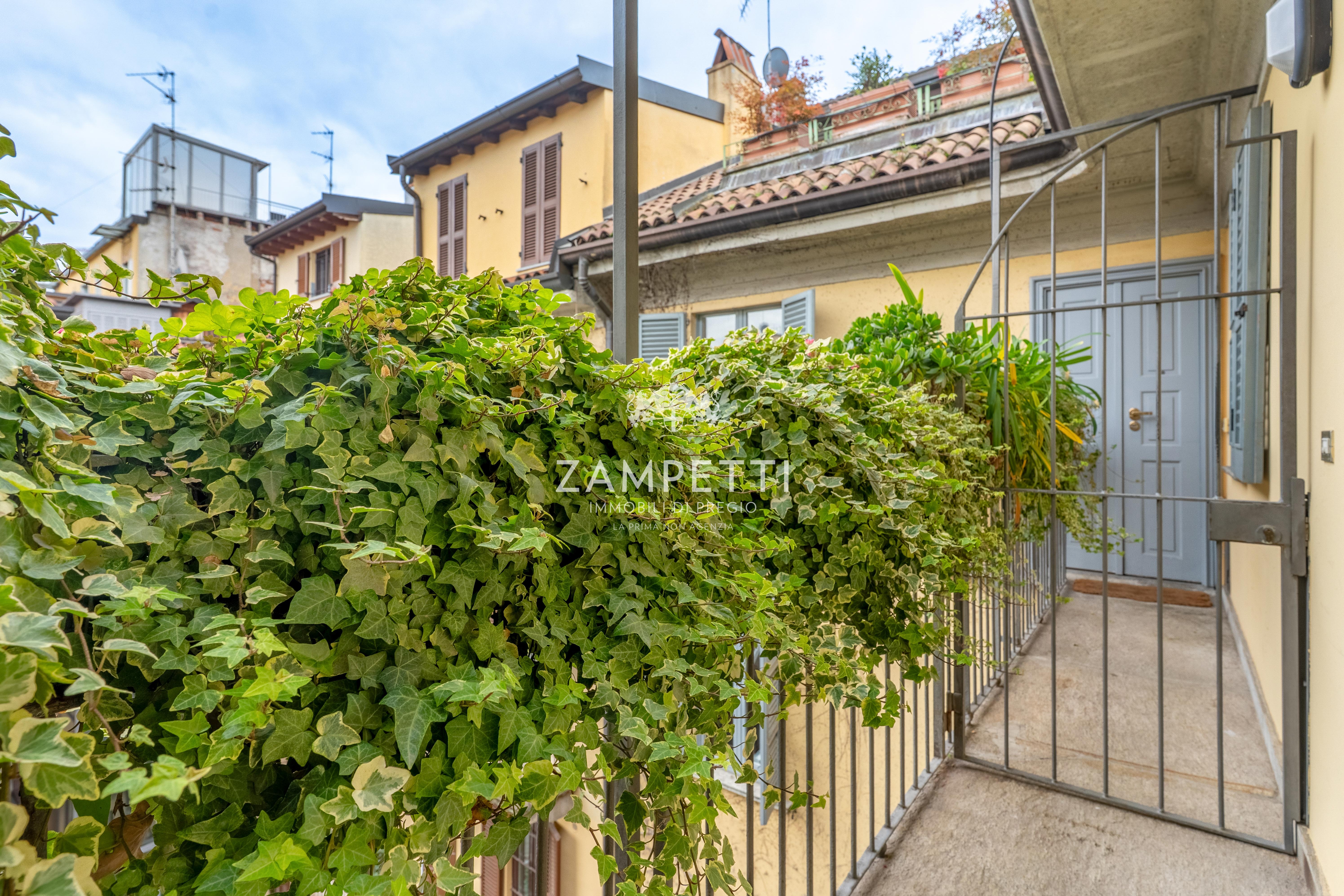 Da qui si apre il gioiello dell’abitazione: un terrazzino a tasca scenografico, perfettamente vivibile, arredato con tavolo e due sedie, da cui si gode una vista incantevole sui tetti della vecchia Milano e sul profilo inconfondibile del quartiere.