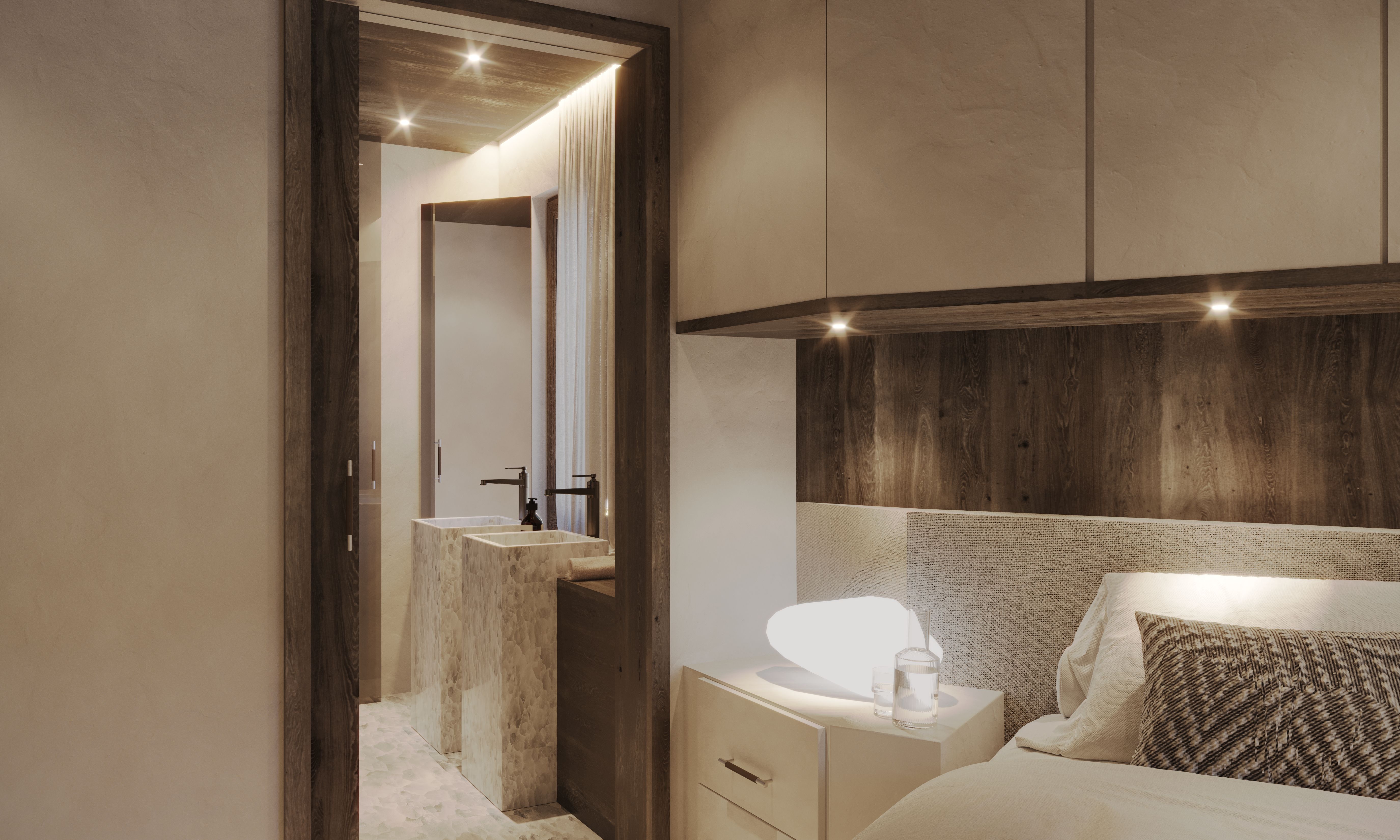 The floor plan is reminiscent of a crystal that merges with the interior design and the imposing landscape, and is characterised by the tranquillity and authenticity of the Alps.