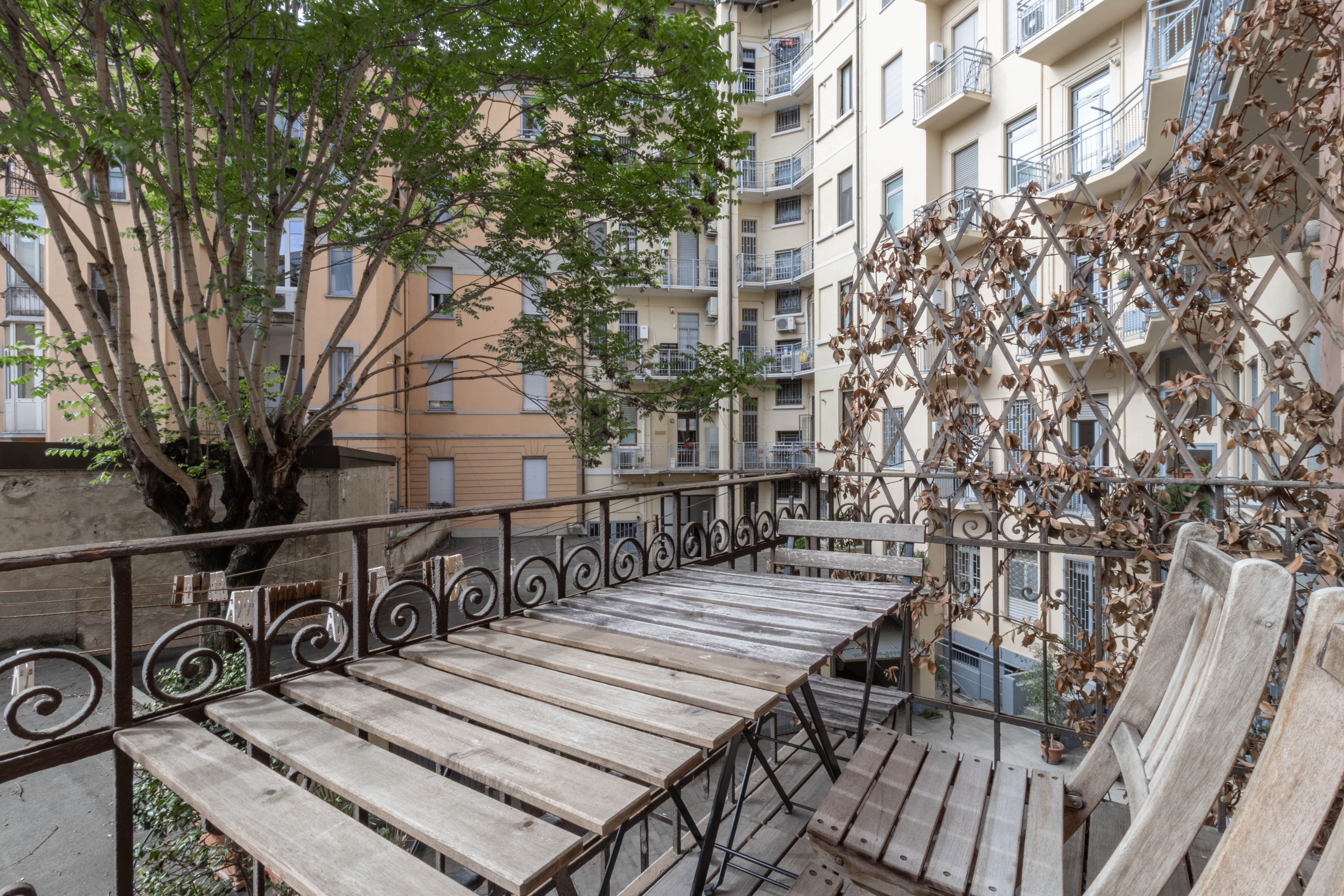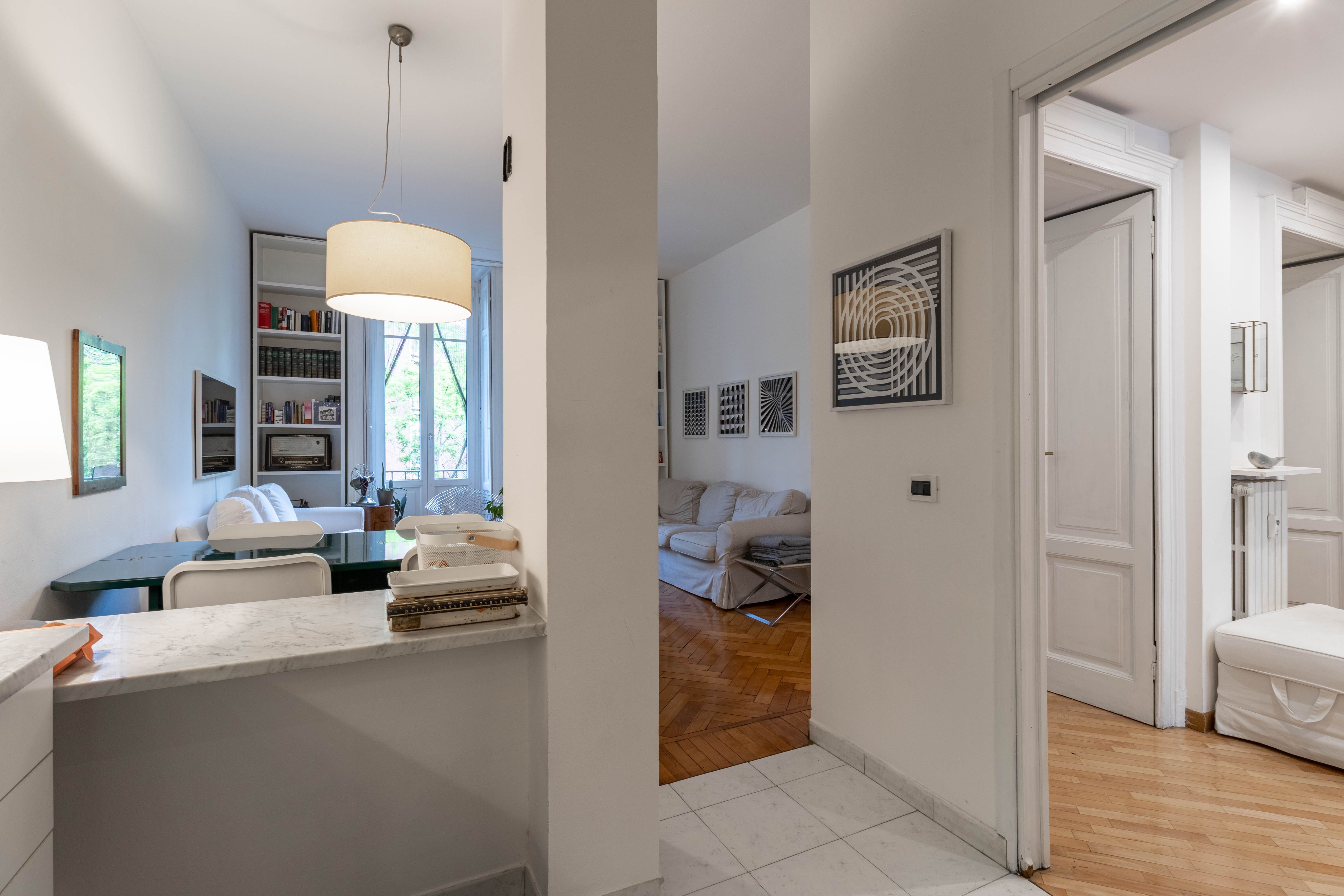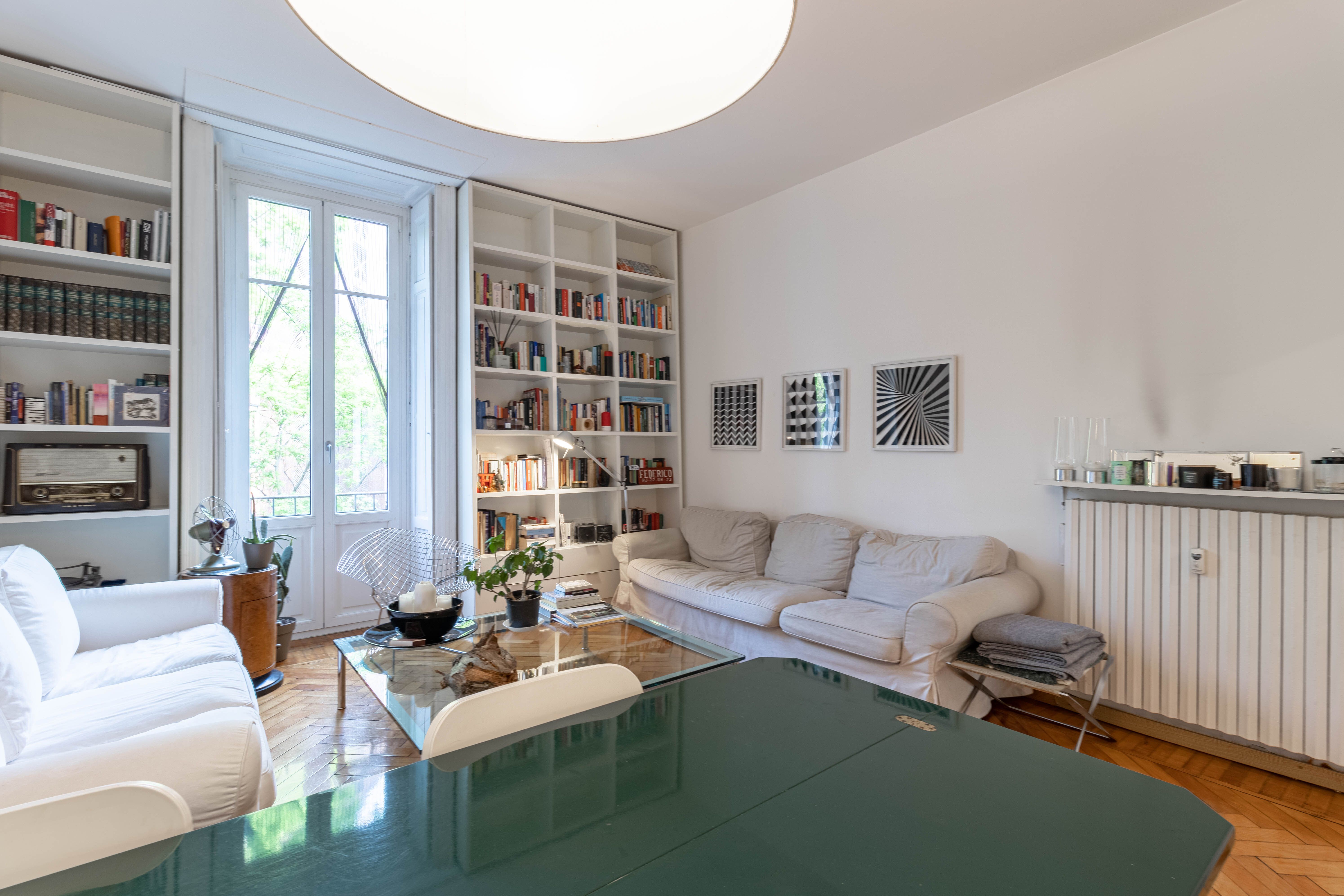 I plus dell’appartamento sono la doppia esposizione, i soffitti alti 3,80 m, che garantiscono ariosità e possibilità di sfruttare gli spazi in altezza e, soprattutto, la vista sul verde del Parco Guido Vergani-Giardino Bompiani, più noto ai milanesi come Parco Pallavicino, uno dei più ricchi di varietà arboree della città sin dalle origini.