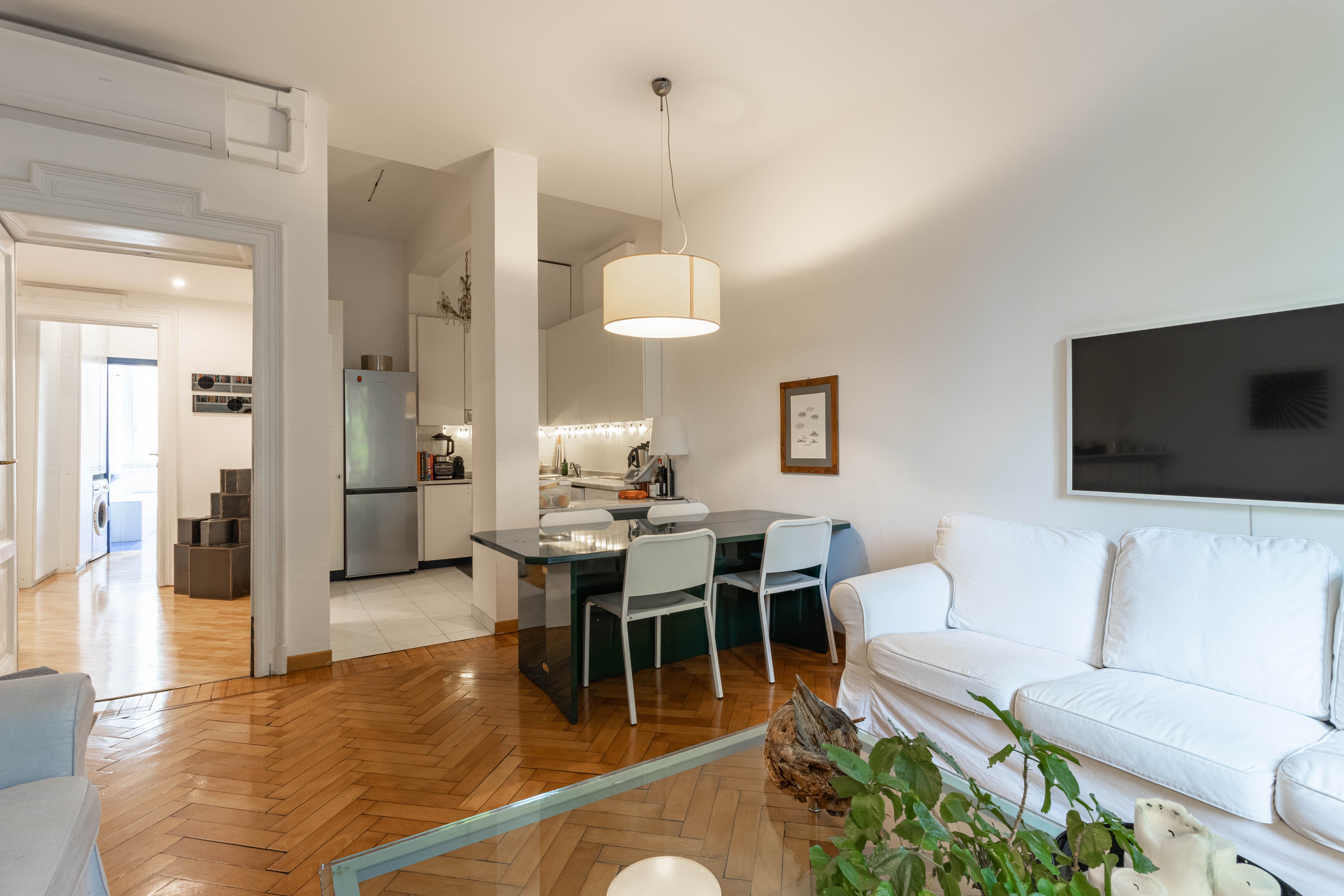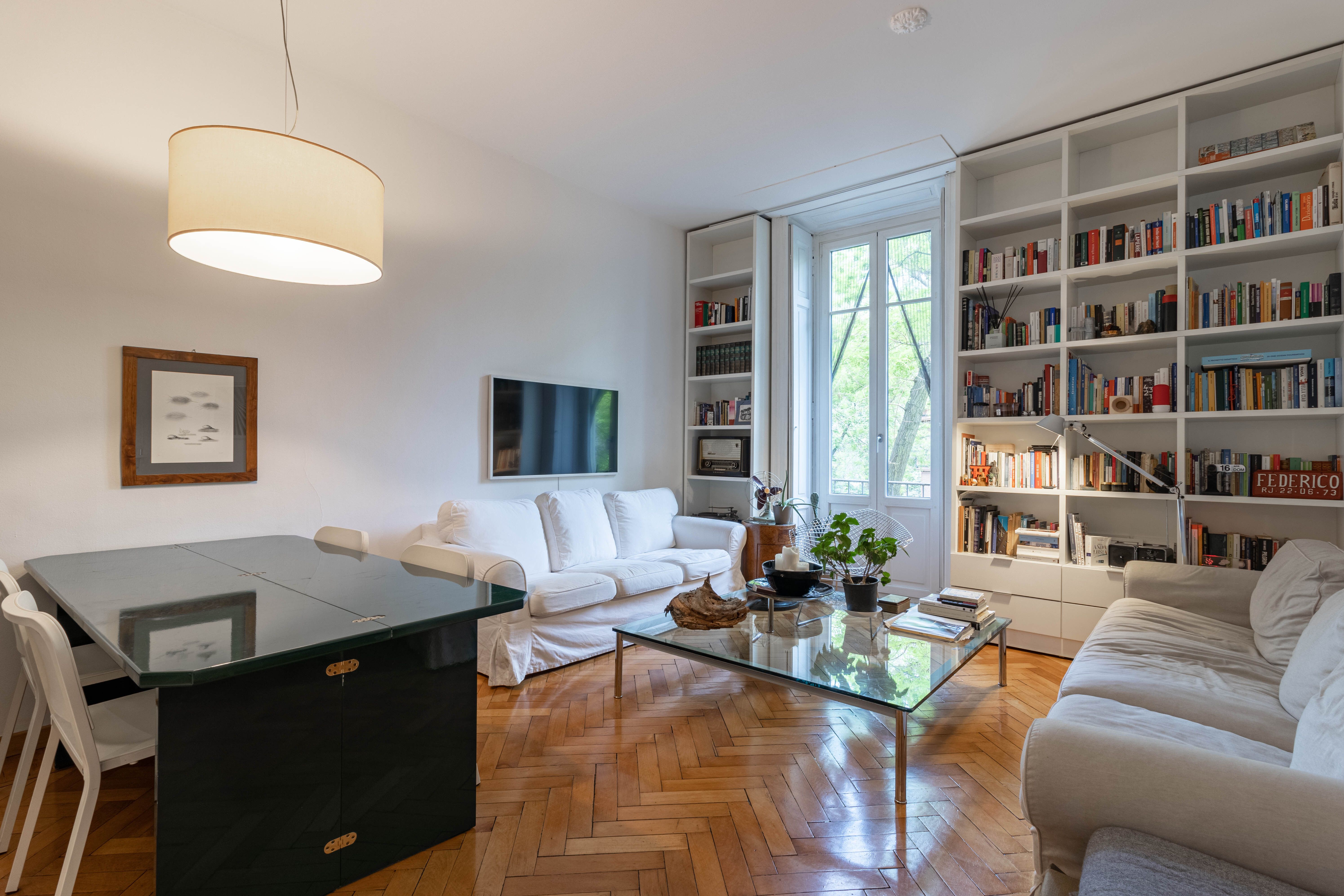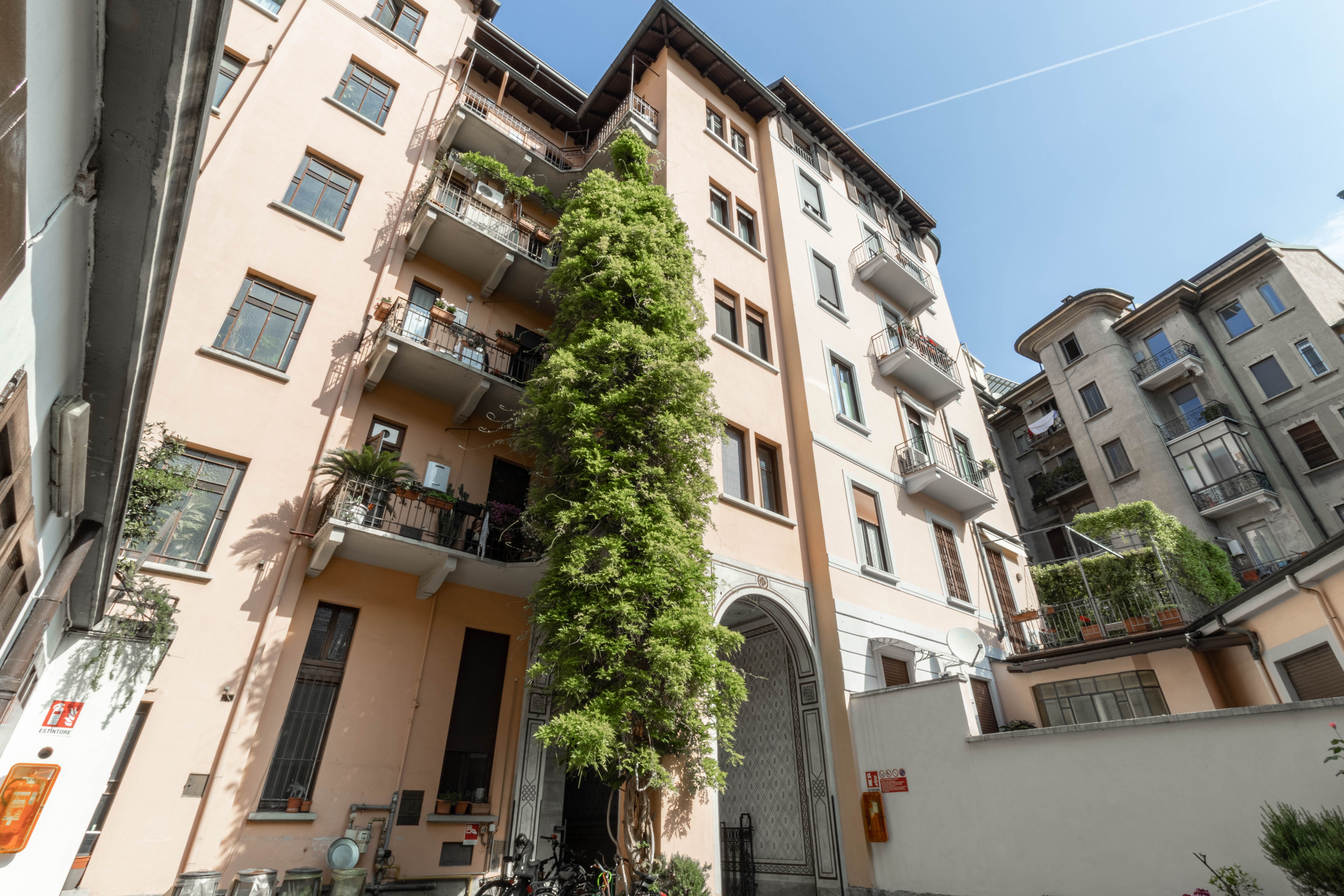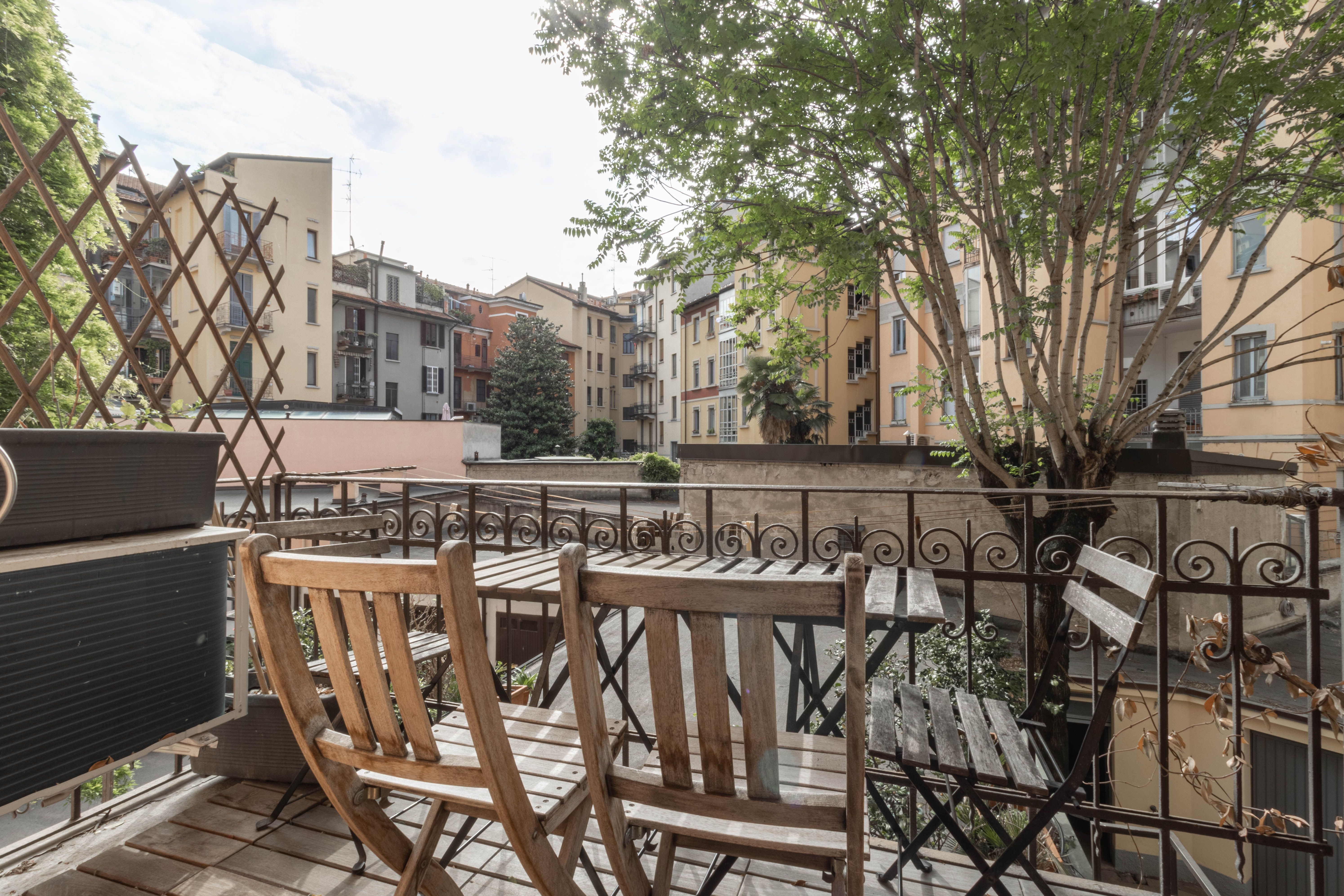 I plus dell’appartamento sono la doppia esposizione, i soffitti alti 3,80 m, che garantiscono ariosità e possibilità di sfruttare gli spazi in altezza e, soprattutto, la vista sul verde del Parco Guido Vergani-Giardino Bompiani, più noto ai milanesi come Parco Pallavicino, uno dei più ricchi di varietà arboree della città sin dalle origini.