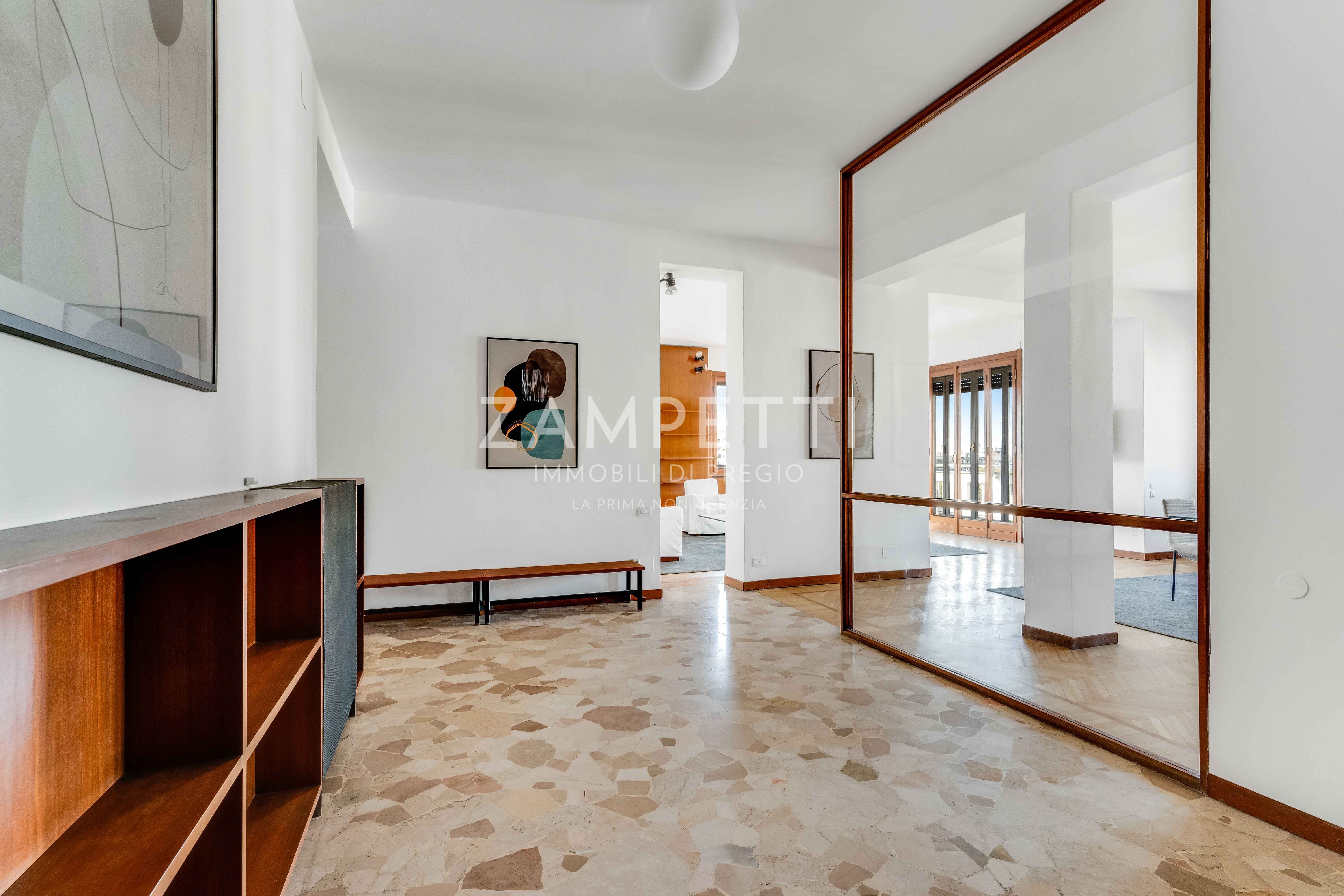 Entrando nell’elegante ingresso accediamo al luminoso doppio soggiorno, con terrazza che regala una bellissima vista su Piazza della Repubblica.