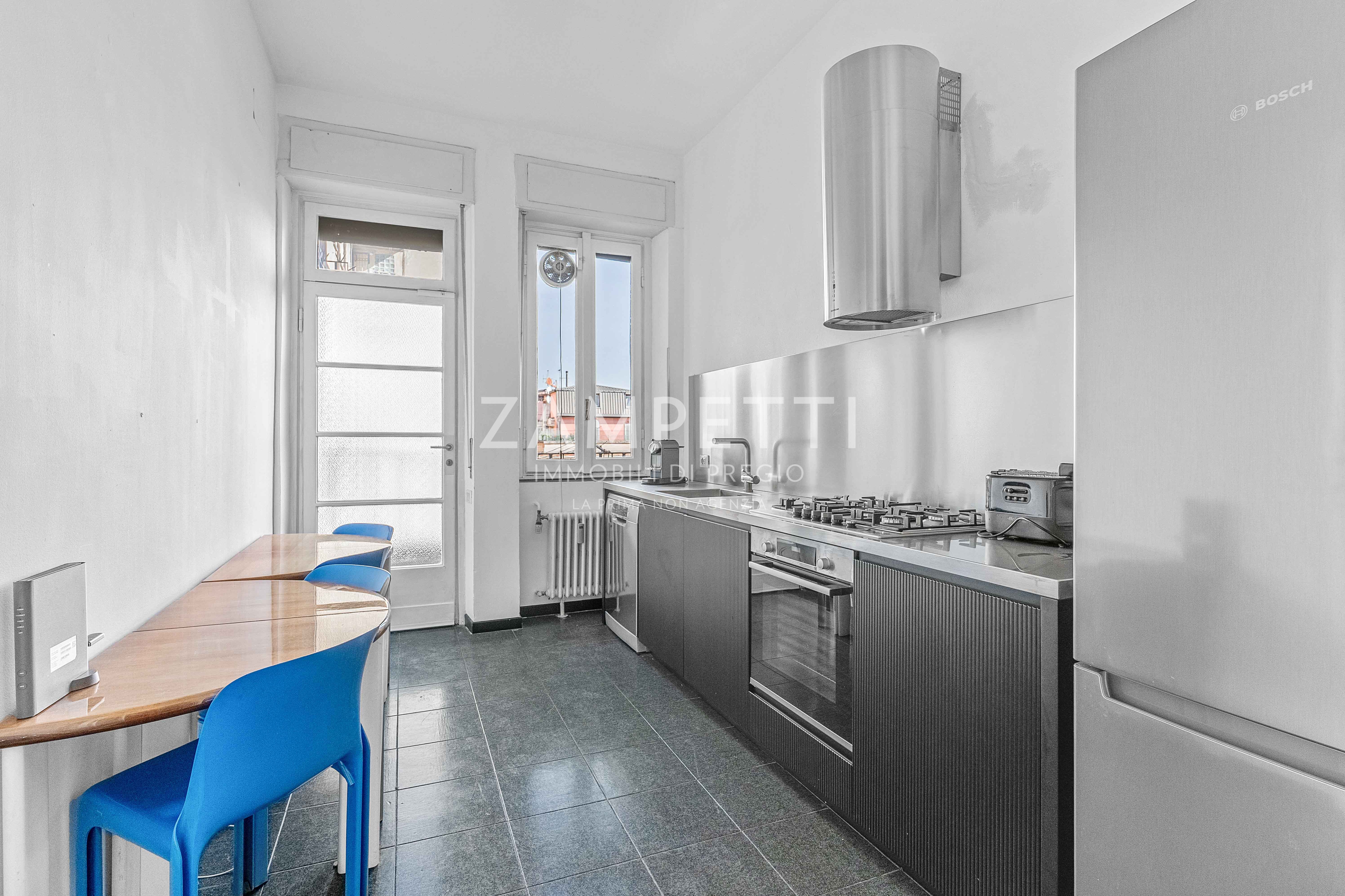 Sul lato opposto delle stanze al momento si trova la cucina dalla quale si accede al balcone con affaccio sul lato interno del palazzo, con accesso all'ascensore di servizio, il terzo bagno e una terza camera/studio.