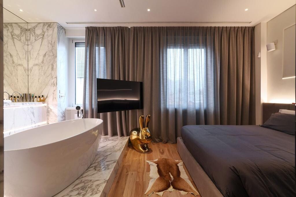 La residenza, in ottime condizioni, si compone di un ampio e luminoso soggiorno doppio, di una cucina semi abitabile, di una master bedroom con bagno en suite, di una seconda camera da letto e di un secondo bagno. Bellissima e di grande effetto la vasca da bagno freestanding in marmo, dalle linee semplici ed essenziali, presente nella master bedroom: un complemento che dona all’ambiente un tocco di esclusività e di valore. Grazie a questo elemento scenografico la camera da letto appare la suite di un lussuoso hotel. Altro elemento degno di nota è il parquet presente in tutta la residenza: una superficie autentica e senza tempo, mai fuori moda, una naturale bellezza resa ancora più speciale dalla presenza di nodi, venature e sfumature di colore ben visibili.