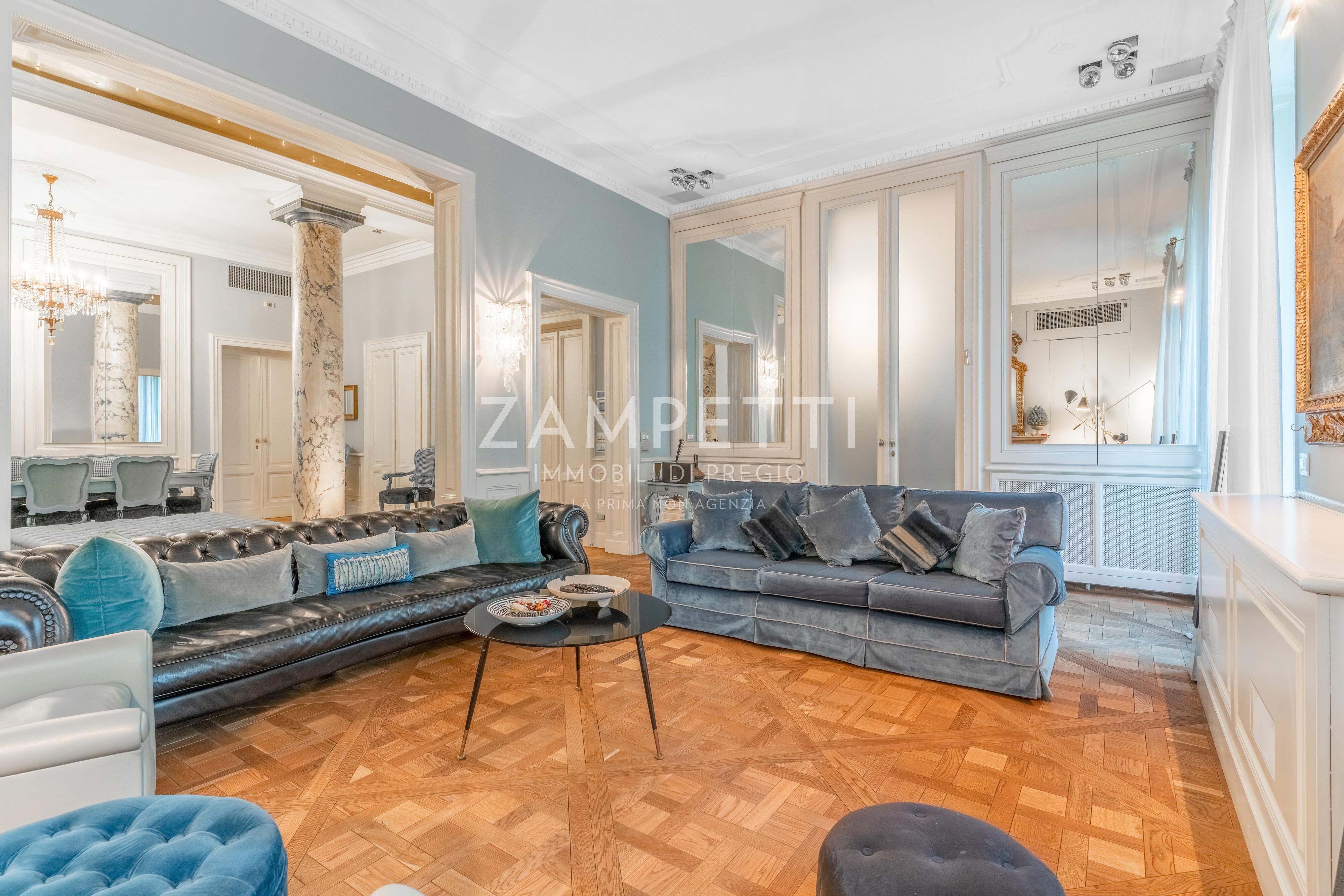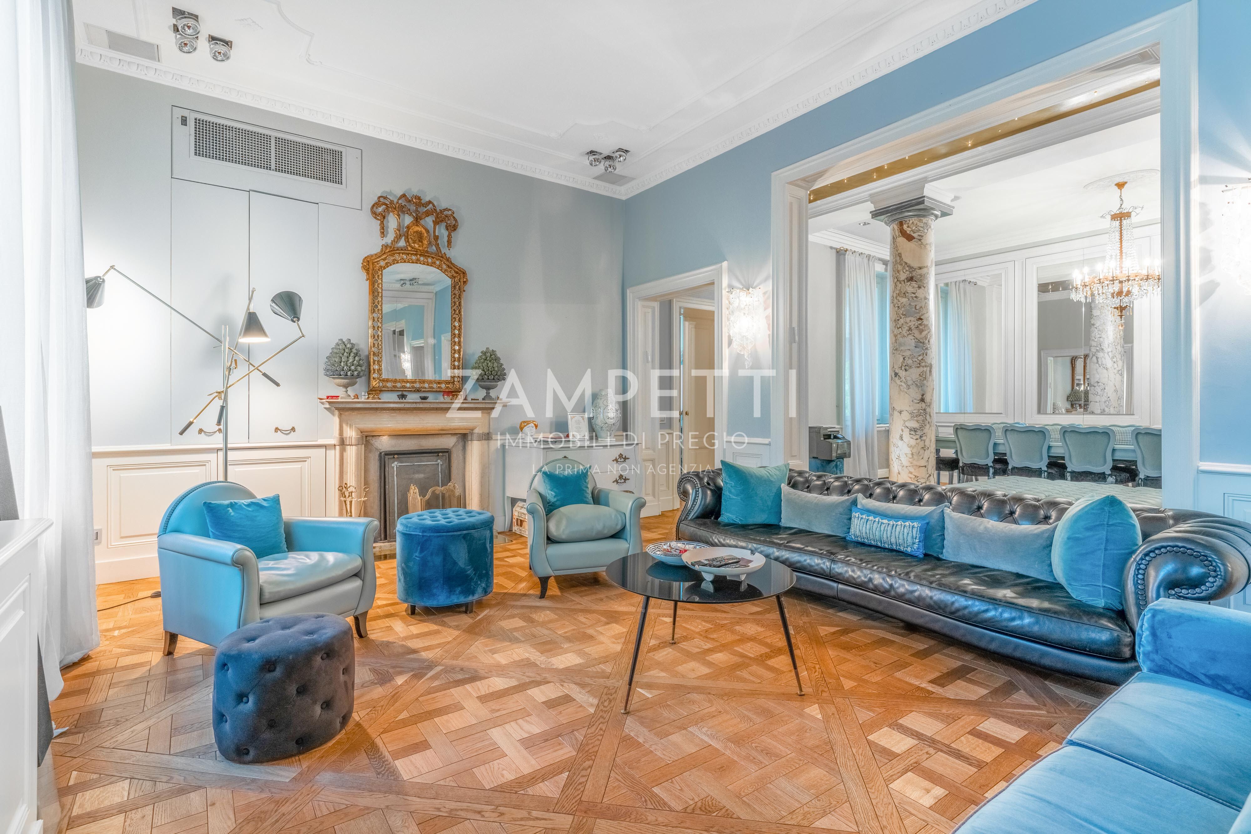 La residenza, ristrutturata con finiture di design e dettagli di grandissimo pregio e raffinatezza, ti accoglie in un meraviglioso salotto di rappresentanza con colonne di marmo, camino, parquet versailles, pregiate boiserie, grandi finestre e balcone. La seconda porta d’ingresso dà invece direttamente sulla cucina, immensa, luminosa e con grande lavanderia finestrata.