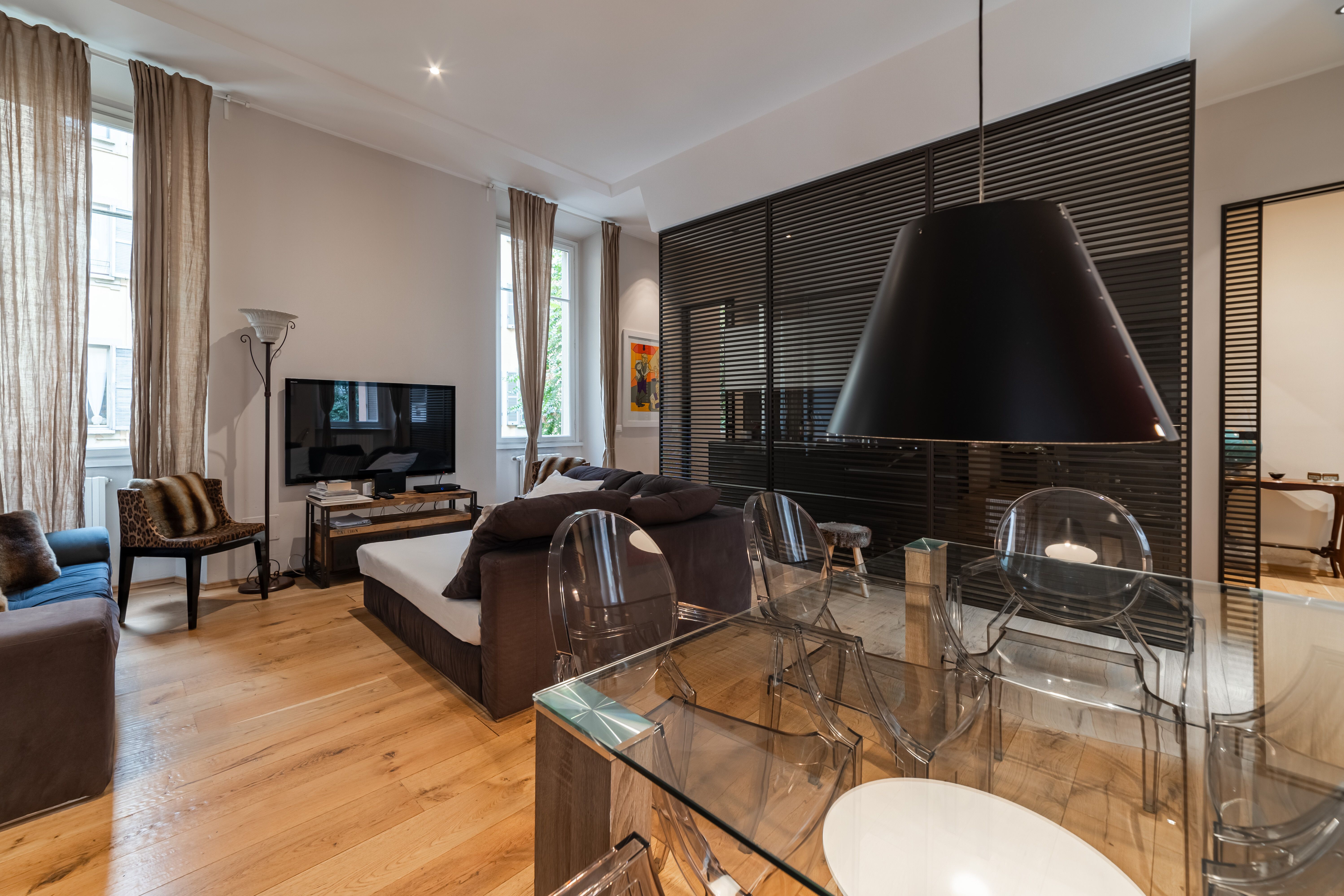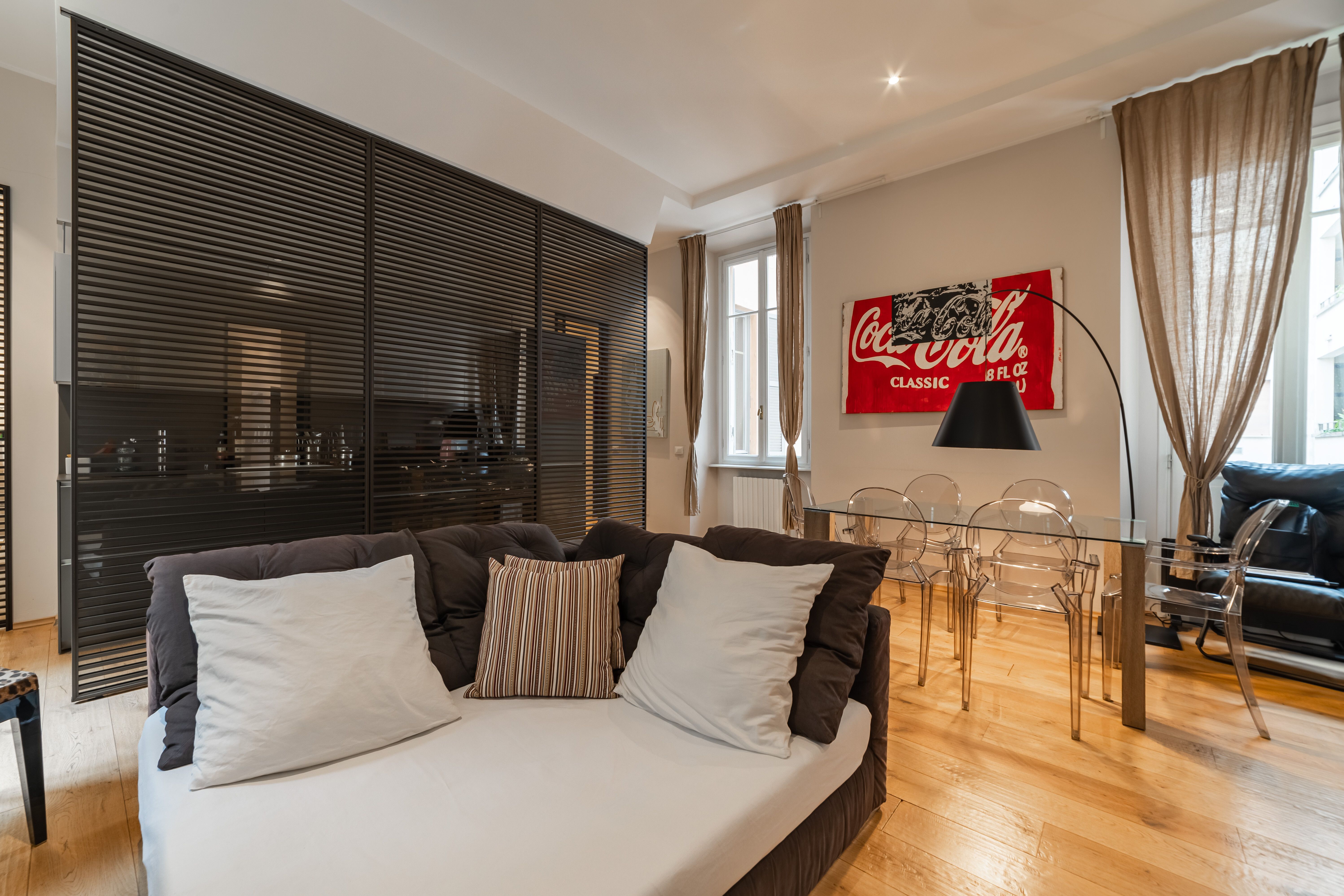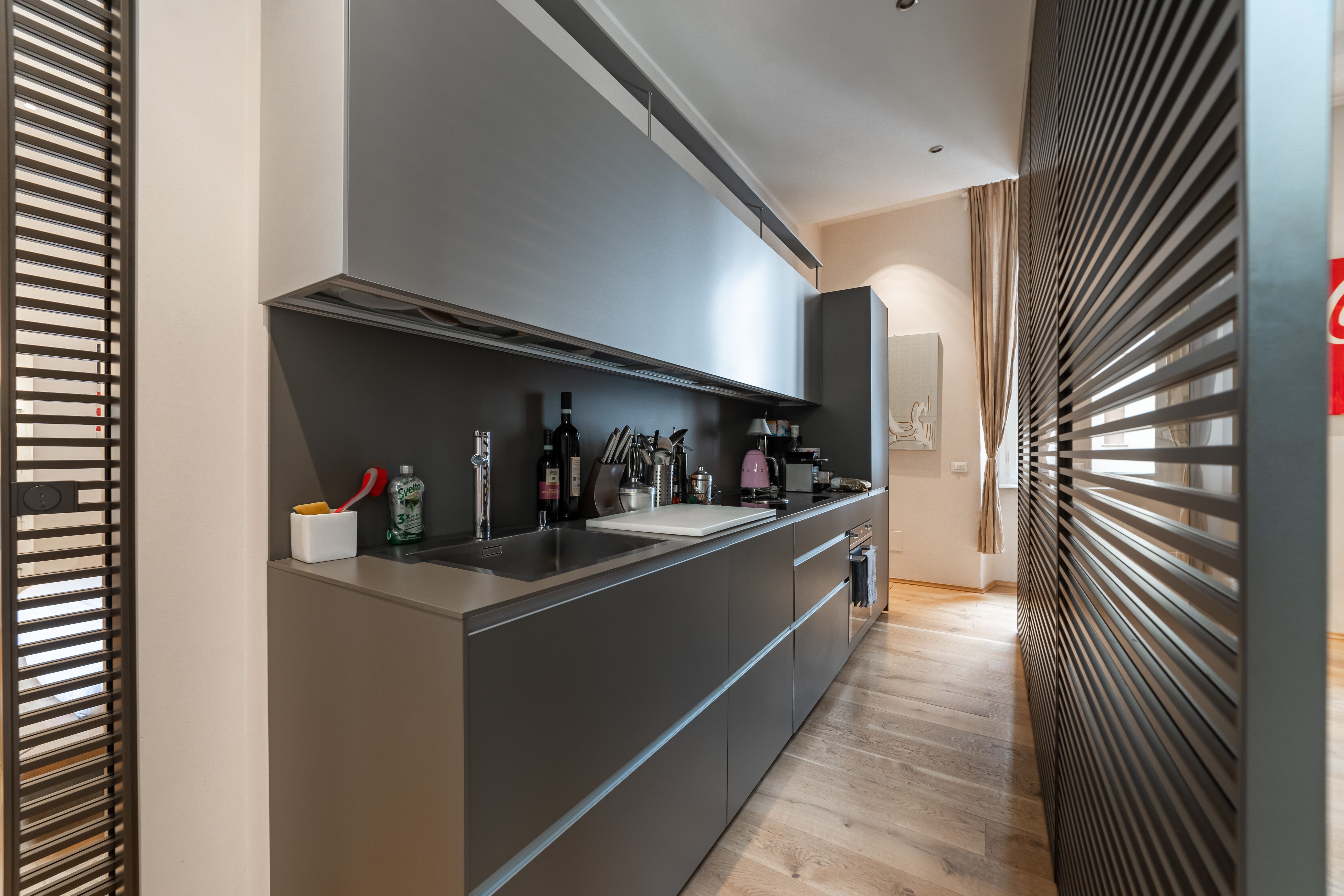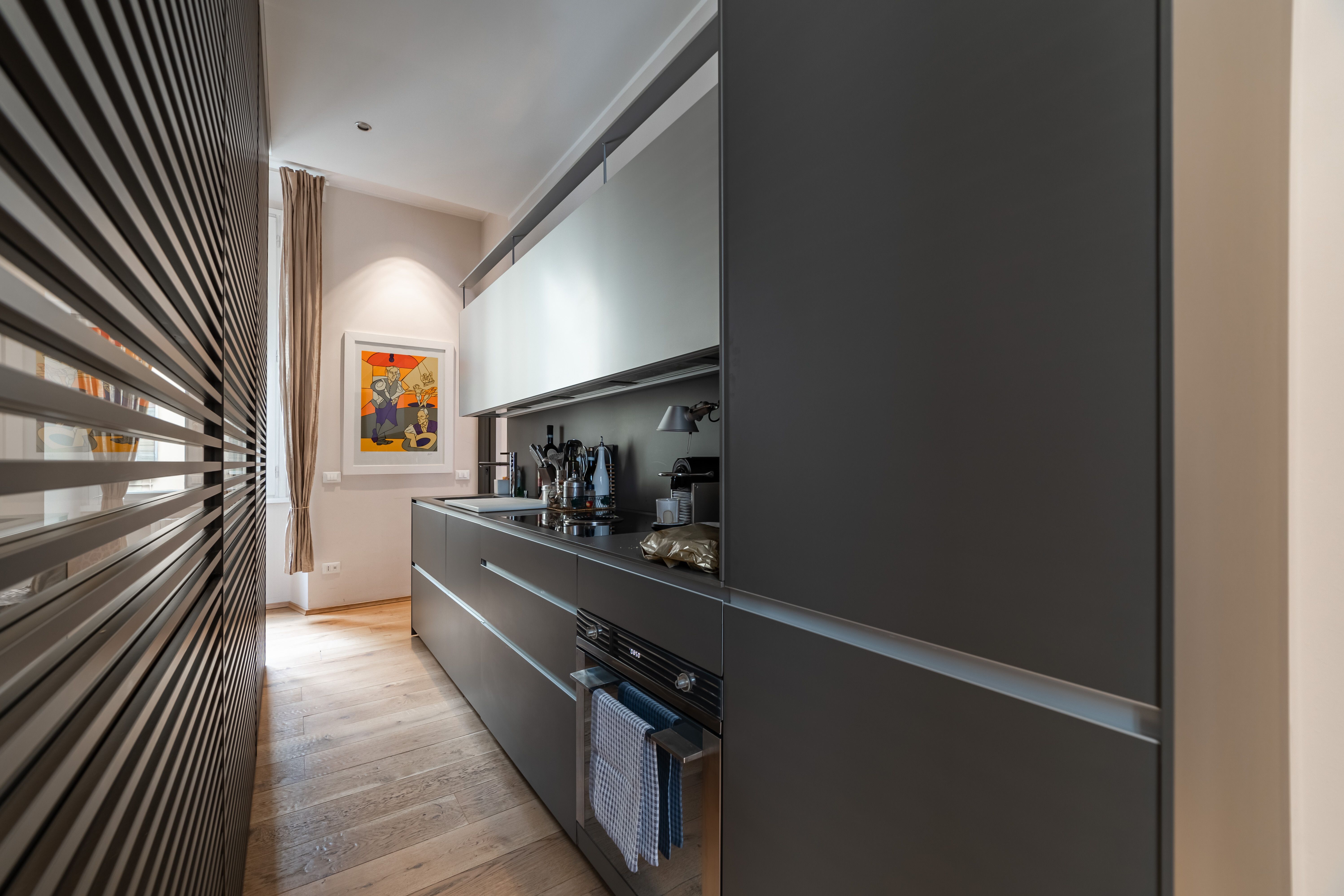 La proprietà, con alti soffitti che richiamano lo stile dell'epoca, è in ottime condizioni ed è composta da un ingresso, un soggiorno, cucina Valcucine nuova completamente attrezzata di tutti gli elettrodomestici e un bagno ospiti.