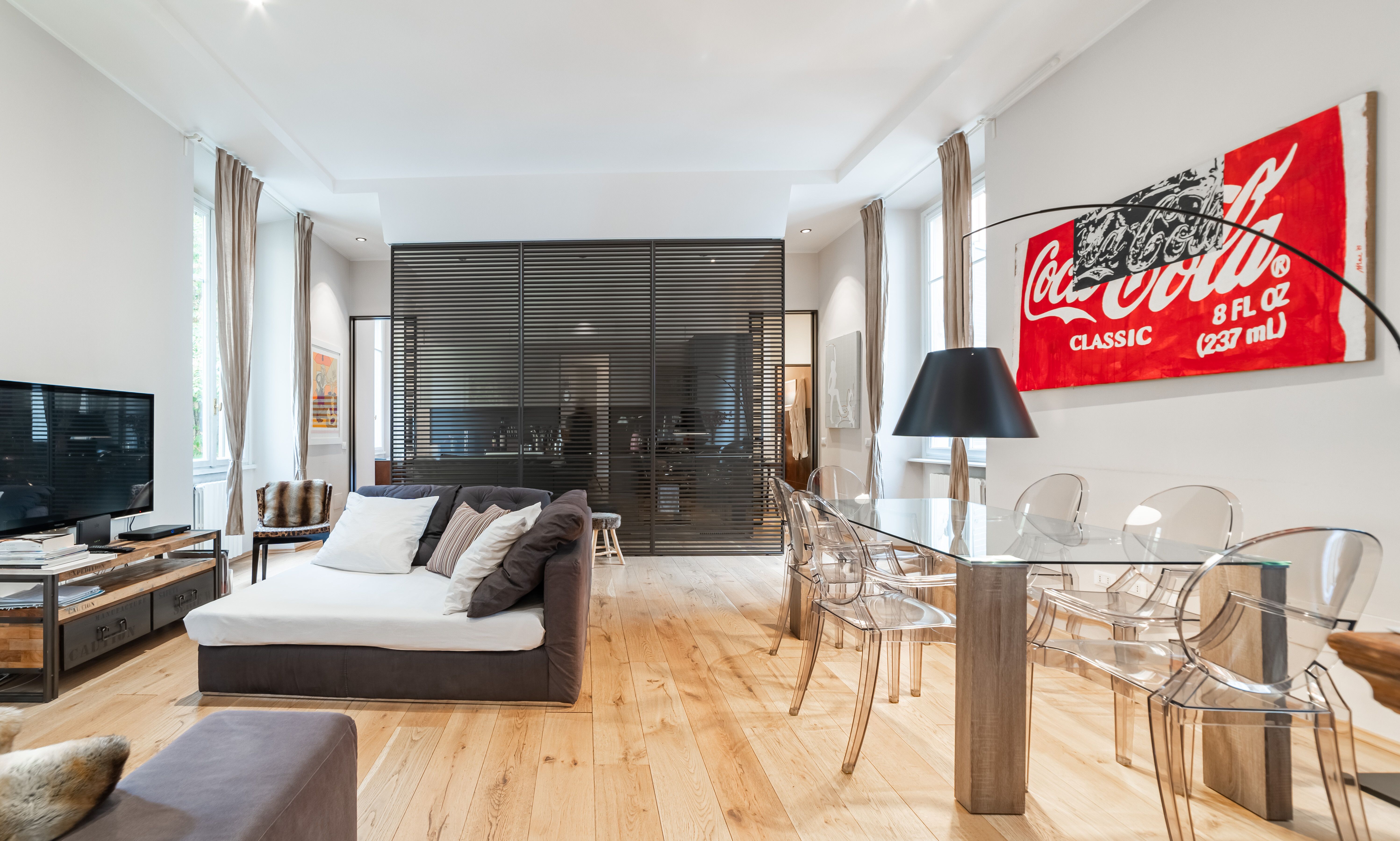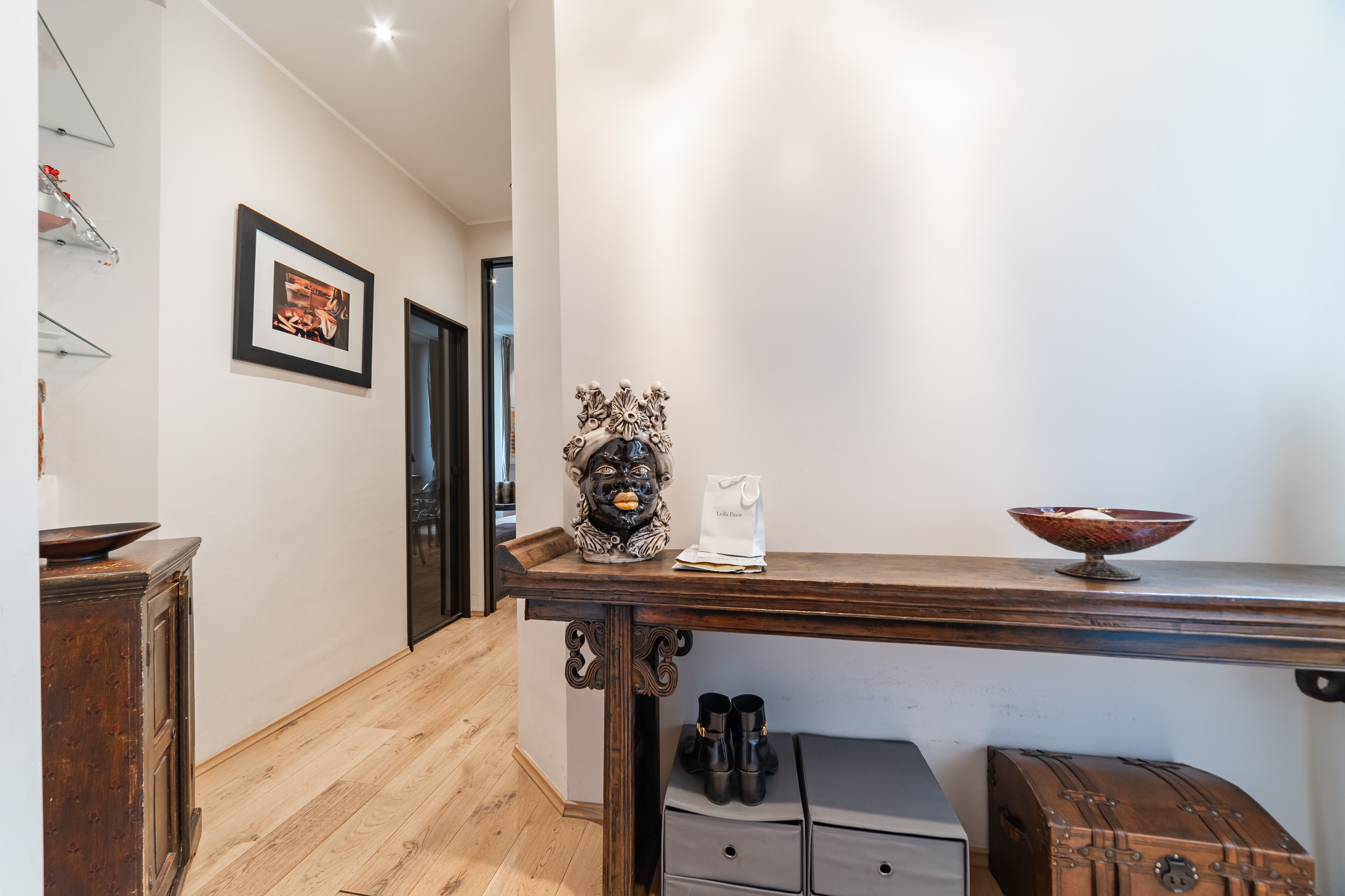 Tutti gli ambienti sono separati da eleganti porte scorrevoli coibentate firmate Rimadesio, così come la scenografica quinta che funge da divisorio per la cucina retrostante; il riscaldamento è autonomo e l'aria condizionata canalizzata; infine, il meraviglioso parquet in rovere, domina tutta la dimora.