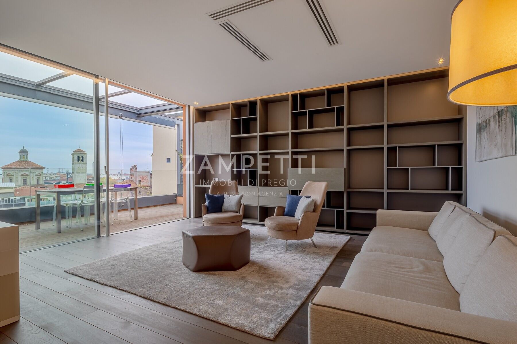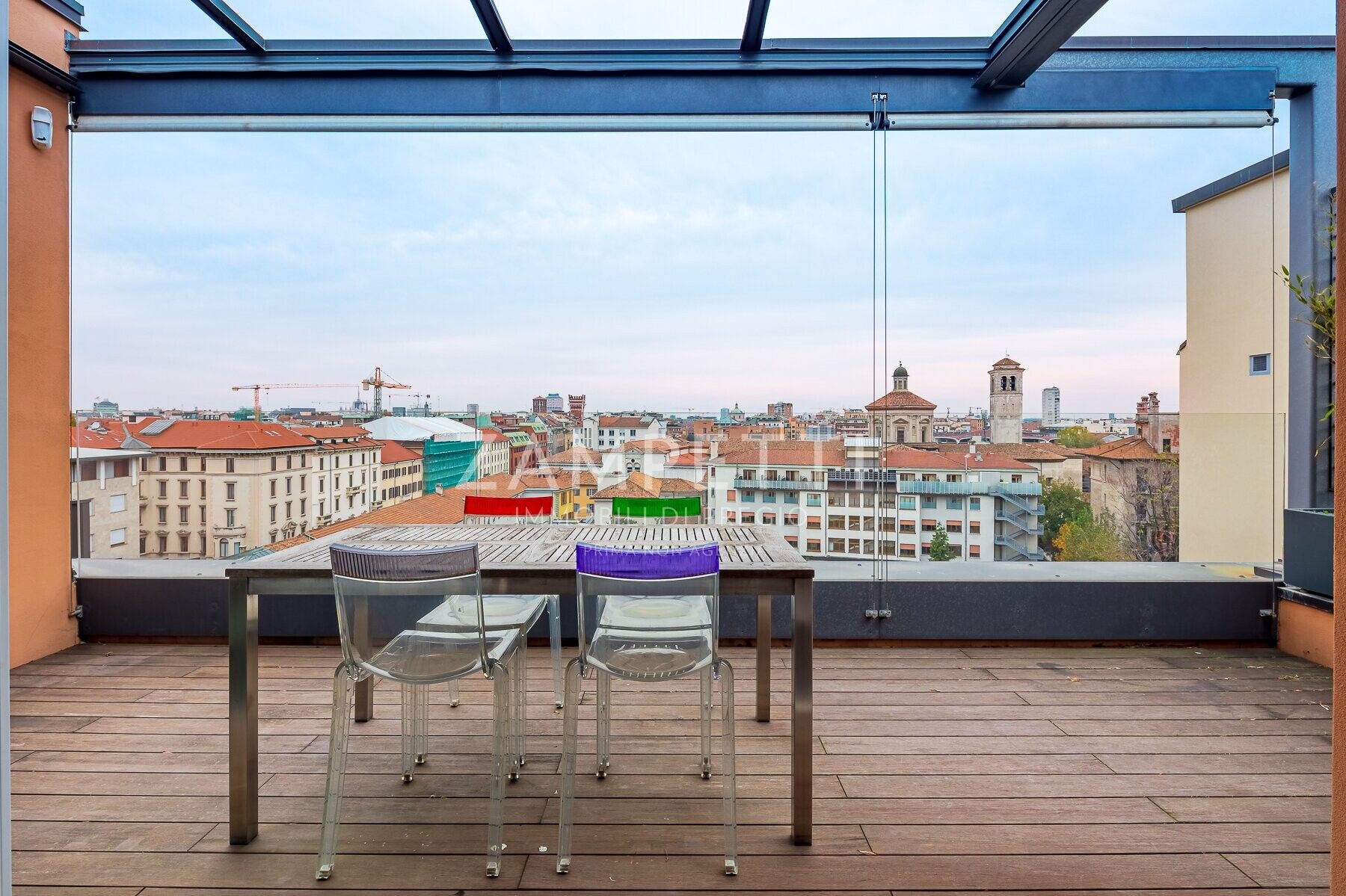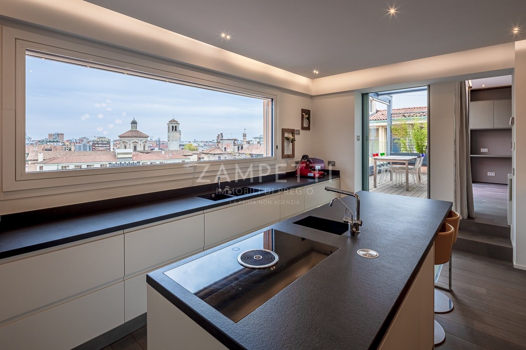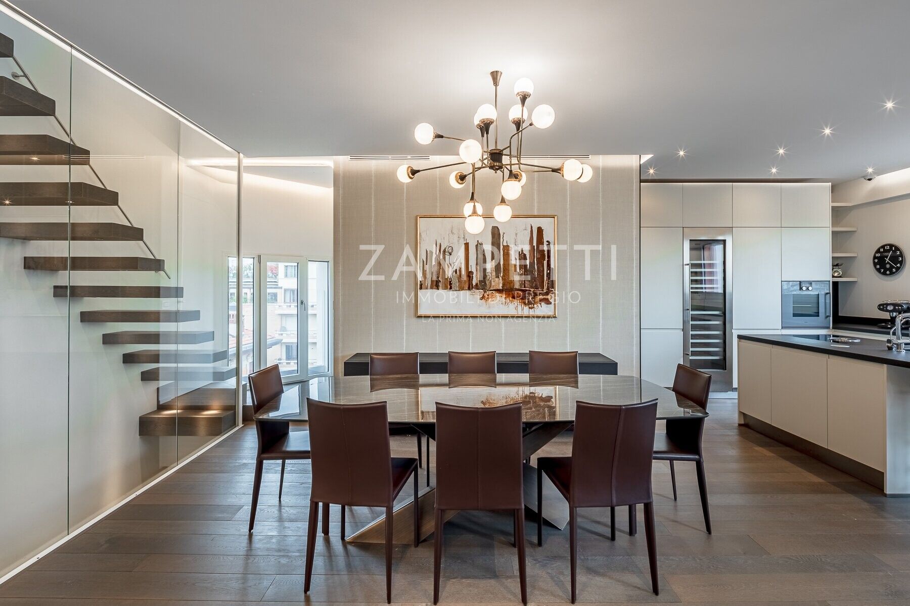 Al sesto piano troviamo una meravigliosa zona giorno con sala da pranzo con camino e ampia cucina e bellissimo soggiorno con accesso diretto al grande terrazzo con spettacolare vista su tutta Milano.