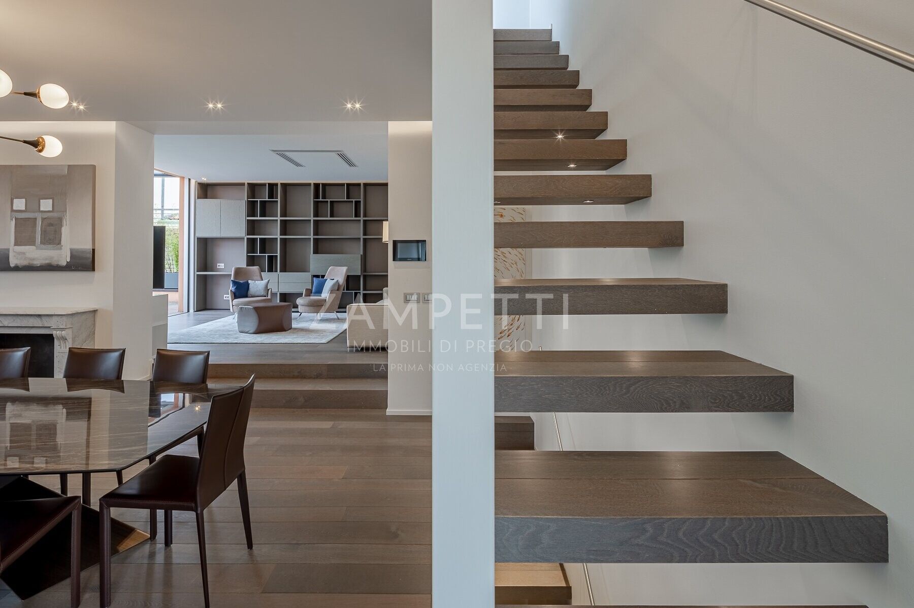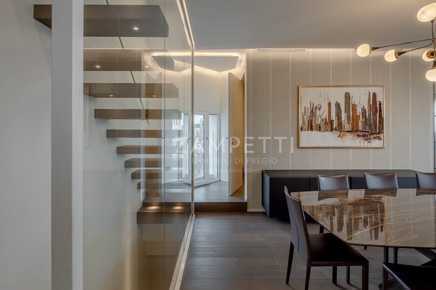 La residenza, totalmente ristrutturata in ottimo stato con finiture di design, è composta al quinto piano da una grande camera matrimoniale con balcone, cabina armadio e bagno e altre due camere da letto con bagno e lavanderia.