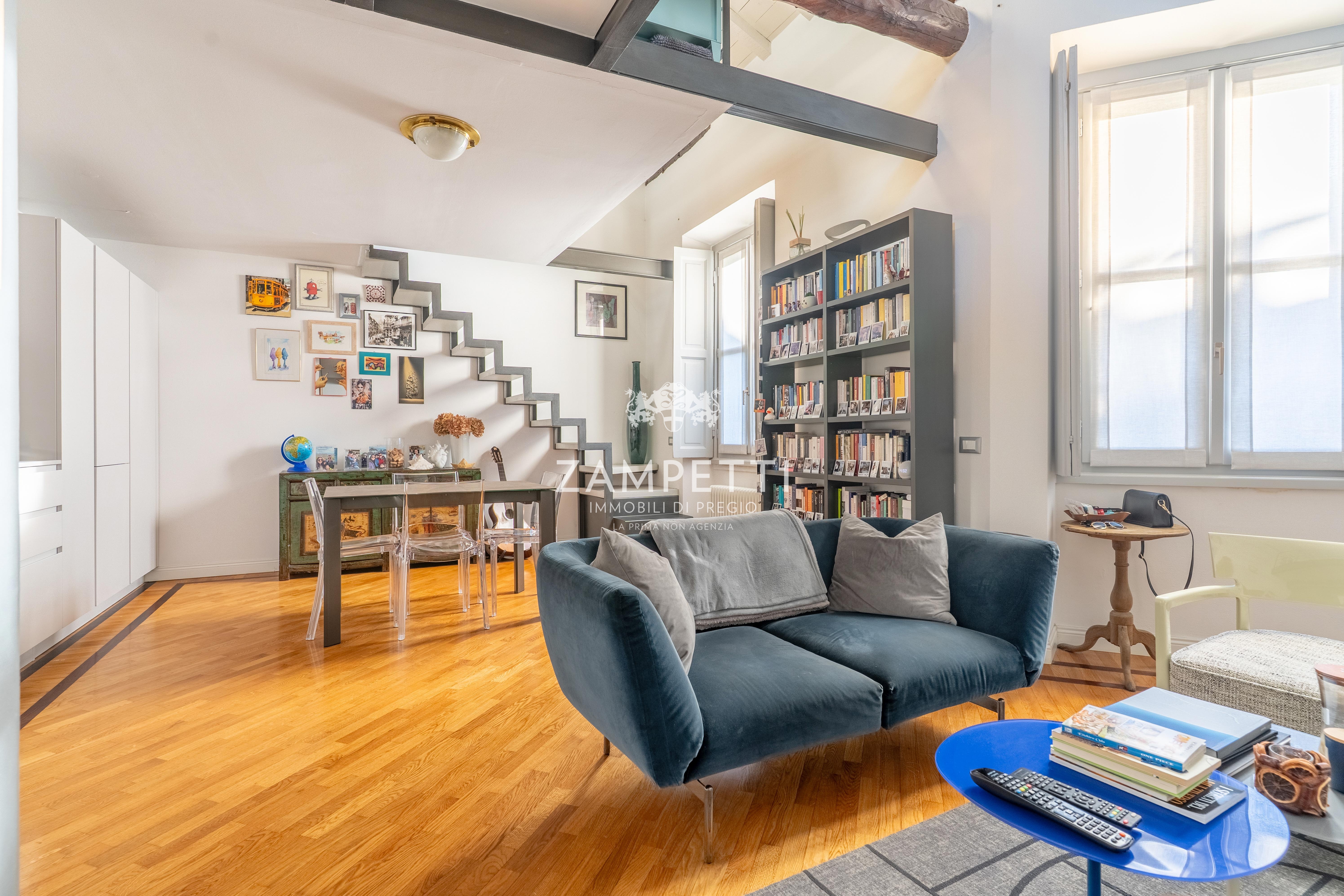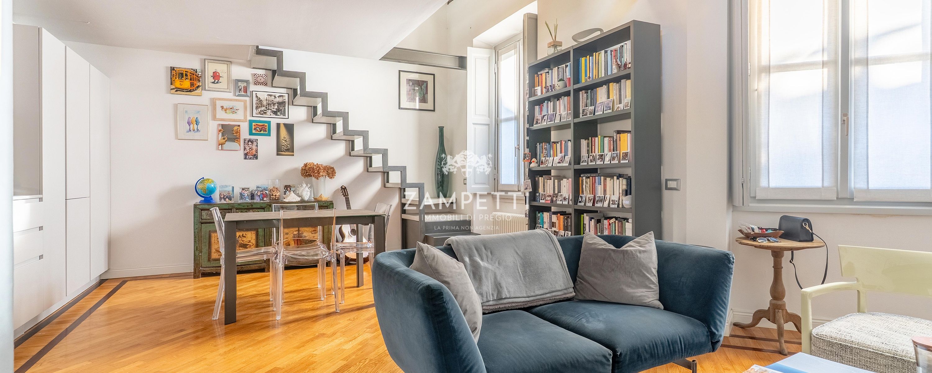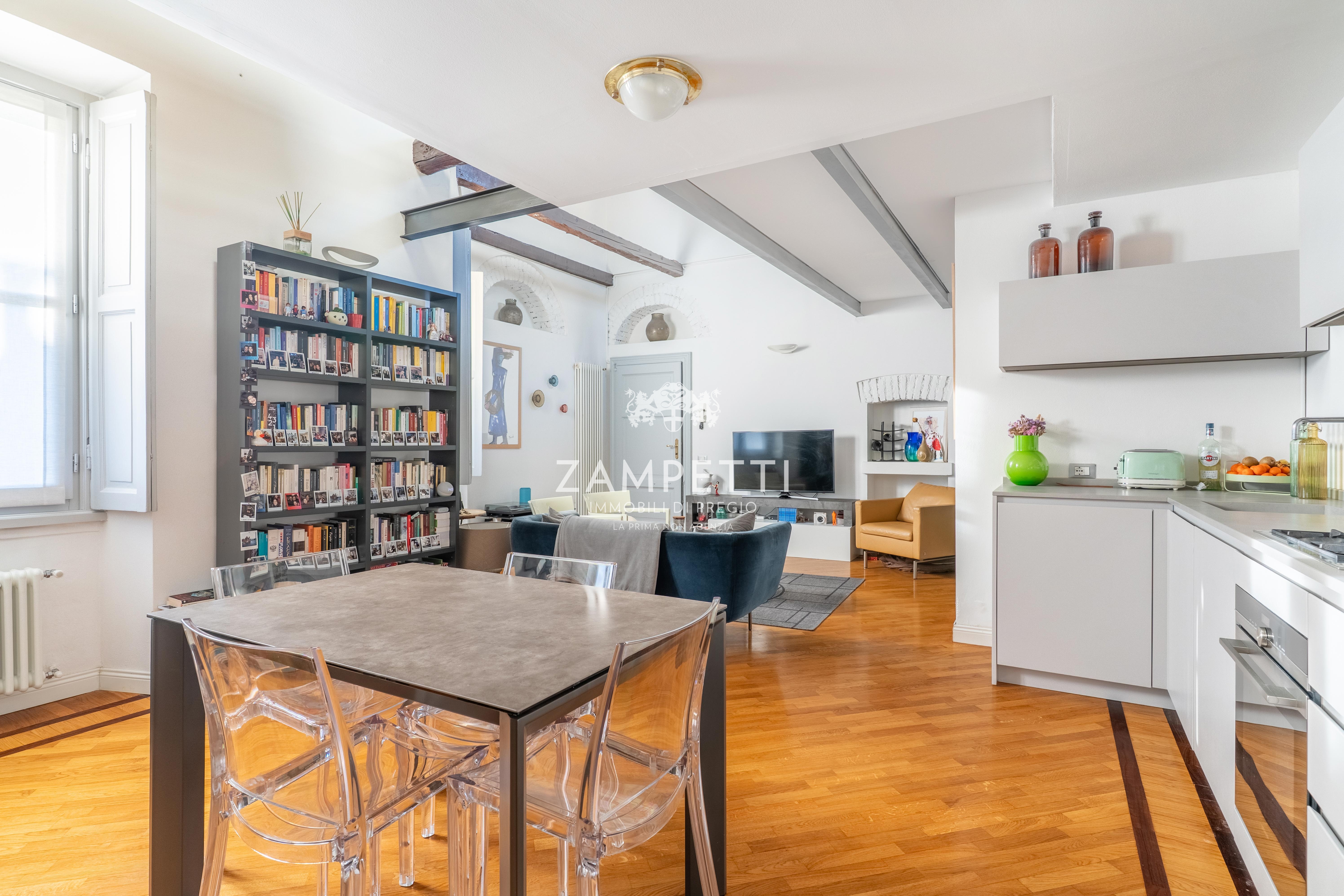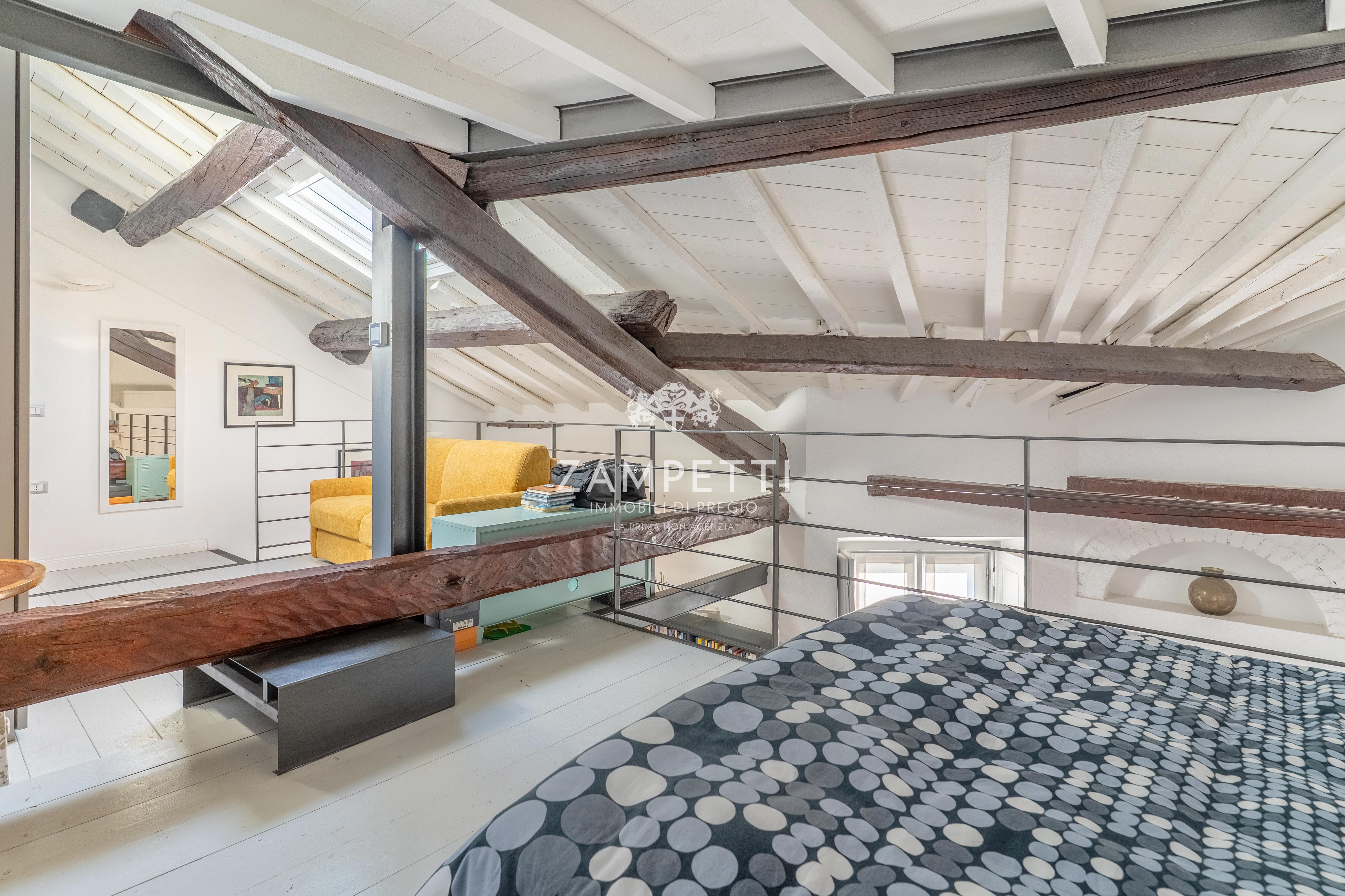 Posta all’ultimo piano e sviluppata su due livelli, la proprietà gode di una silenziosa esposizione interna, che assicura tranquillità e privacy e offre un’atmosfera unica grazie alle travi a vista e a un luminoso living open space con cucina a vista, arricchito da elementi originali di pregio. Il livello principale comprende inoltre un elegante bagno finestrato recentemente ristrutturato. Al piano superiore si trova la camera da letto, affacciata sul living, dotata di ampio spazio per l’armadiatura e caratterizzata da un raffinato senso di continuità degli ambienti.