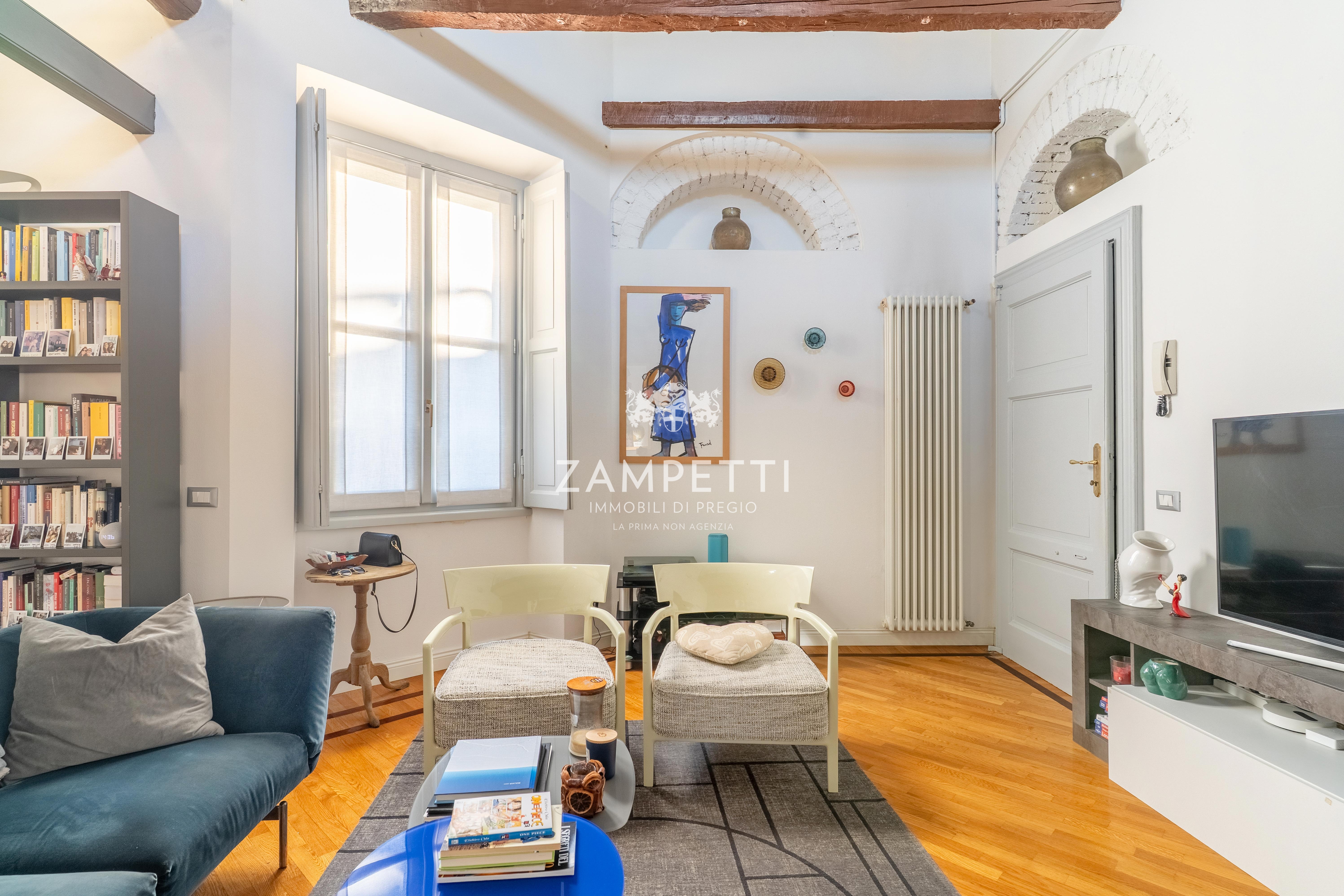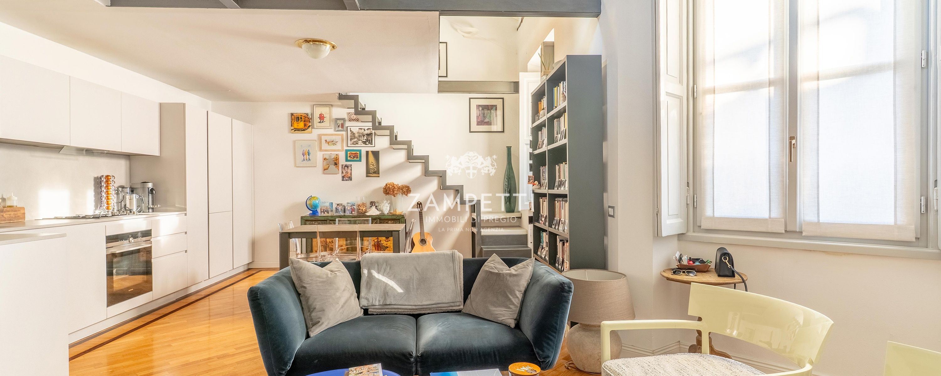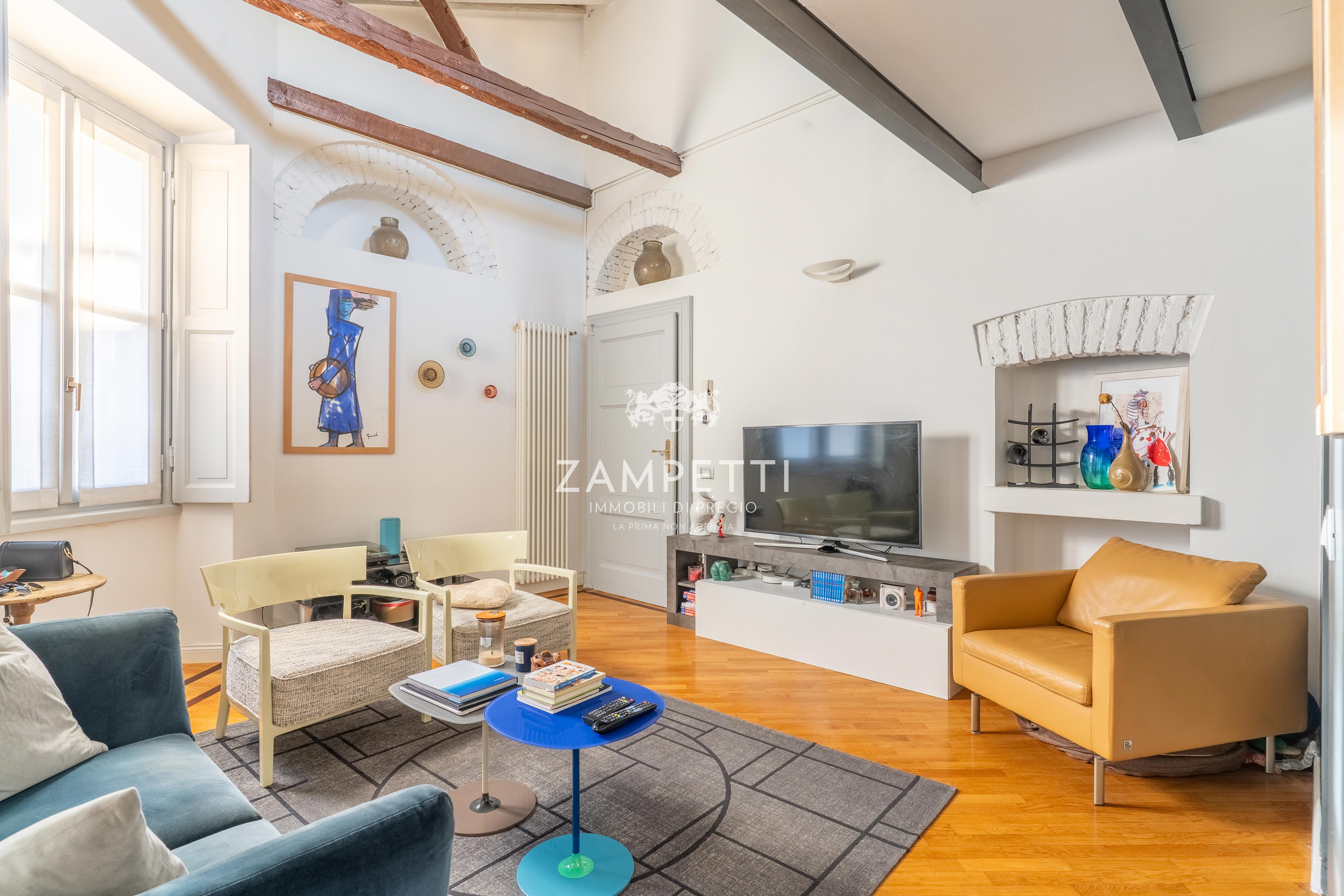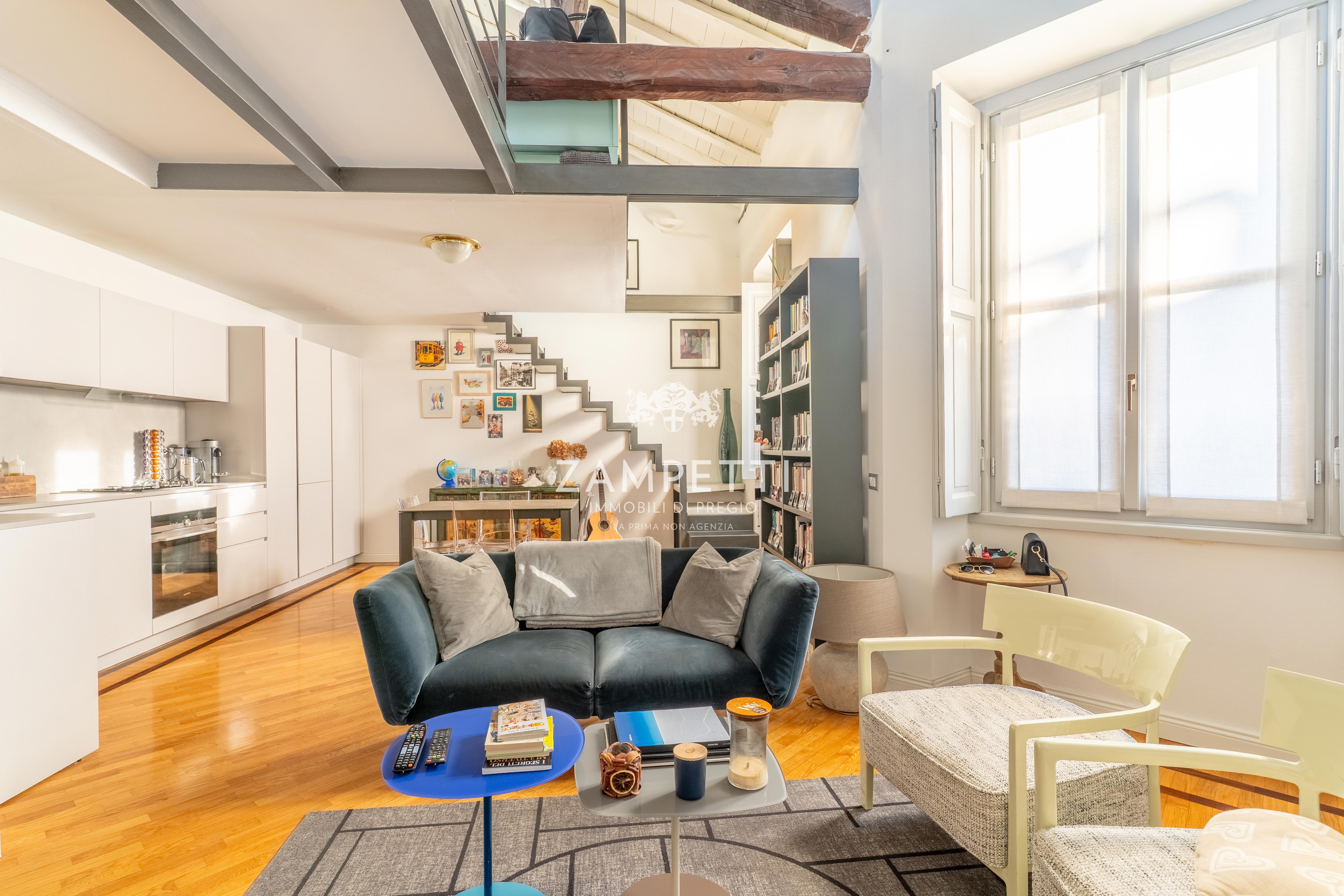 Posta all’ultimo piano e sviluppata su due livelli, la proprietà gode di una silenziosa esposizione interna, che assicura tranquillità e privacy e offre un’atmosfera unica grazie alle travi a vista e a un luminoso living open space con cucina a vista, arricchito da elementi originali di pregio. Il livello principale comprende inoltre un elegante bagno finestrato recentemente ristrutturato. Al piano superiore si trova la camera da letto, affacciata sul living, dotata di ampio spazio per l’armadiatura e caratterizzata da un raffinato senso di continuità degli ambienti.