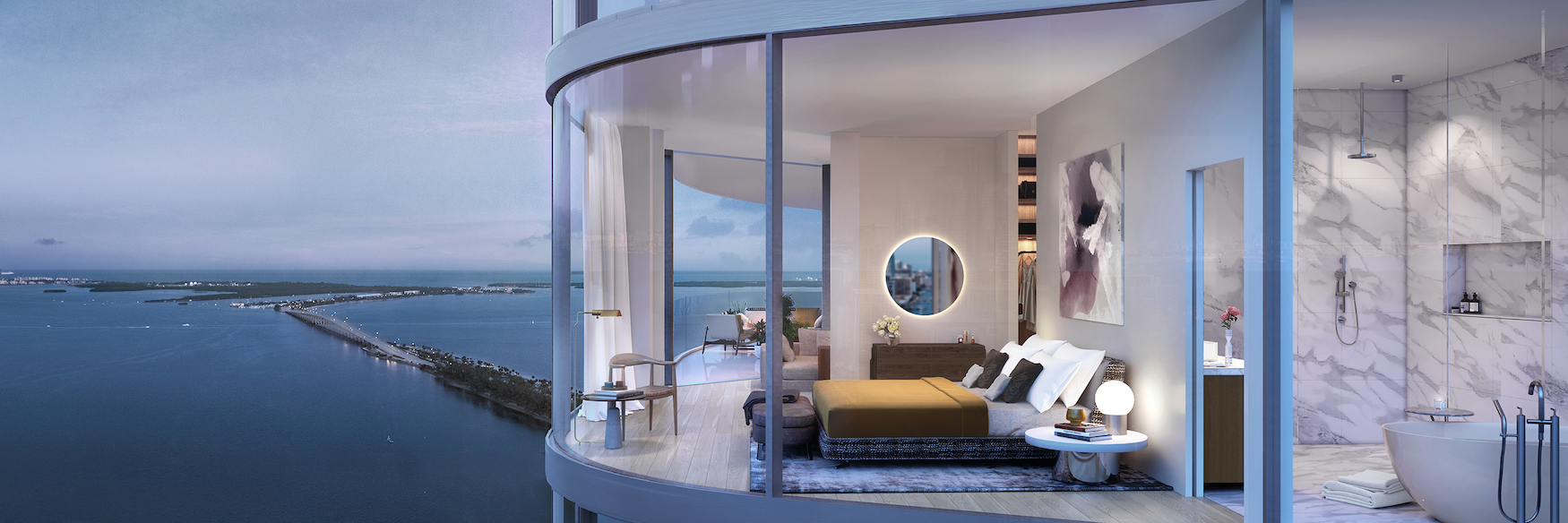 With 135 residences spanning 47 floors, Una is just as dramatic up close as it is from afar.From a distance, the iconic 47-story tower is recognizable by its smooth, light-metallic surface and striking silhouette that recalls the natural shape of a wave. This thoughtful cantilevered detail maximizes views in every direction, from the city skyline to the Atlantic Ocean and Biscayne Bay.